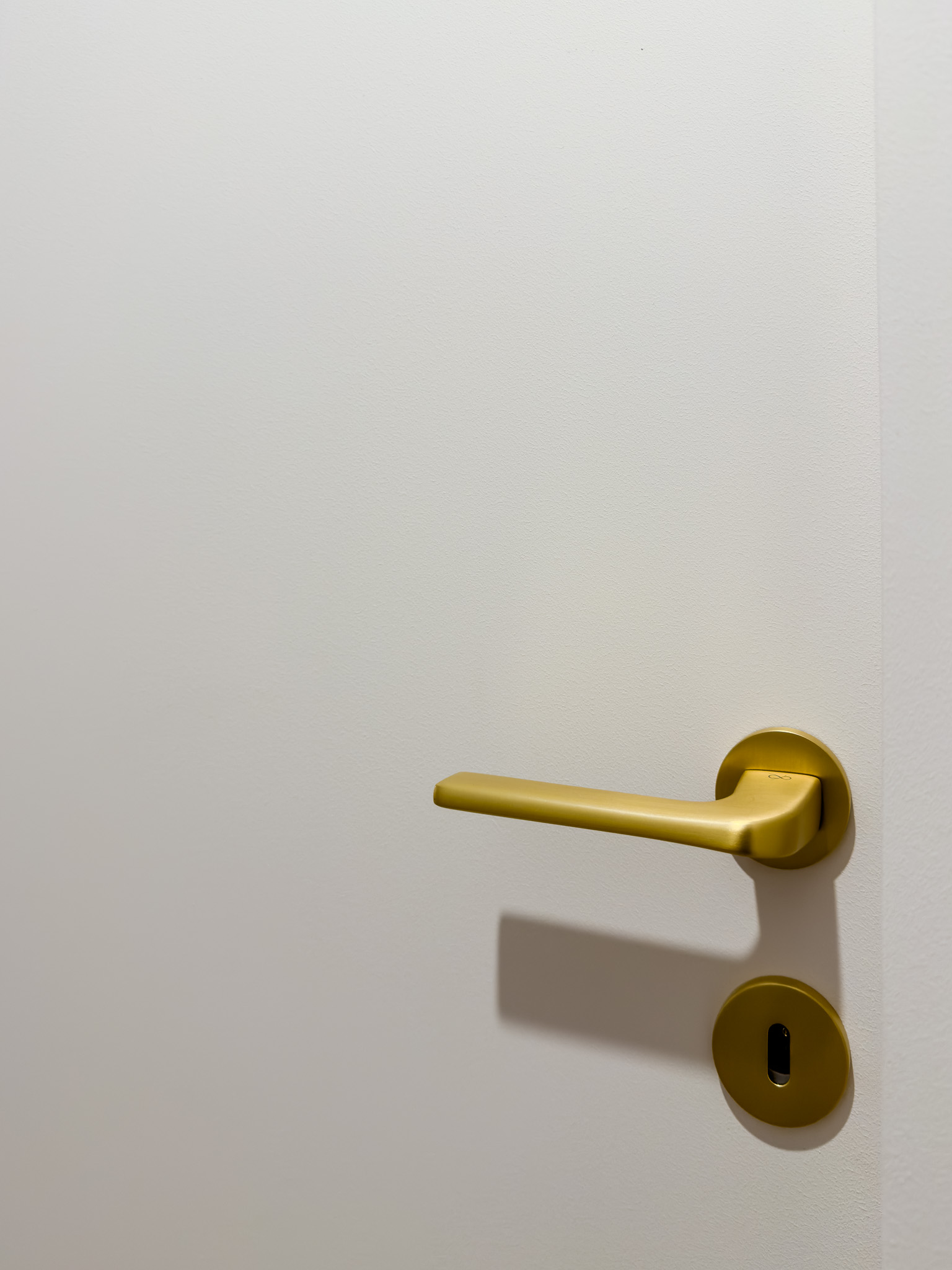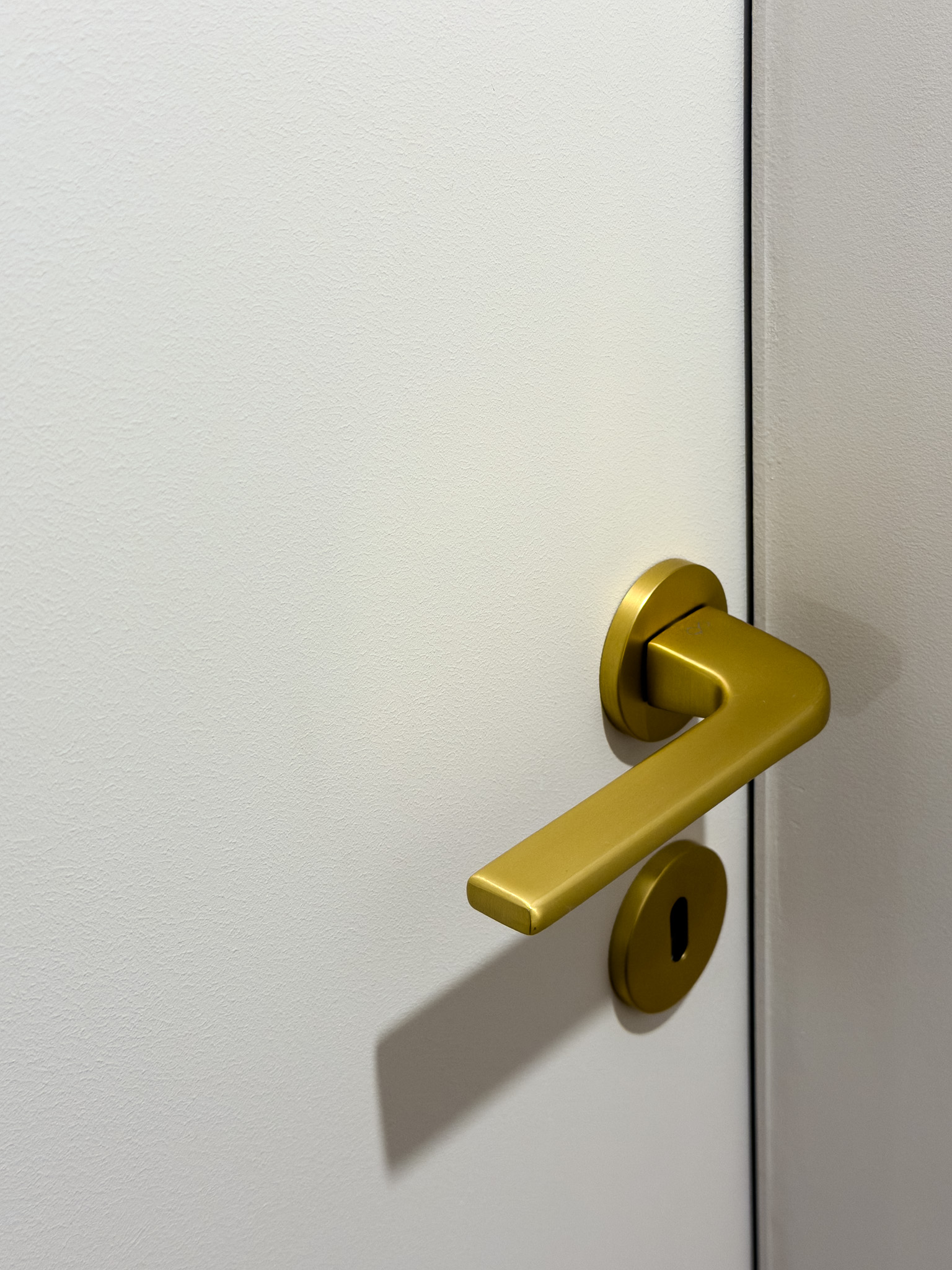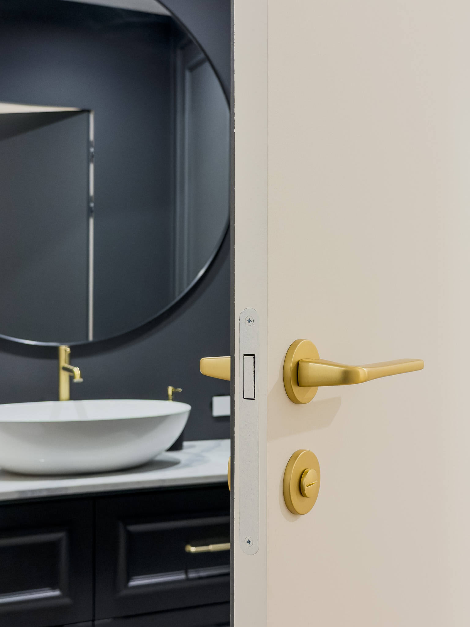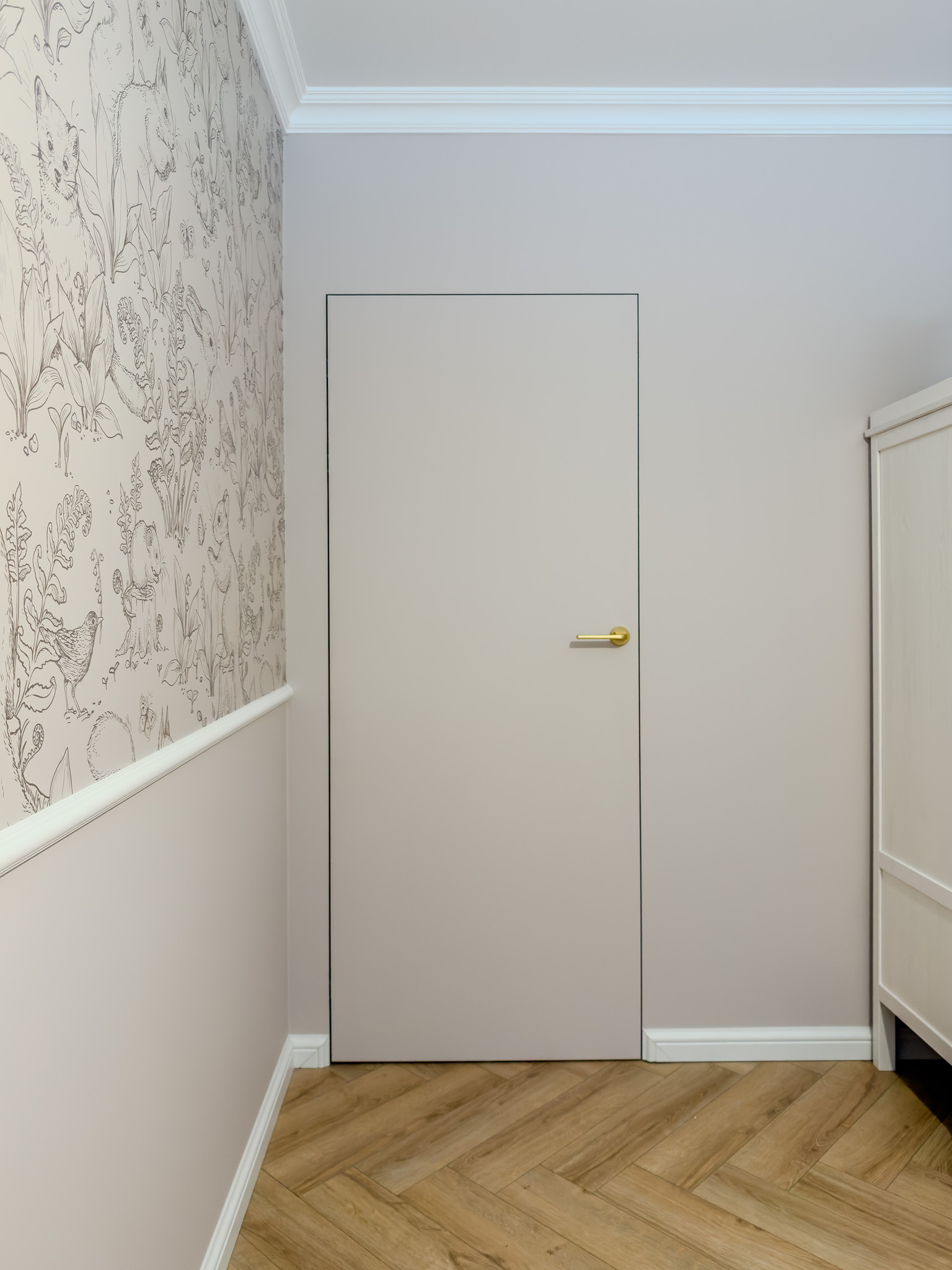 Aby zachować tę czystość formy, zastosowano drzwi ukryte malowane pod kolor ścian. Ten zabieg optycznie powiększa korytarze, a wewnątrz pokoi sprawia, że skrzydła niemal znikają z pola widzenia, tworząc gładkie płaszczyzny. Przemyślanym detalem są drzwi do toalety, malowane dwustronnie w różnych kolorach. Pozwala to na idealne dopasowanie skrzydła do odmiennych aranżacji obu pomieszczeń, bez wprowadzania stylistycznego chaosu w strefie komunikacji.