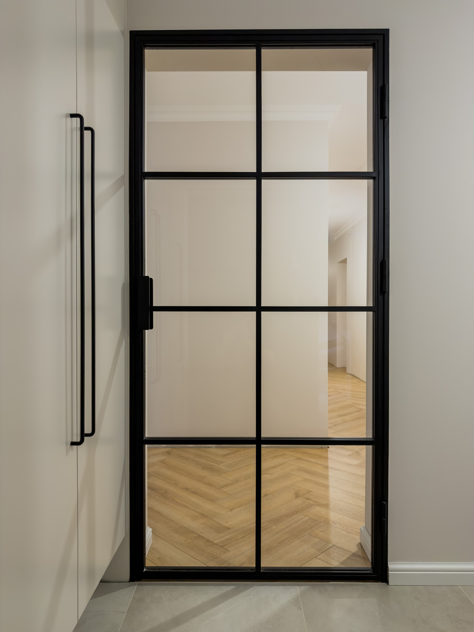 Zastosowanie tego samego wzoru w salonie, kuchni, pokojach oraz korytarzach eliminuje zbędne progi i podziały wizualne. Kontynuację tej przejrzystości stanowią przeszklone drzwi loftowi w wiatrołapie, które doświetlają wnętrze i nadają lekkości.