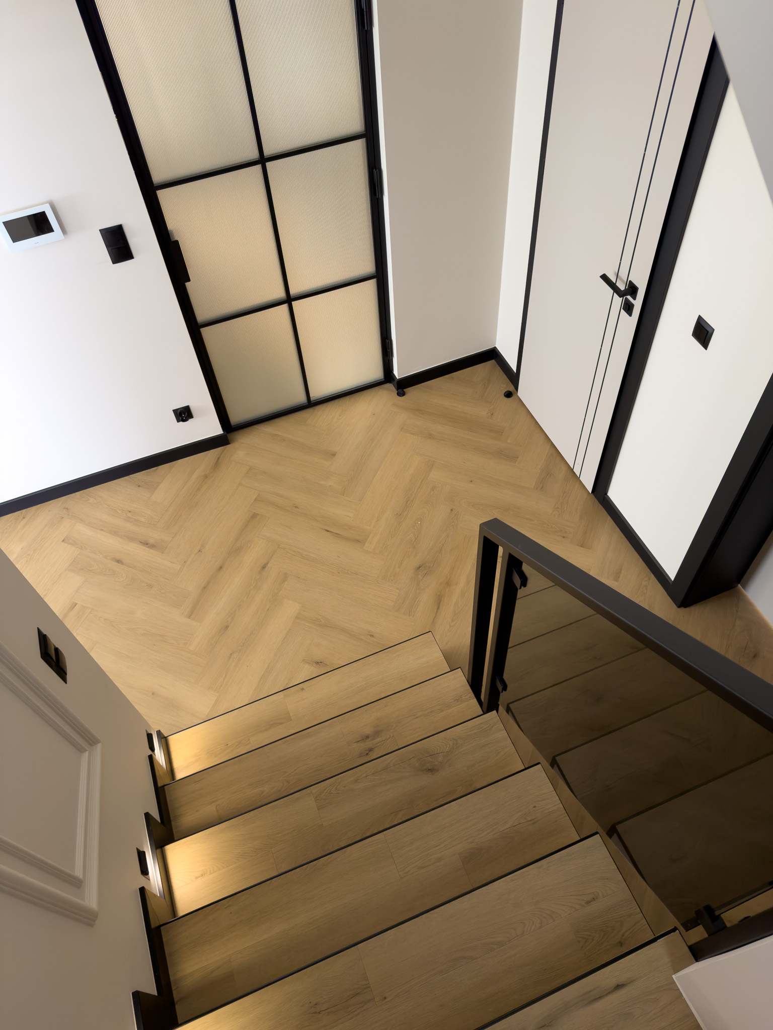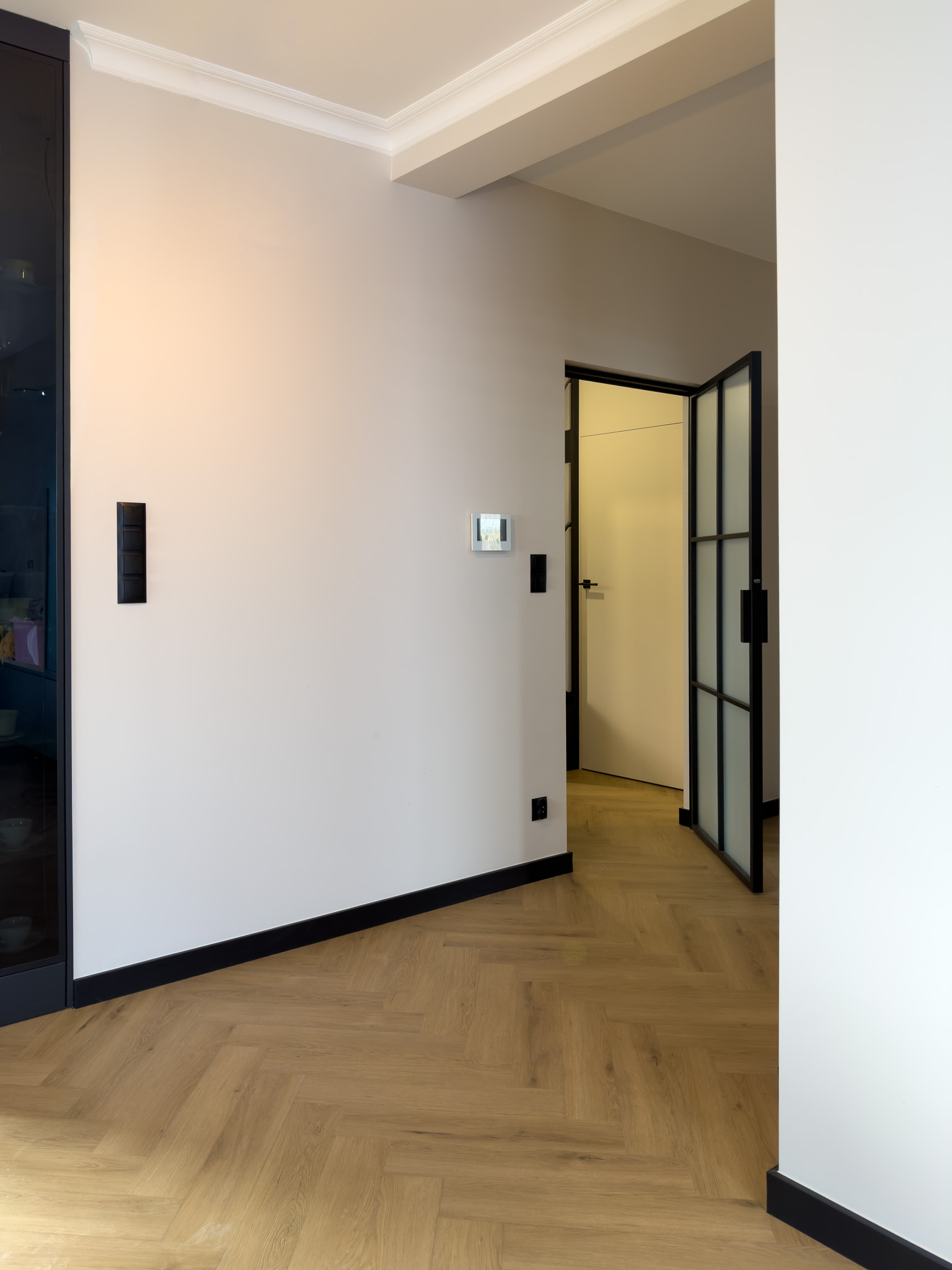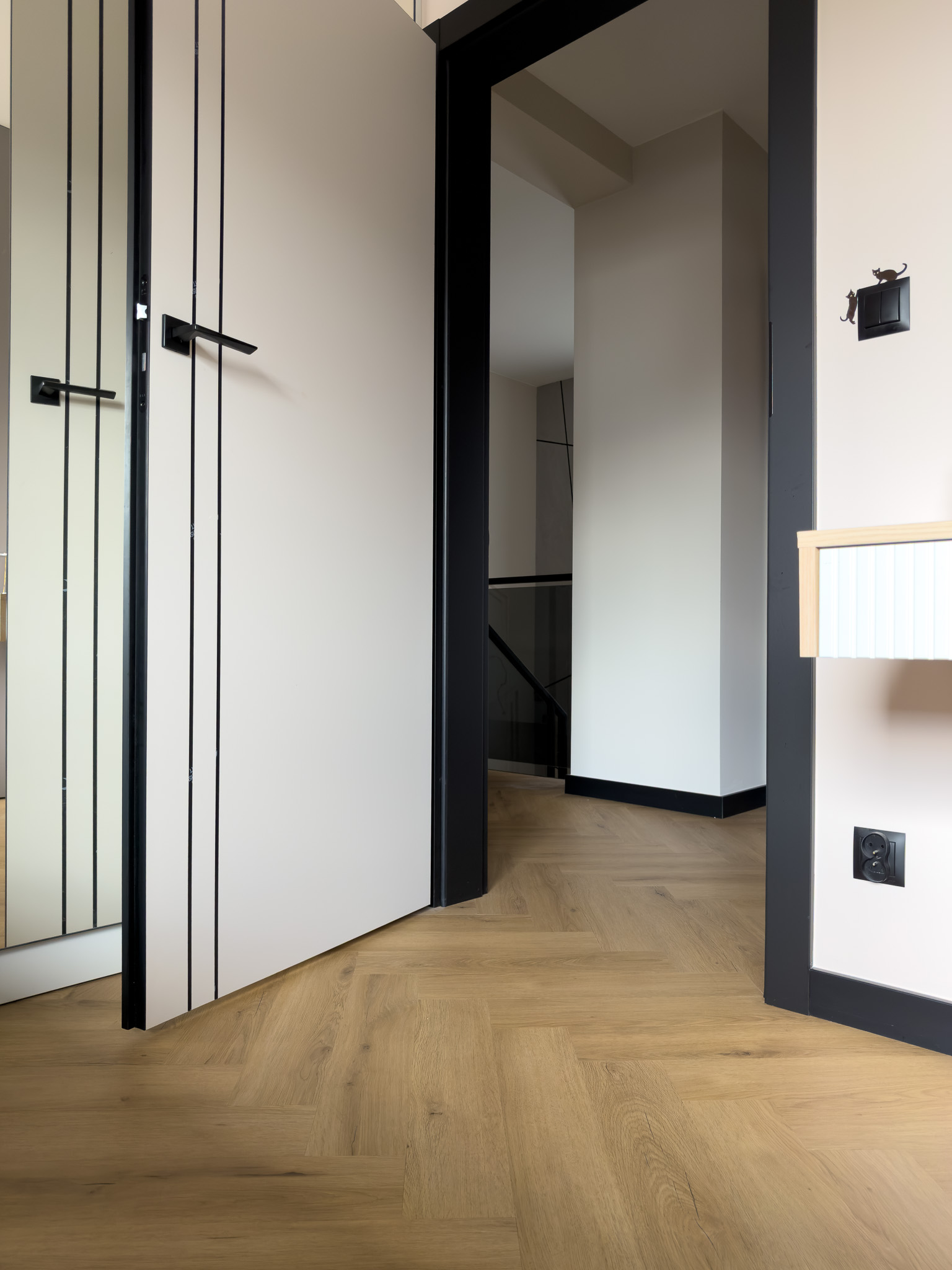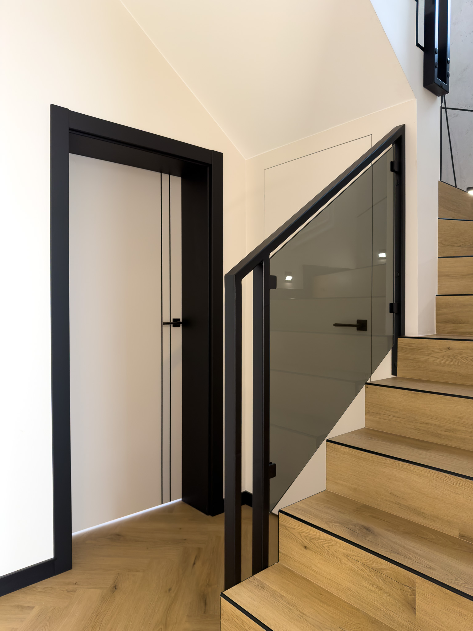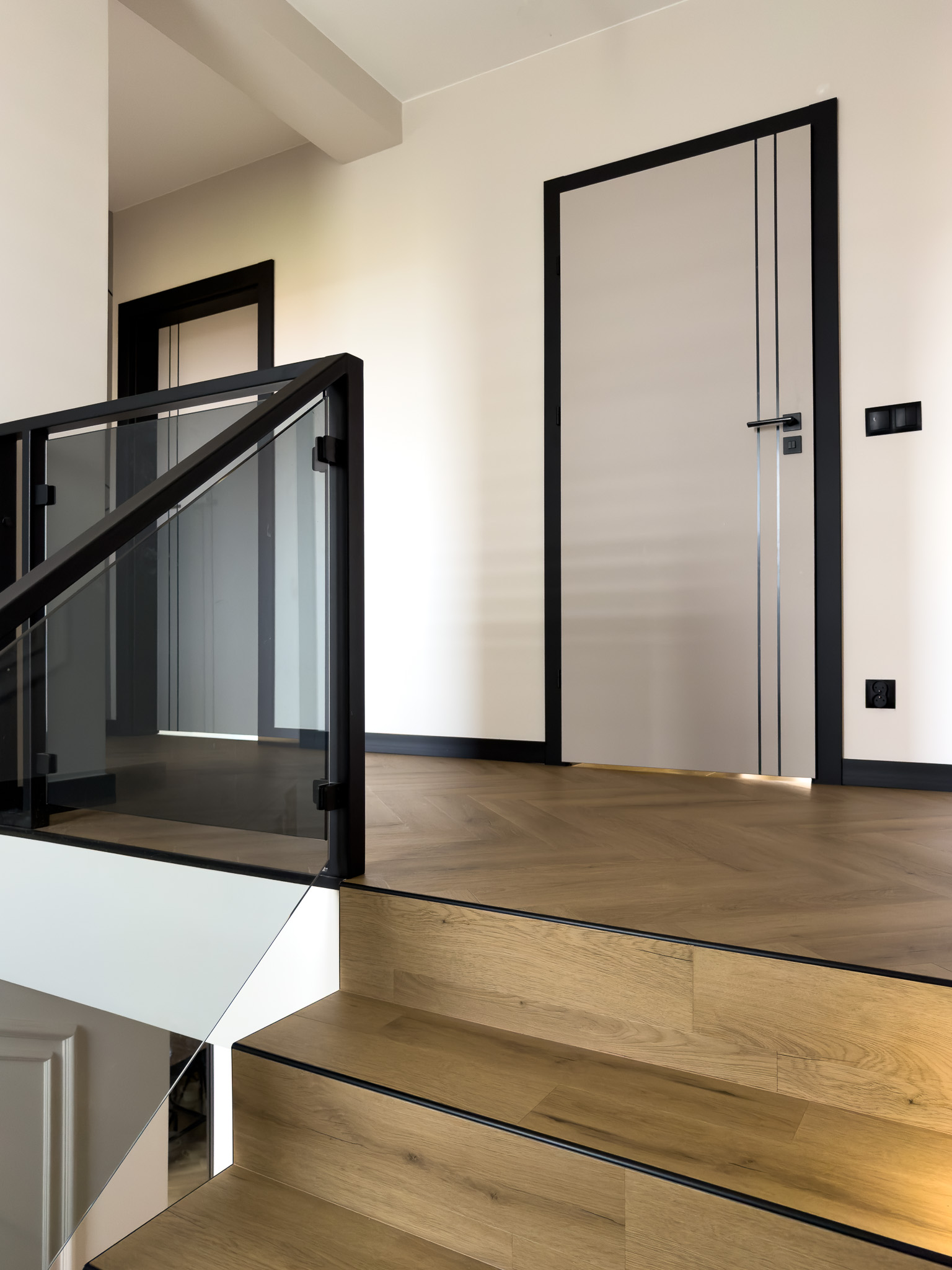 Czarne ościeżnice drzwi i pionowe intarsje na skrzydłach. Geometryczne podziały na betonowej ścianie przy schodach. Klasyczna jodełka na podłodze, która jest niczym innym jak zbiorem przecinających się linii. Otwarta przestrzeń. Brak dylatacji, czyli linii podziału pomiędzy pomieszczeniami. Drzwi ukryte w miejscu, gdzie minimalistyczny akcent porządkuje przestrzeń. Czarne noski na schodach będące dodatkowym elementem graficznym. Szklane drzwi do wiatrołapu w linie pionowe, podobnie jak fronty meblowe.