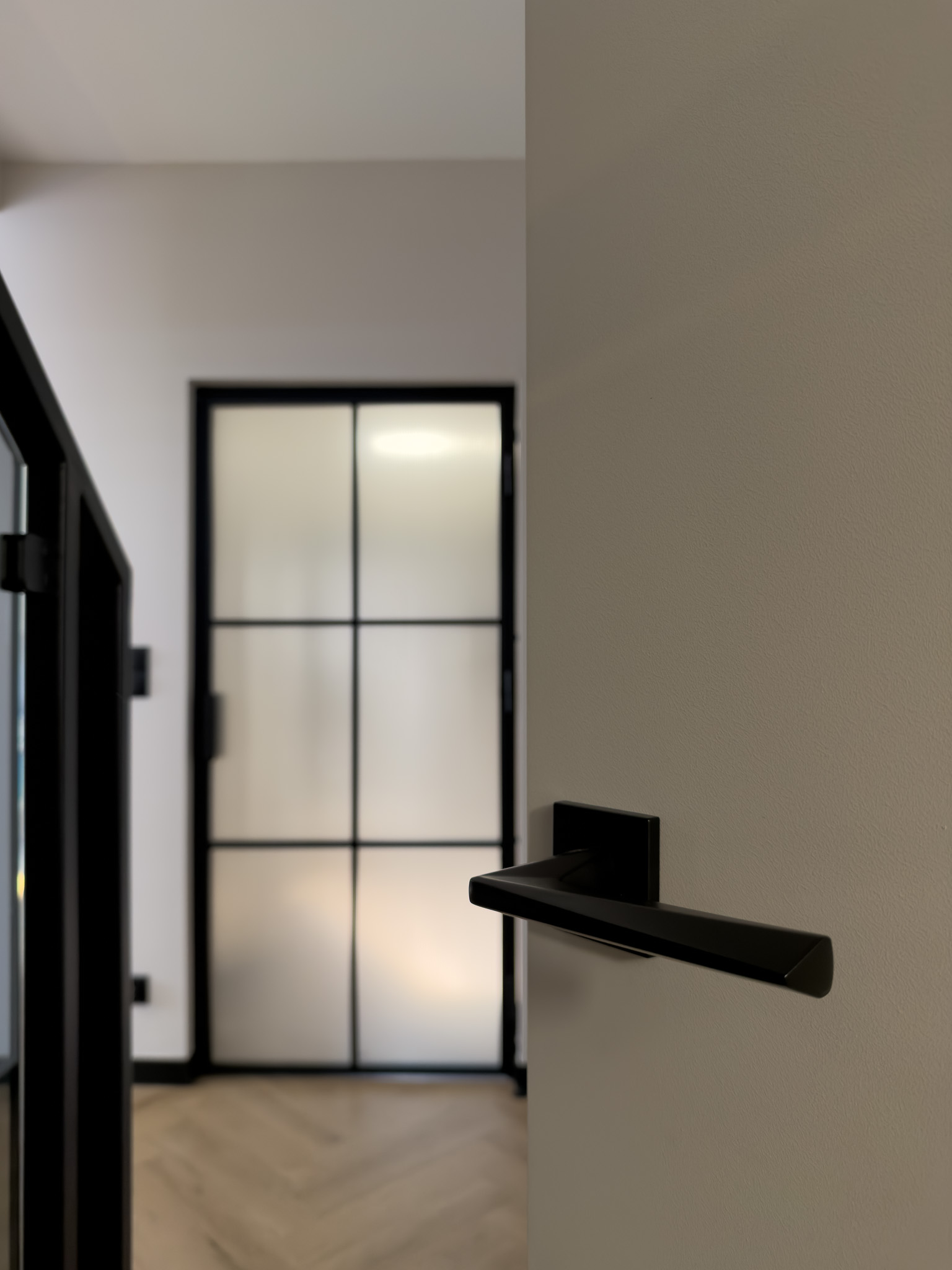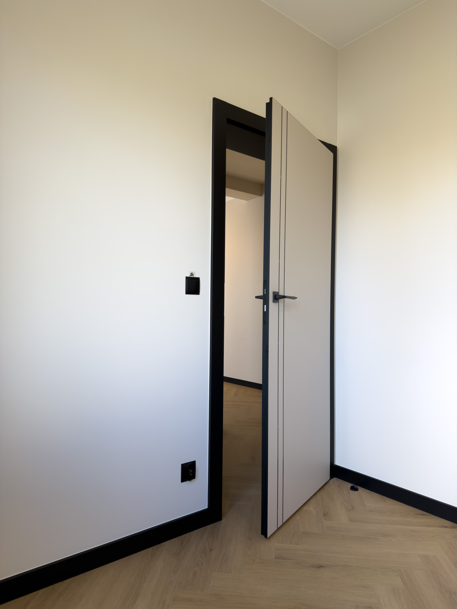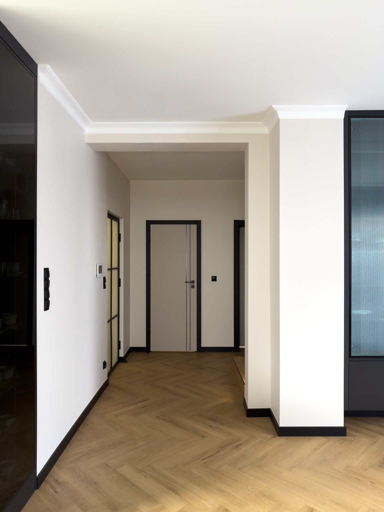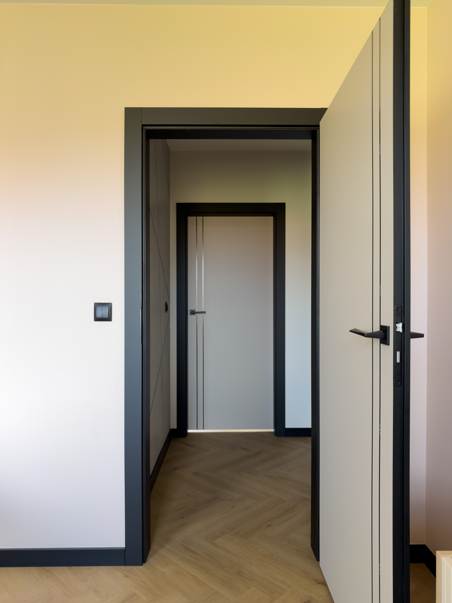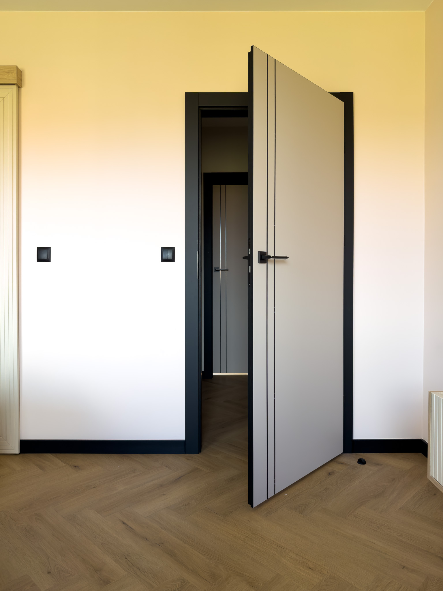 Czarne ościeżnice drzwi i pionowe intarsje na skrzydłach. Geometryczne podziały na betonowej ścianie przy schodach. Klasyczna jodełka na podłodze, która jest niczym innym jak zbiorem przecinających się linii. Otwarta przestrzeń. Brak dylatacji, czyli linii podziału pomiędzy pomieszczeniami. Drzwi ukryte w miejscu, gdzie minimalistyczny akcent porządkuje przestrzeń. Czarne noski na schodach będące dodatkowym elementem graficznym. Szklane drzwi do wiatrołapu w linie pionowe, podobnie jak fronty meblowe.