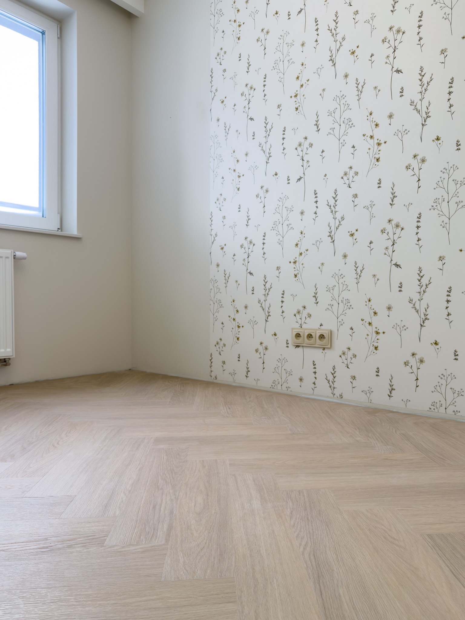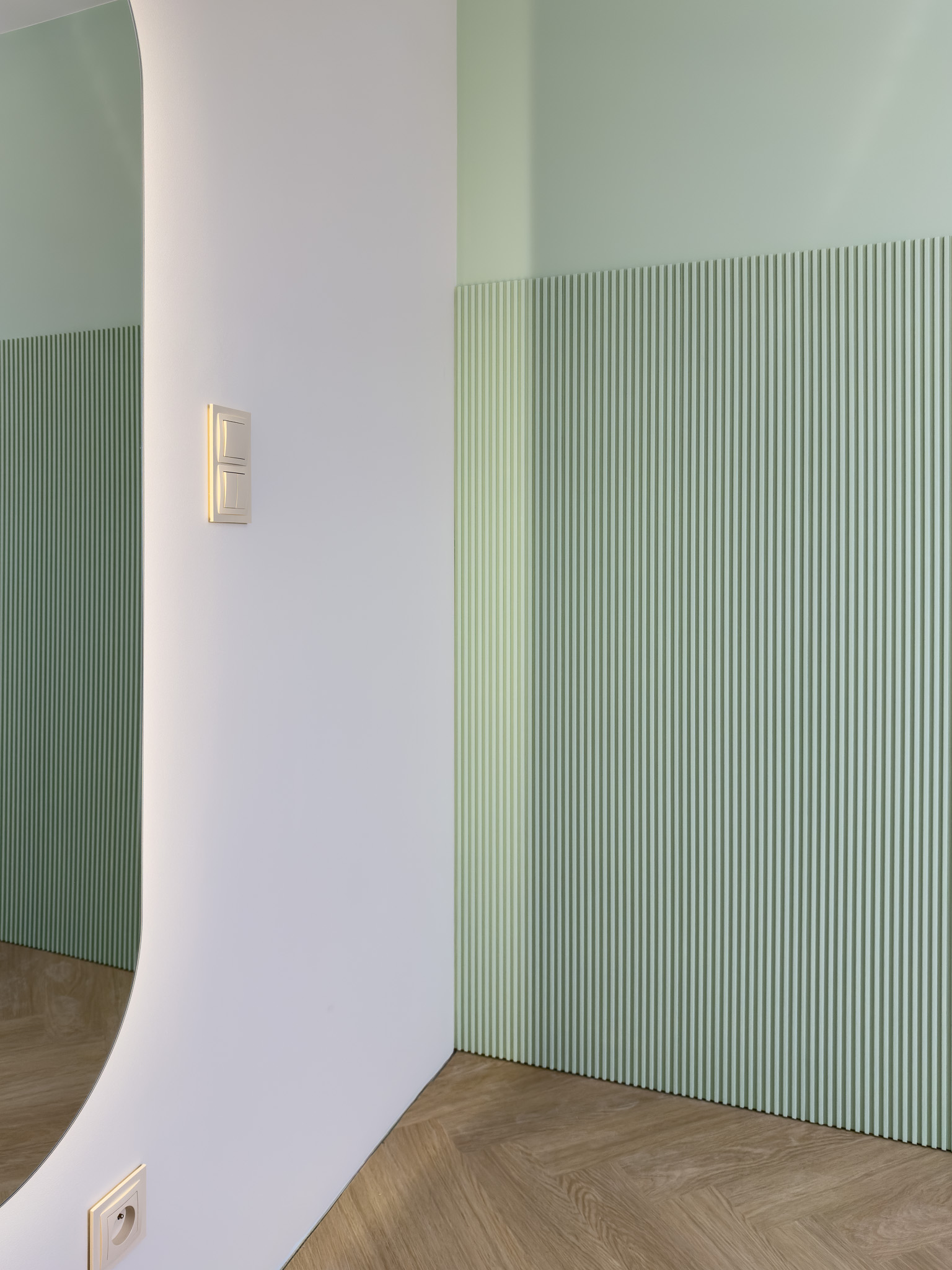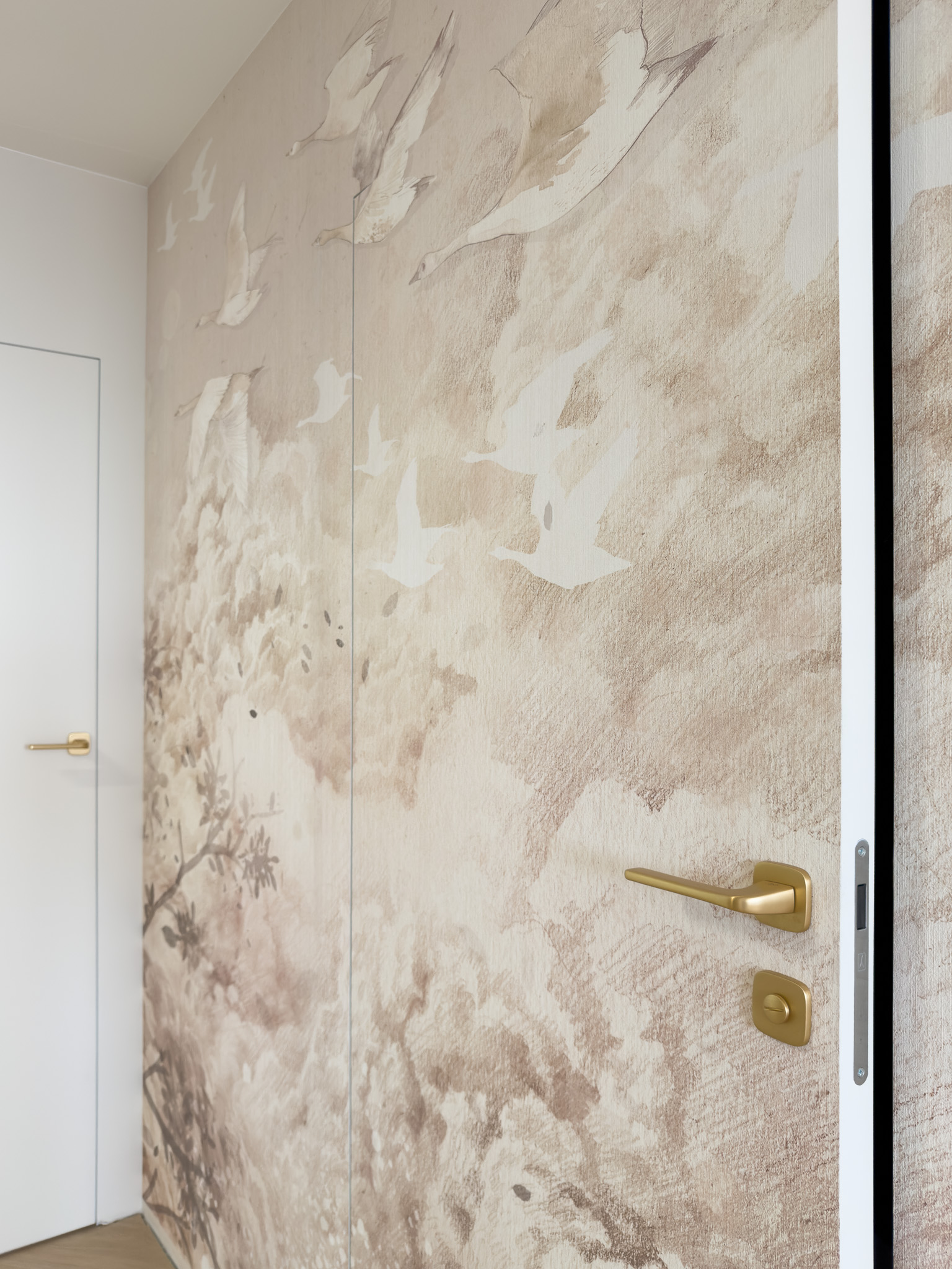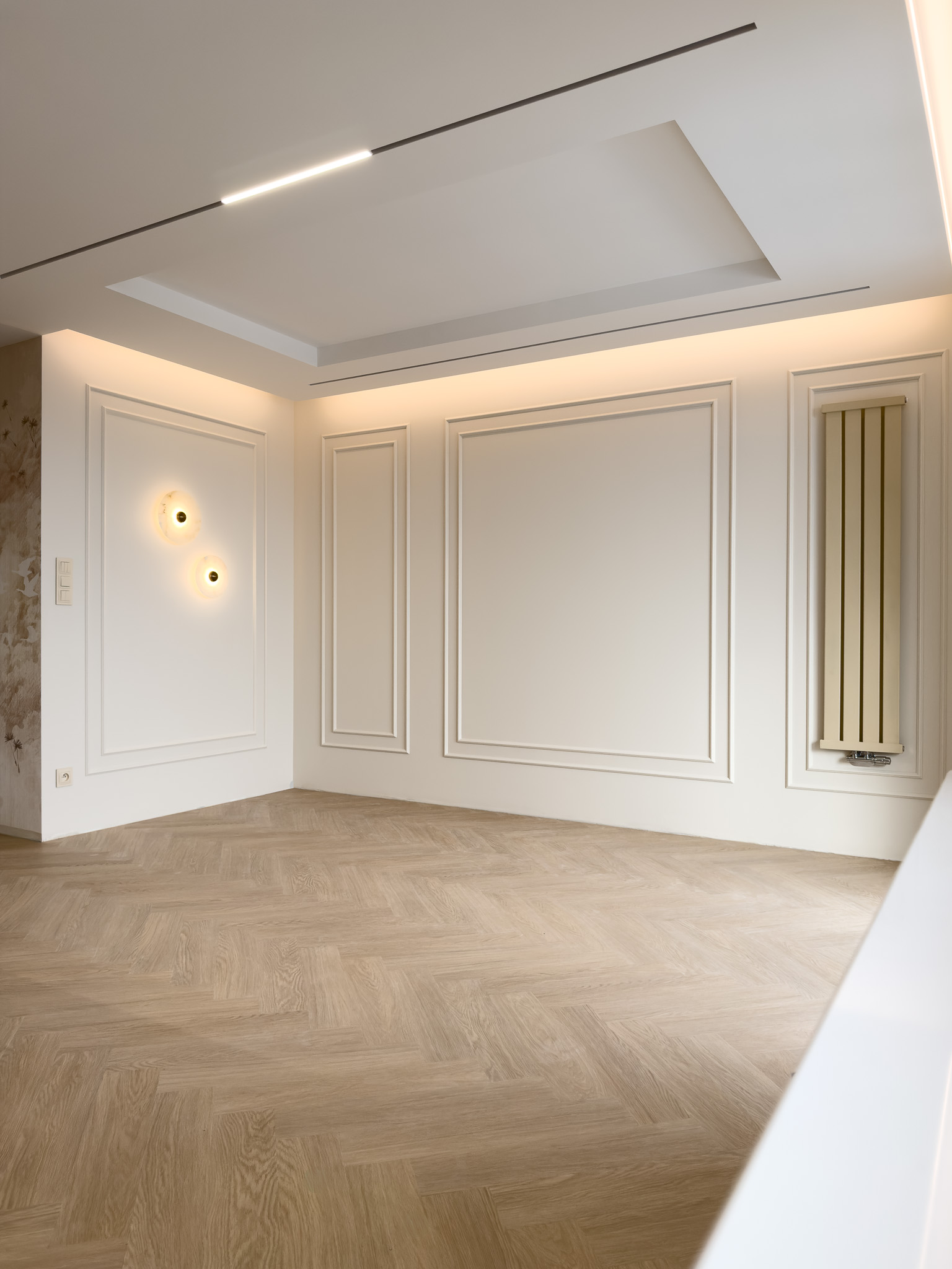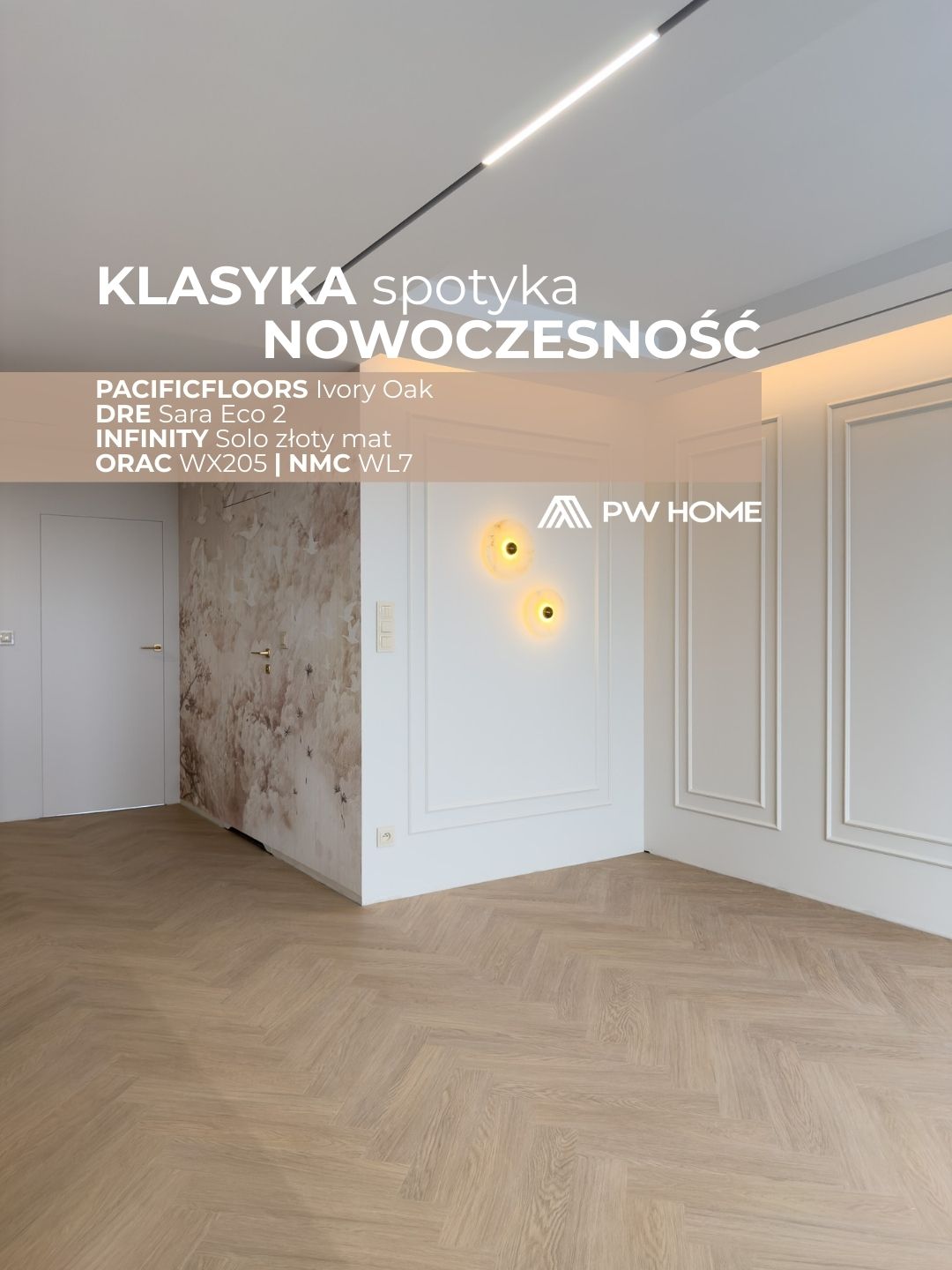 Kwintesencja stylu modern classic. Bazę tworzy jasna dębowa podłoga w układzie jodełki klasycznej, która dodaje wnętrzu klasy i ciepła. Ściany zdobi subtelna sztukateria, nadająca całości rytm i paryski szyk. Nowoczesność podkreślają ukryte drzwi: zlicowane ze ścianą, malowane lub pokryte fototapetą, stają się niemal niewidoczne, tworząc jednolitą płaszczyznę. Całość dopełniają złote detale oraz gra światła, budując przestrzeń pełną harmonii.