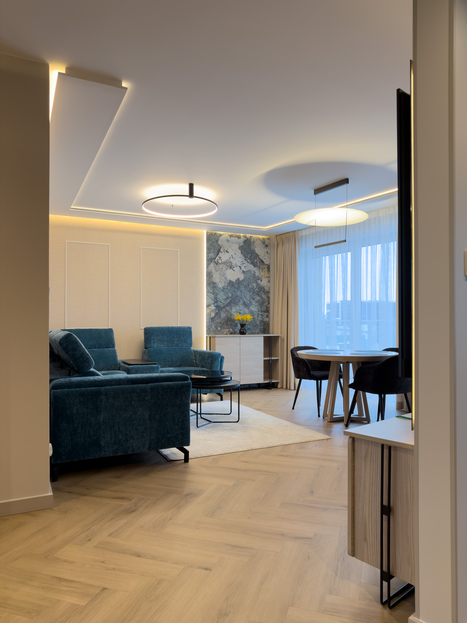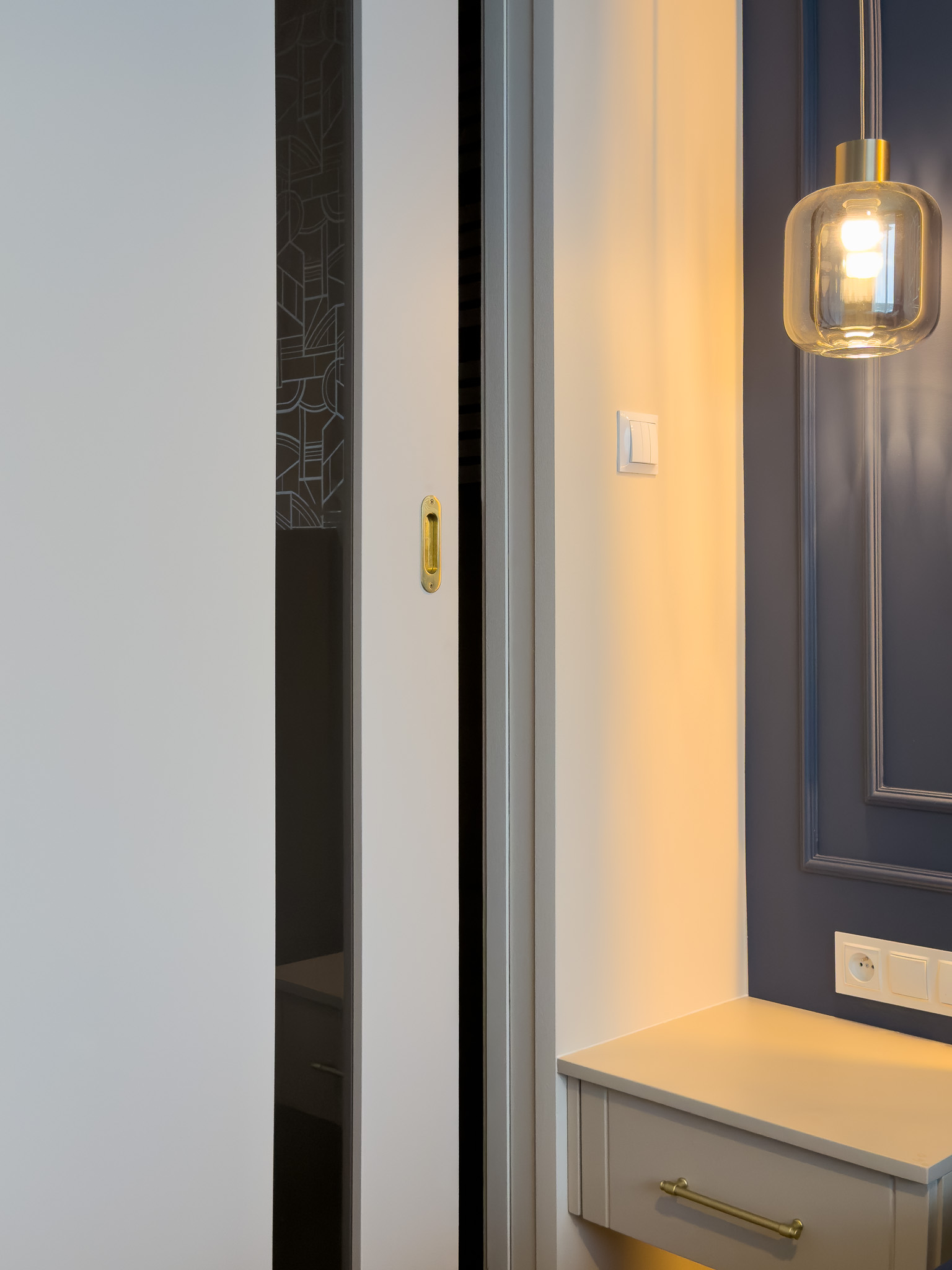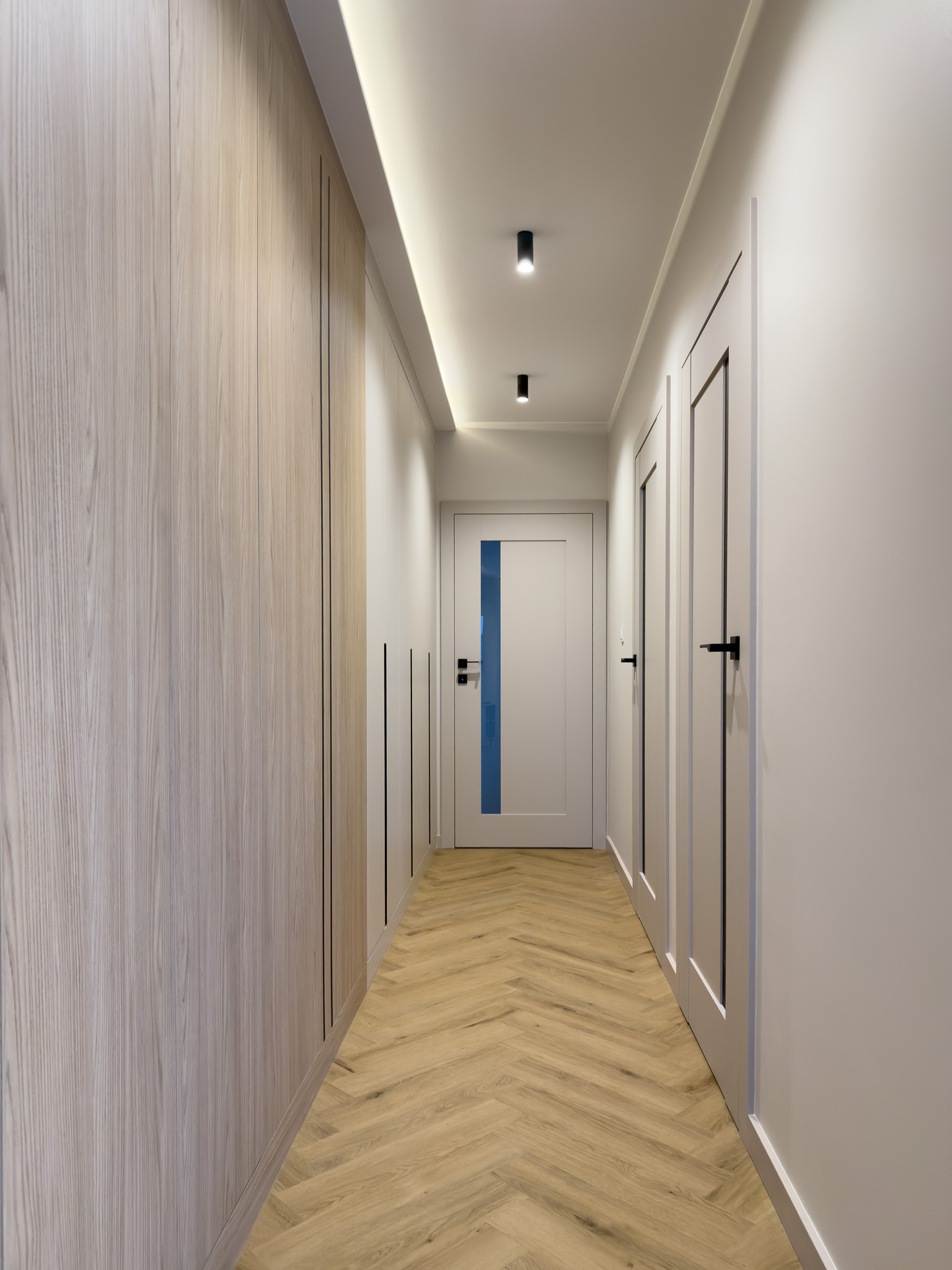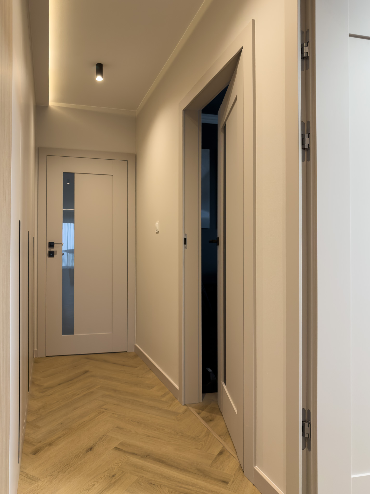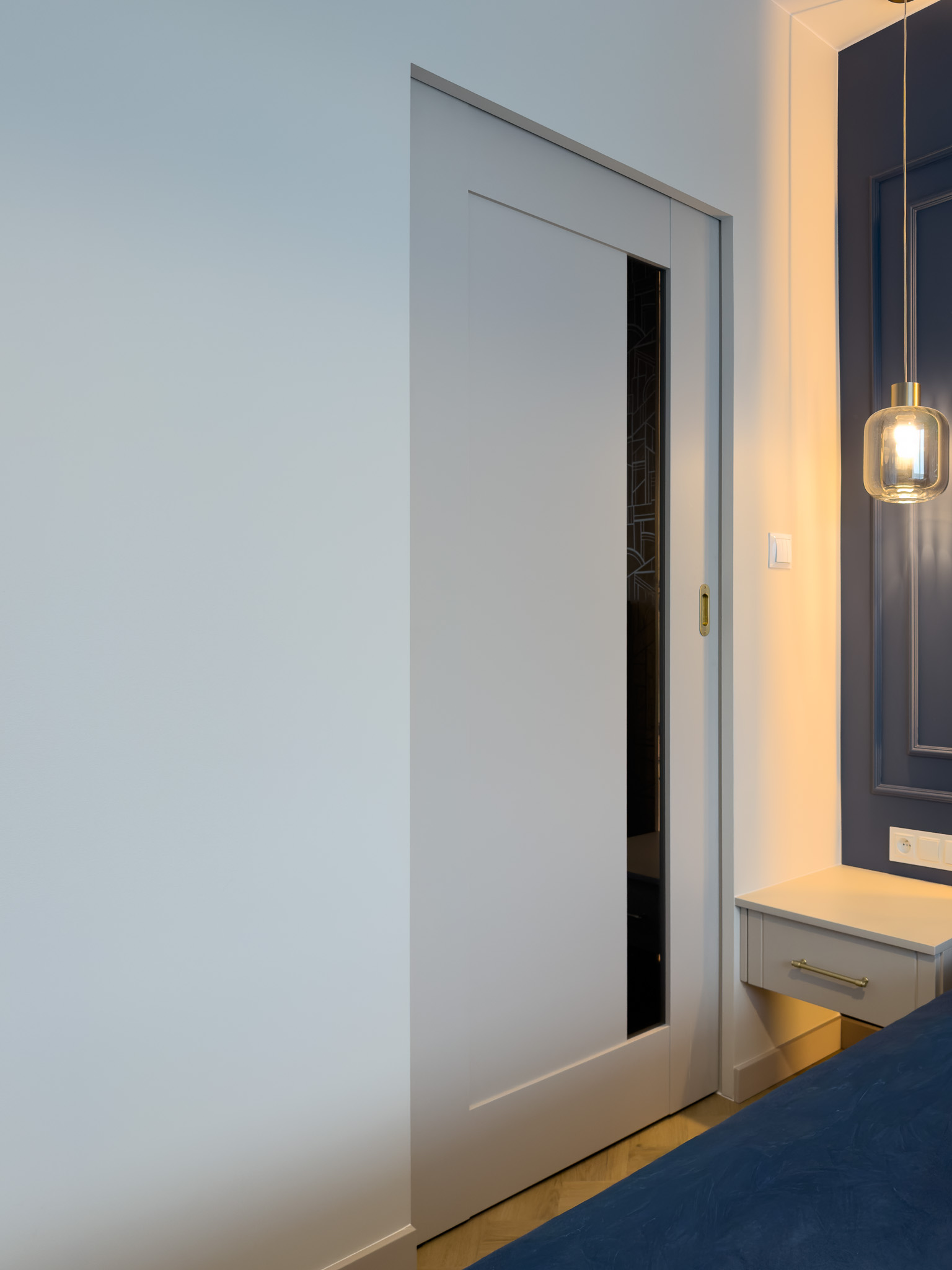 Połączenie minimalizmu oraz domowej przytulności. Czyste, proste formy meblowe i systemy drzwi bezprzylgowych zestawiono tu z klasyczną jodełką oraz luksusowym wykończeniem w postaci sztukaterii i rozbudowanej architektury światła.
