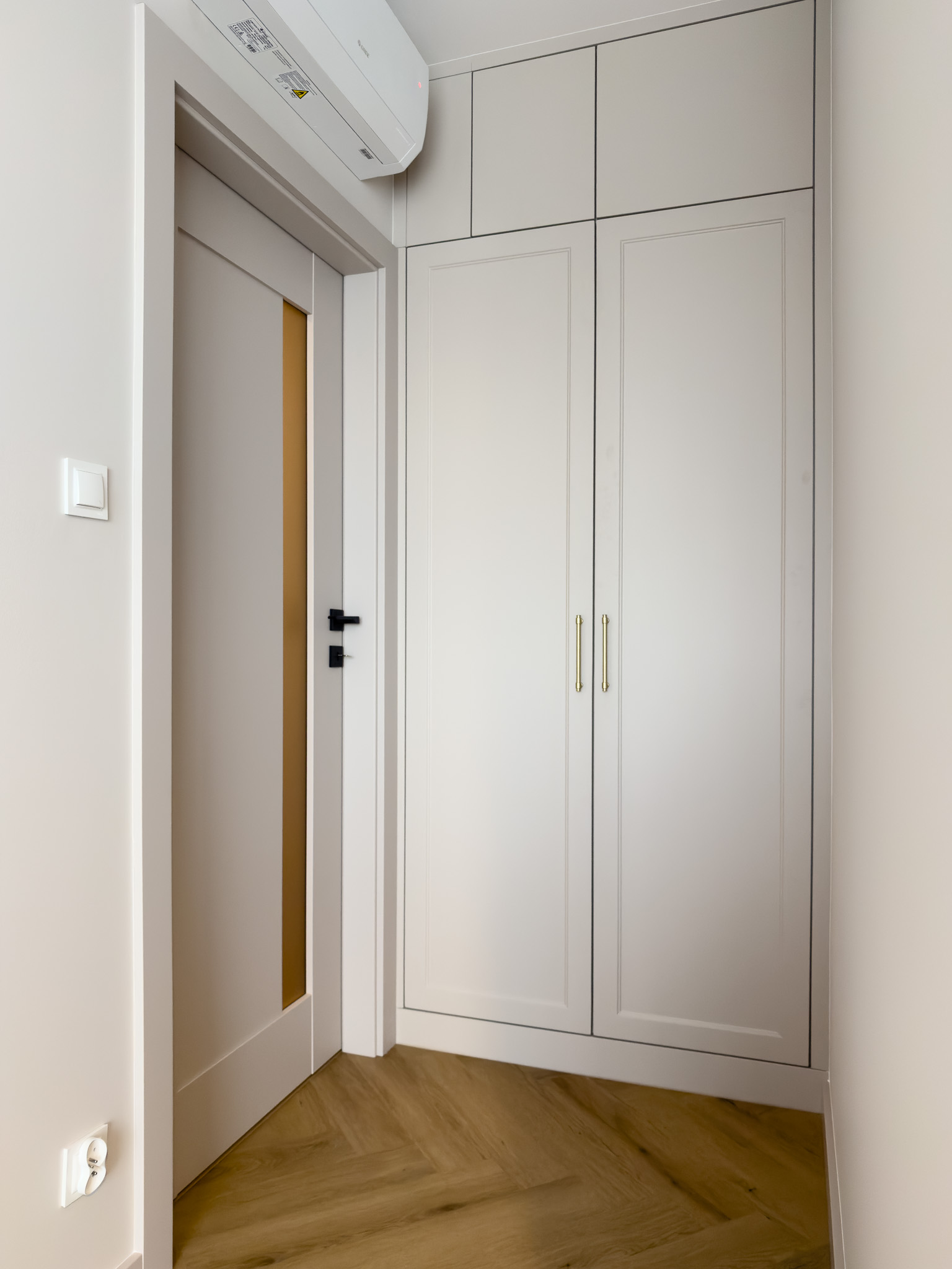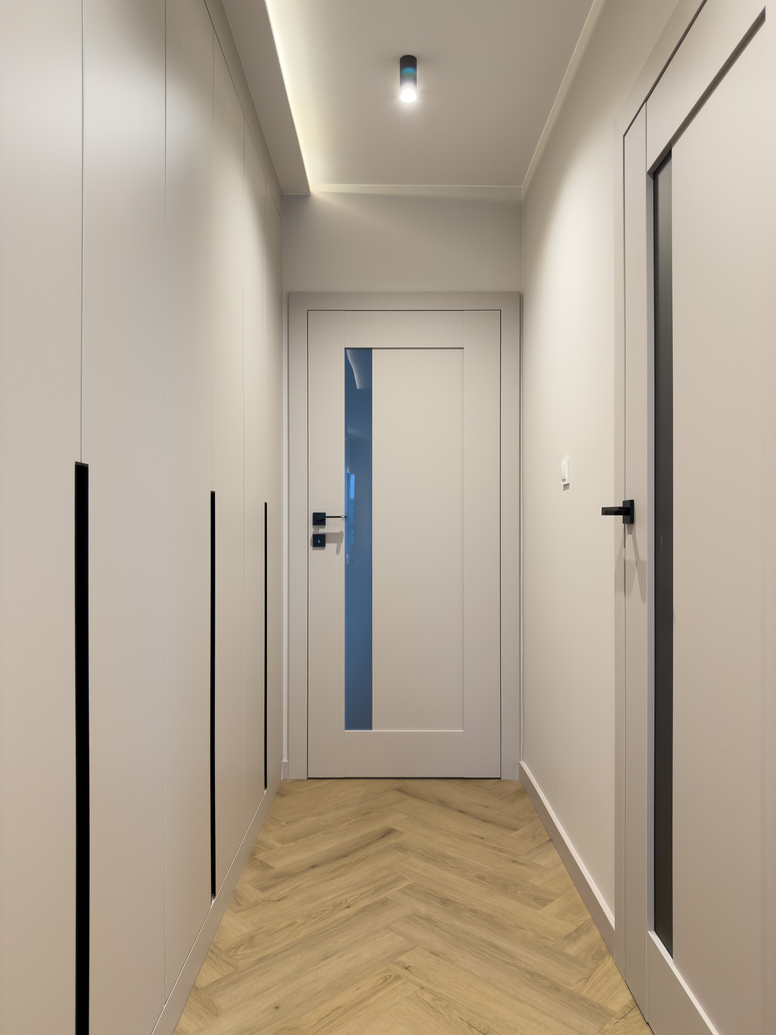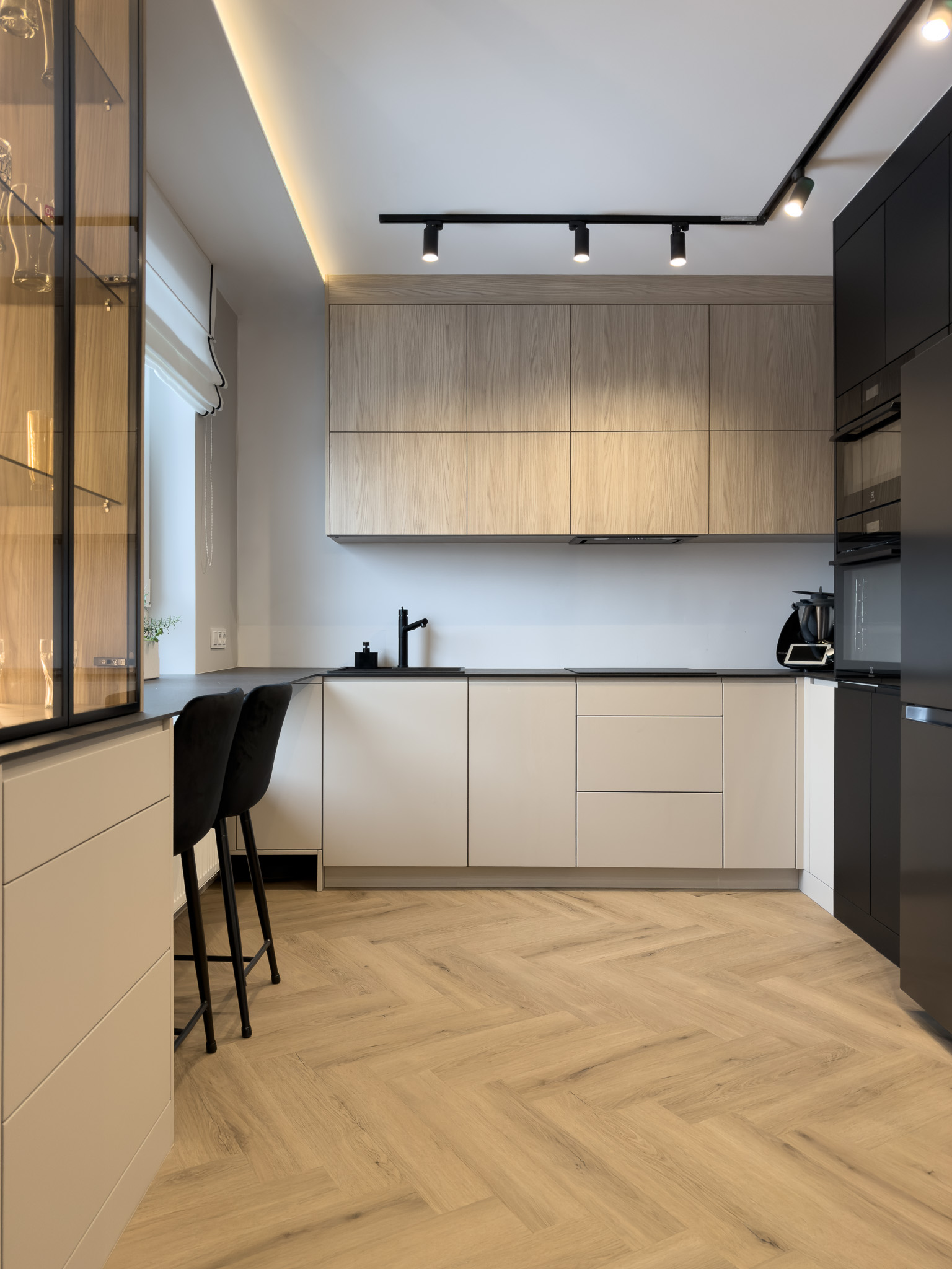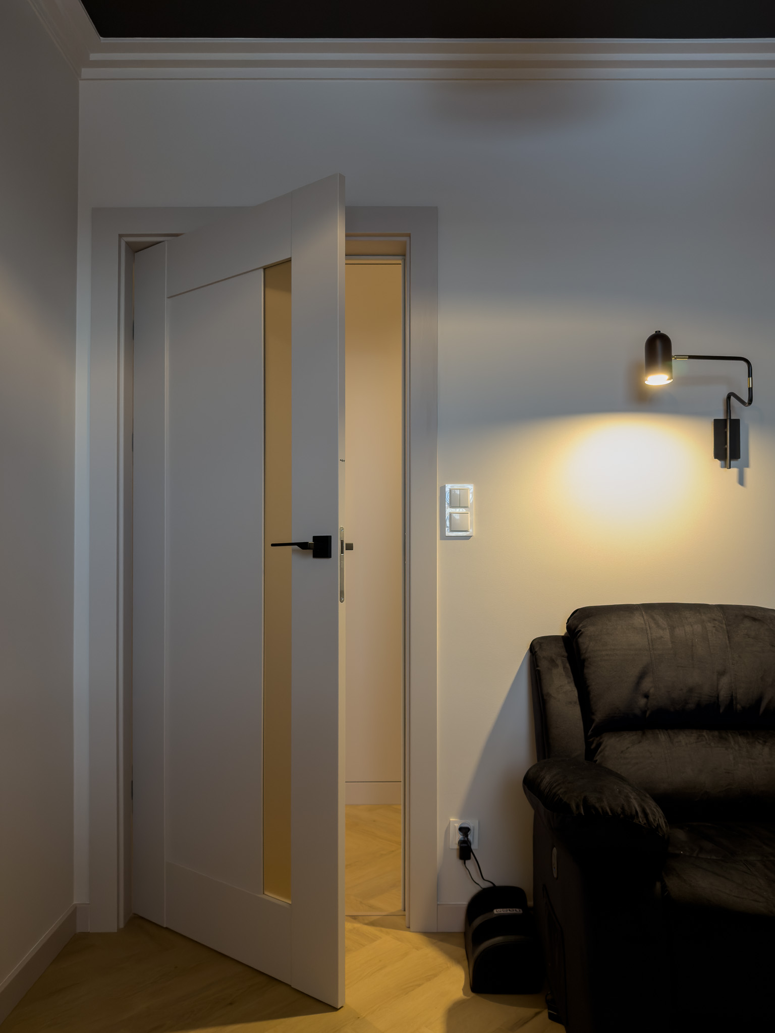 Połączenie minimalizmu oraz domowej przytulności. Czyste, proste formy meblowe i systemy drzwi bezprzylgowych zestawiono tu z klasyczną jodełką oraz luksusowym wykończeniem w postaci sztukaterii i rozbudowanej architektury światła.