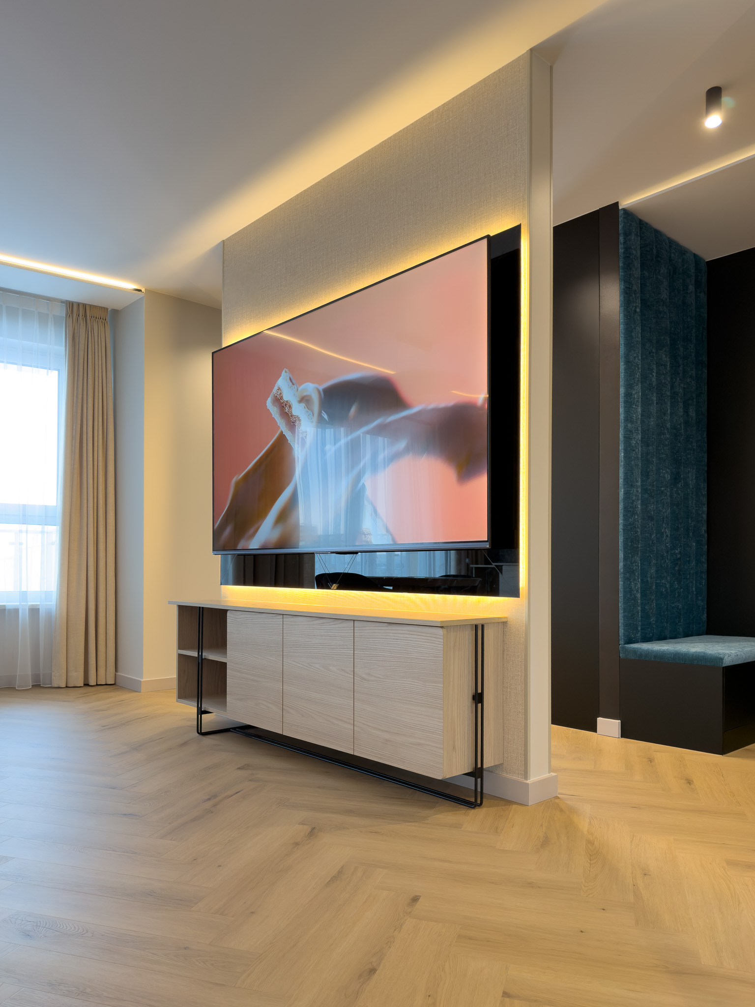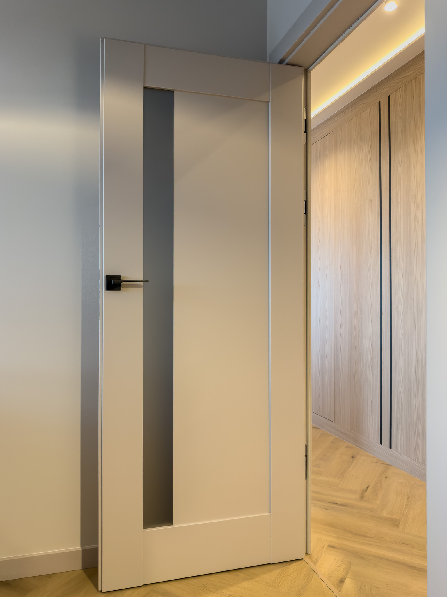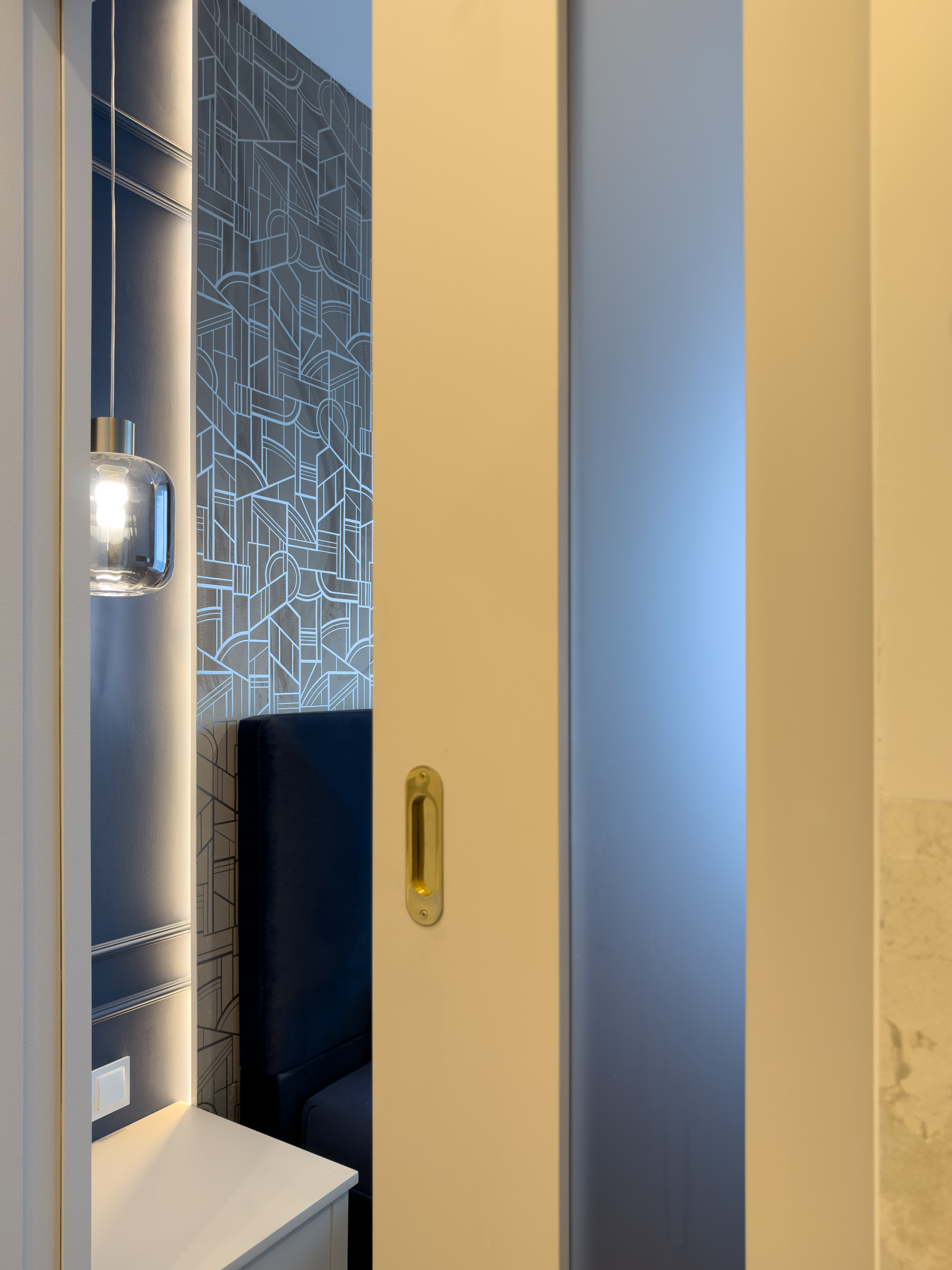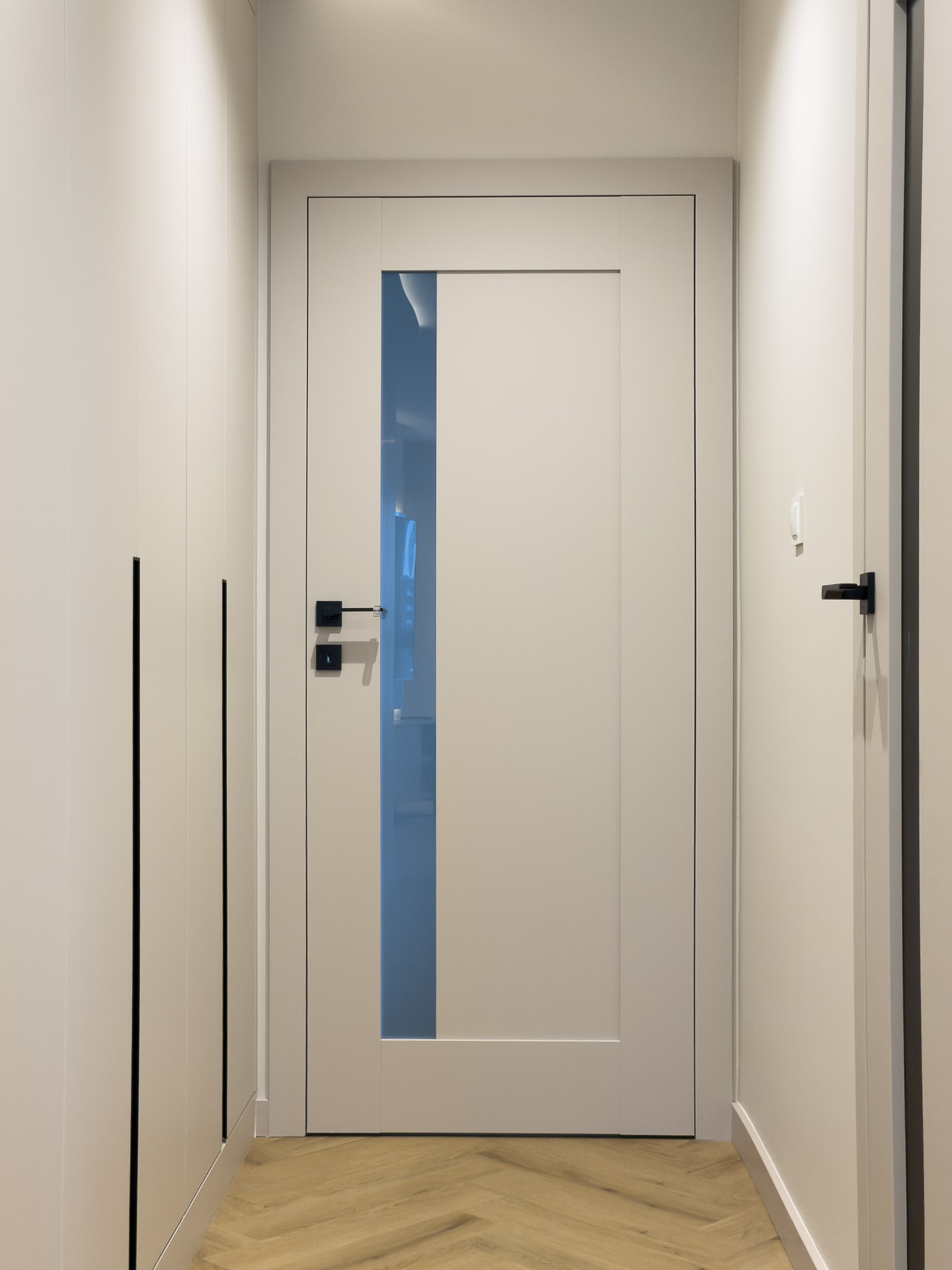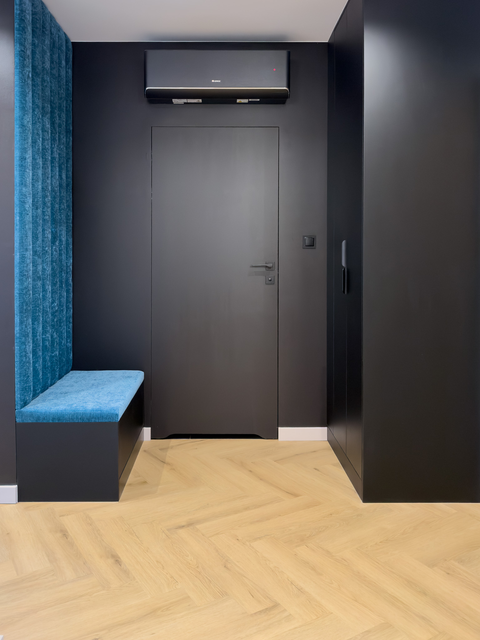 Połączenie minimalizmu oraz domowej przytulności. Czyste, proste formy meblowe i systemy drzwi bezprzylgowych zestawiono tu z klasyczną jodełką oraz luksusowym wykończeniem w postaci sztukaterii i rozbudowanej architektury światła.