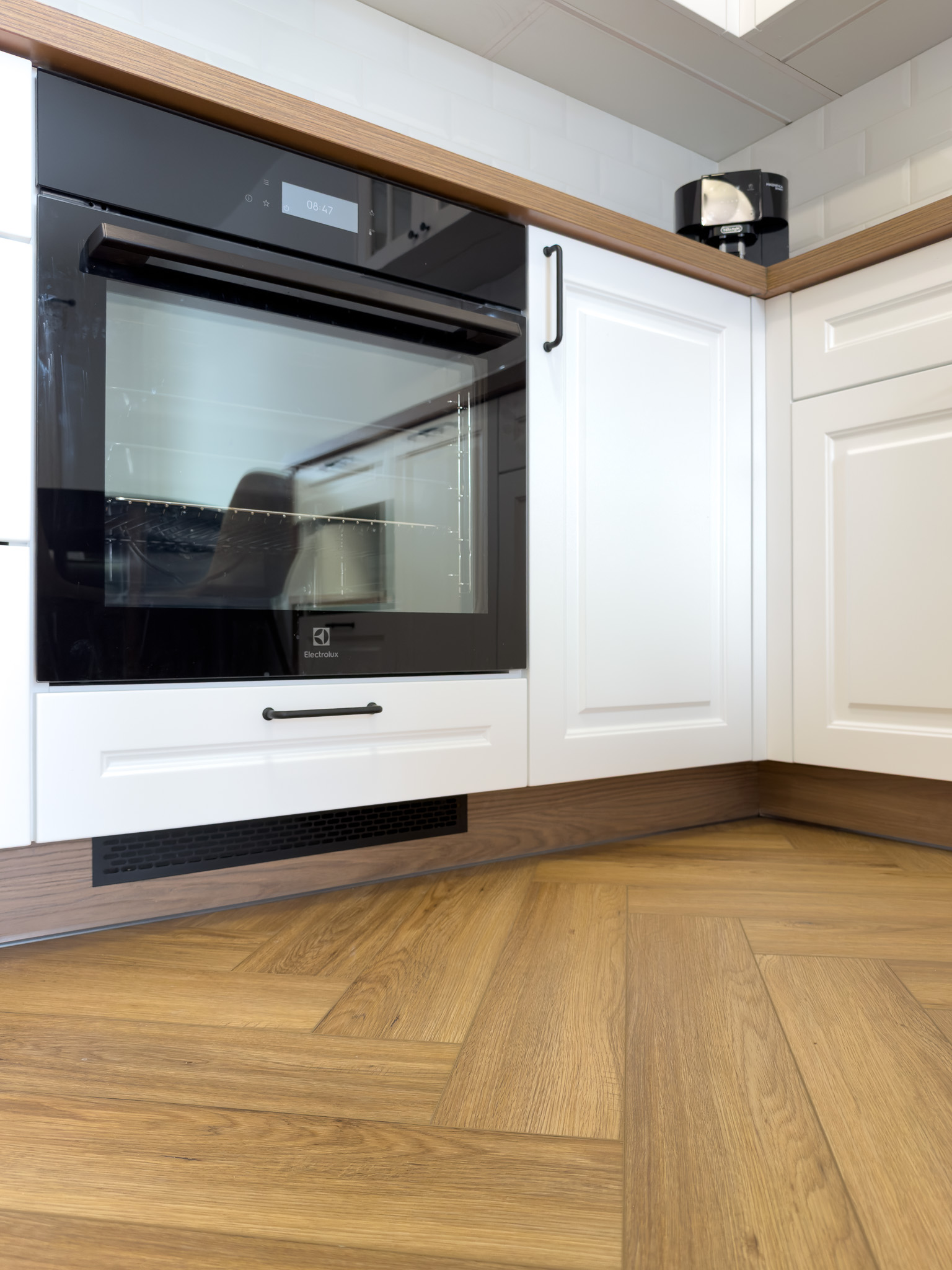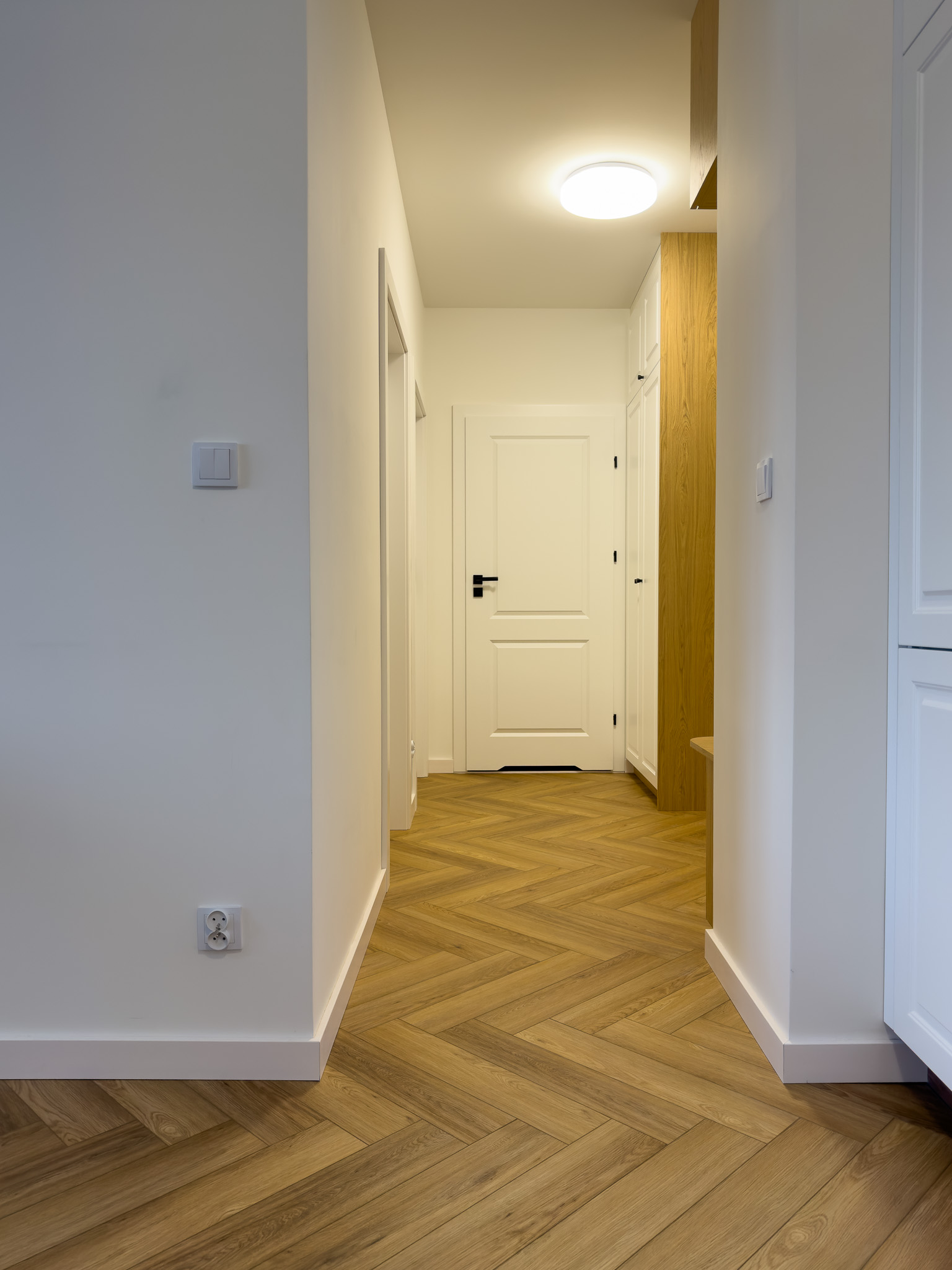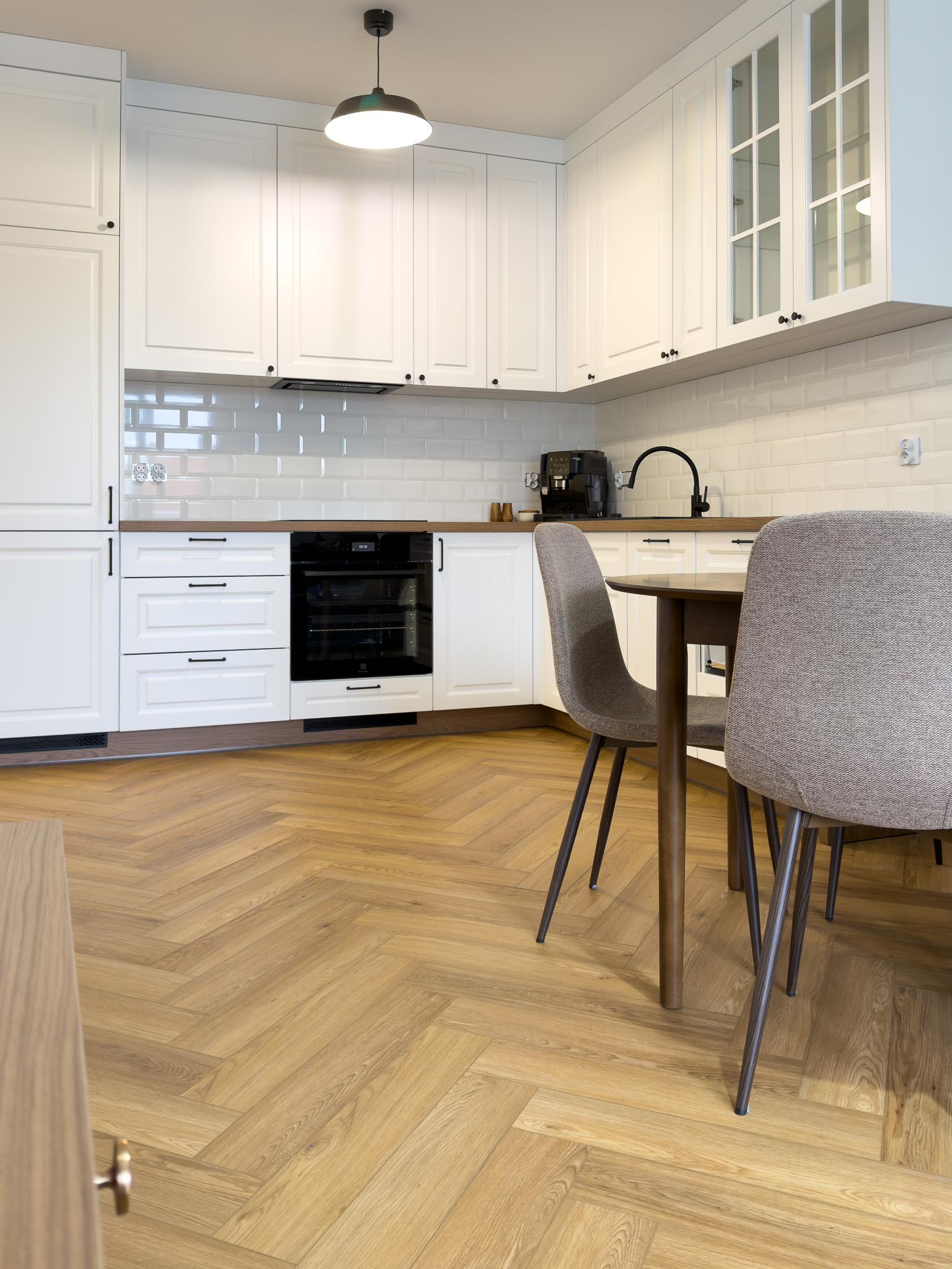 Podłoga montowana w systemie klejonym, co umożliwiło ułożenie jej bez konieczności stosowania dylatacji w przejściach między pomieszczeniami, przy jednoczesnym zachowaniu pełnej gwarancji producenta.
