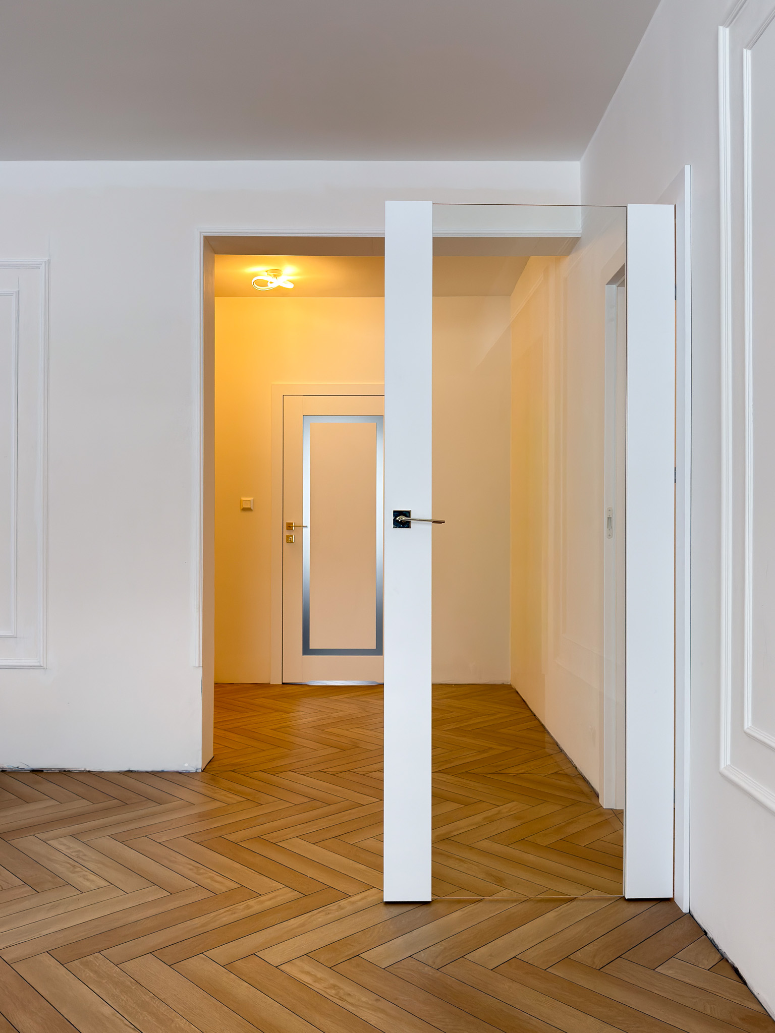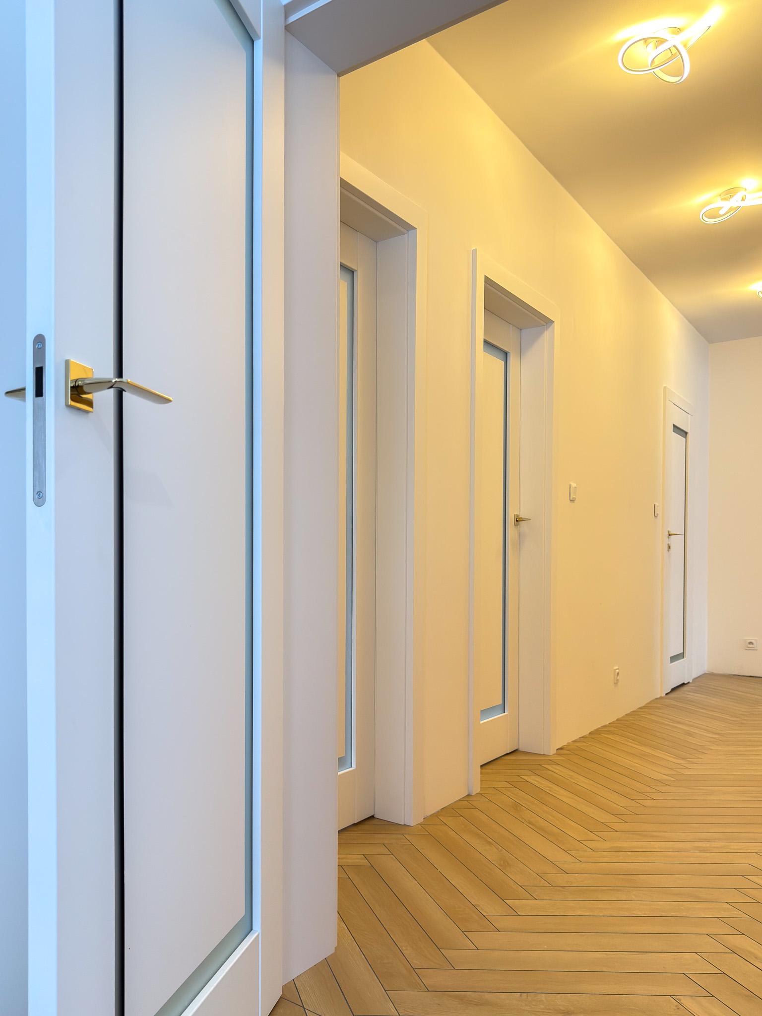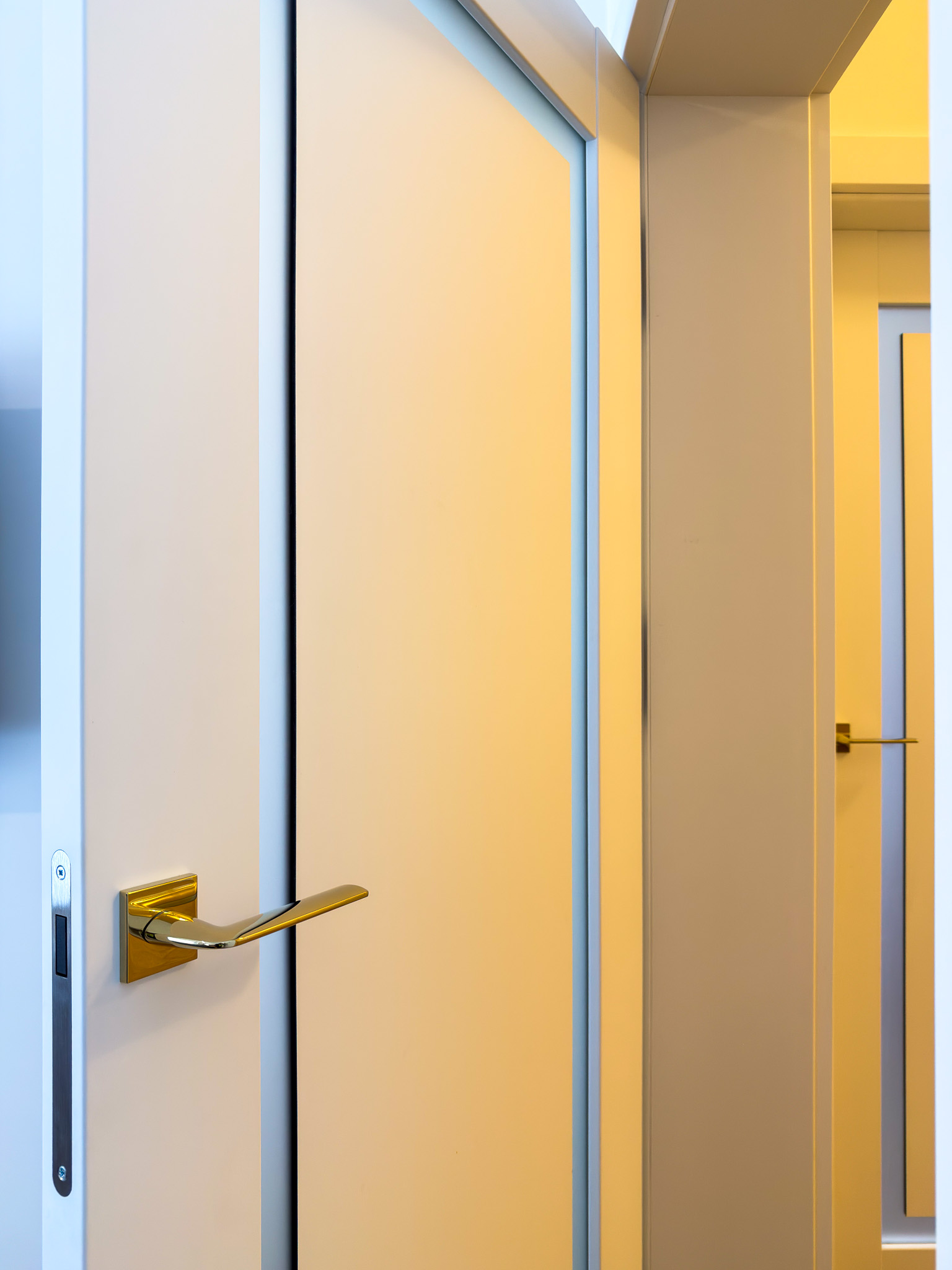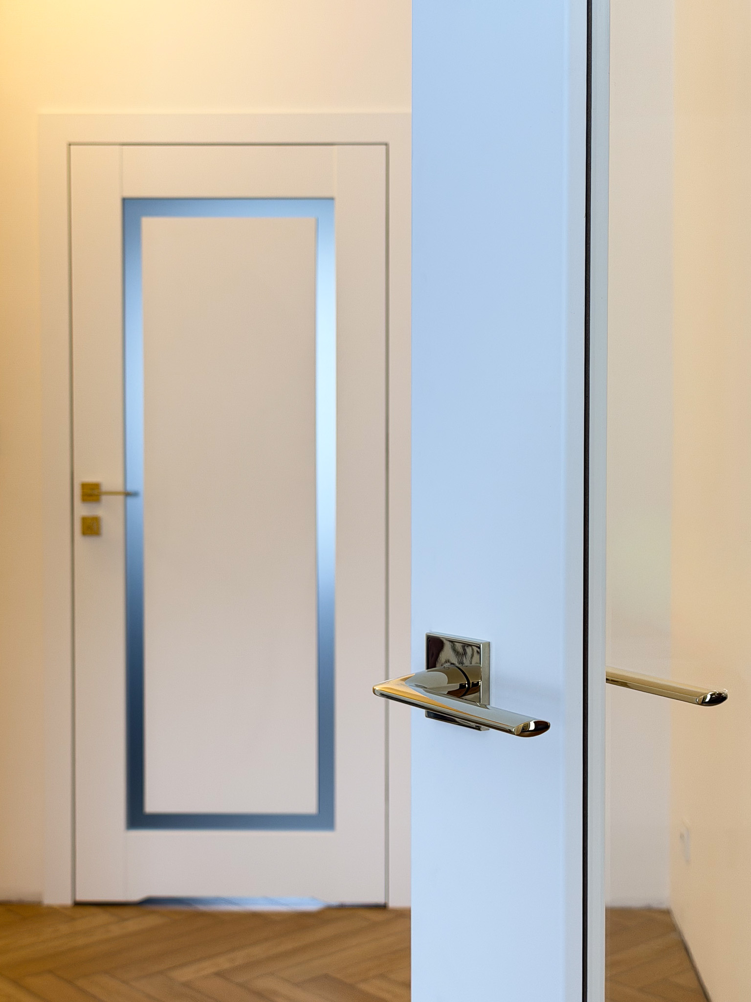 Trzy warianty bezprzylgowych drzwi. Mimo różnic konstrukcyjnych tworzą spójny układ, charakteryzujący się czystością formy. Zróżnicowane przeszklenia wprowadzają do wnętrza naturalne doświetlenie i lekkość, podczas gdy ukryte porządkują przestrzeń. Surową geometrię bieli i szkła przełamują delikatne, złote klamki.
