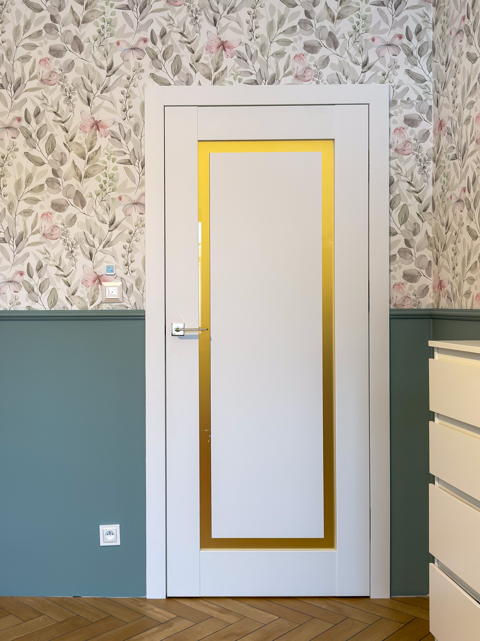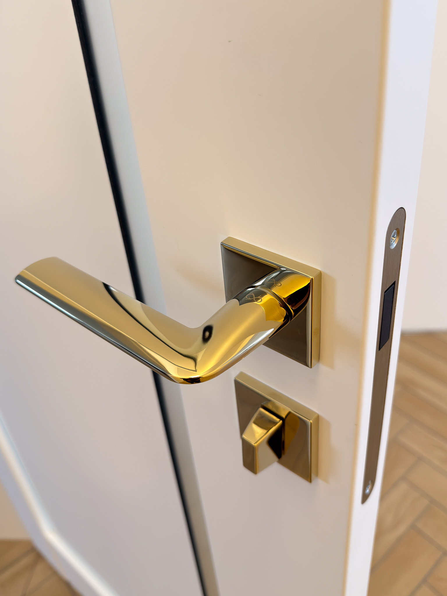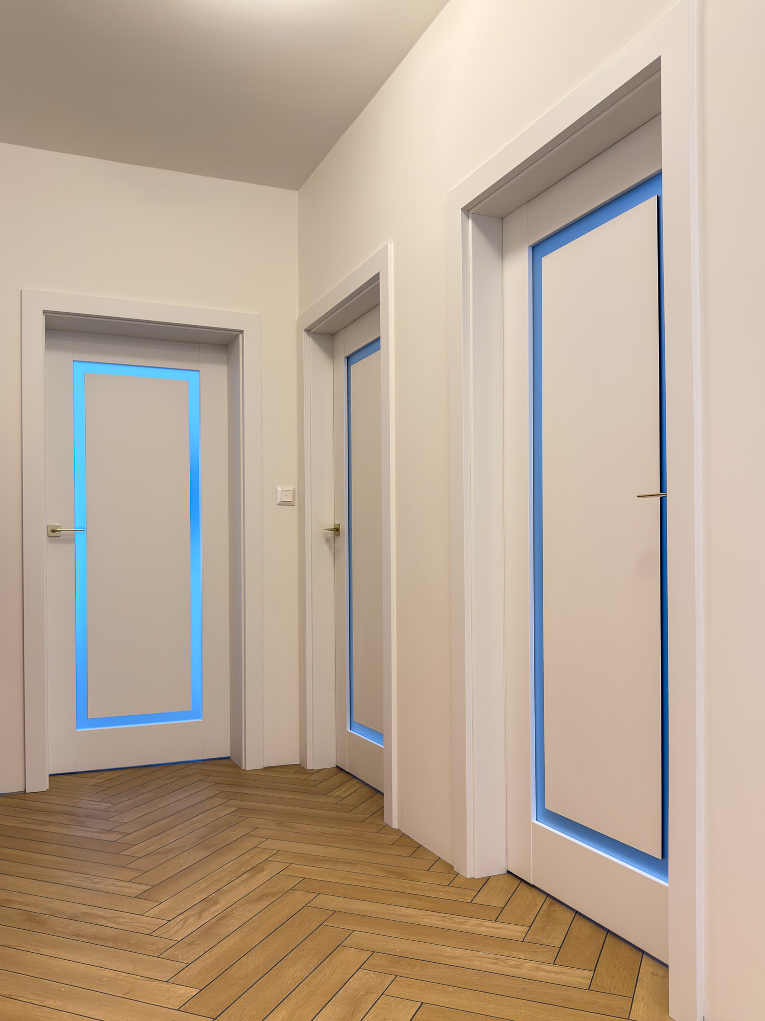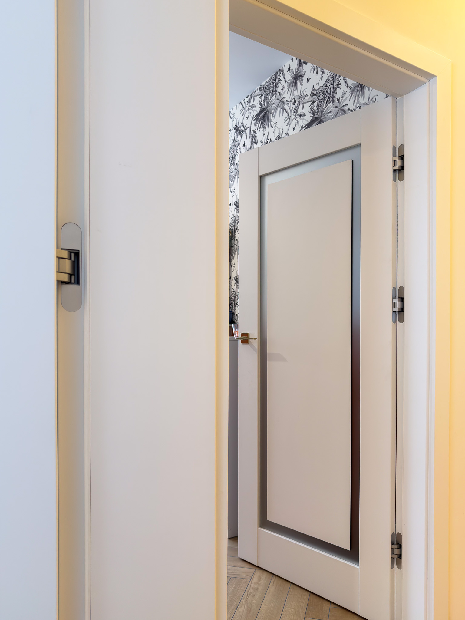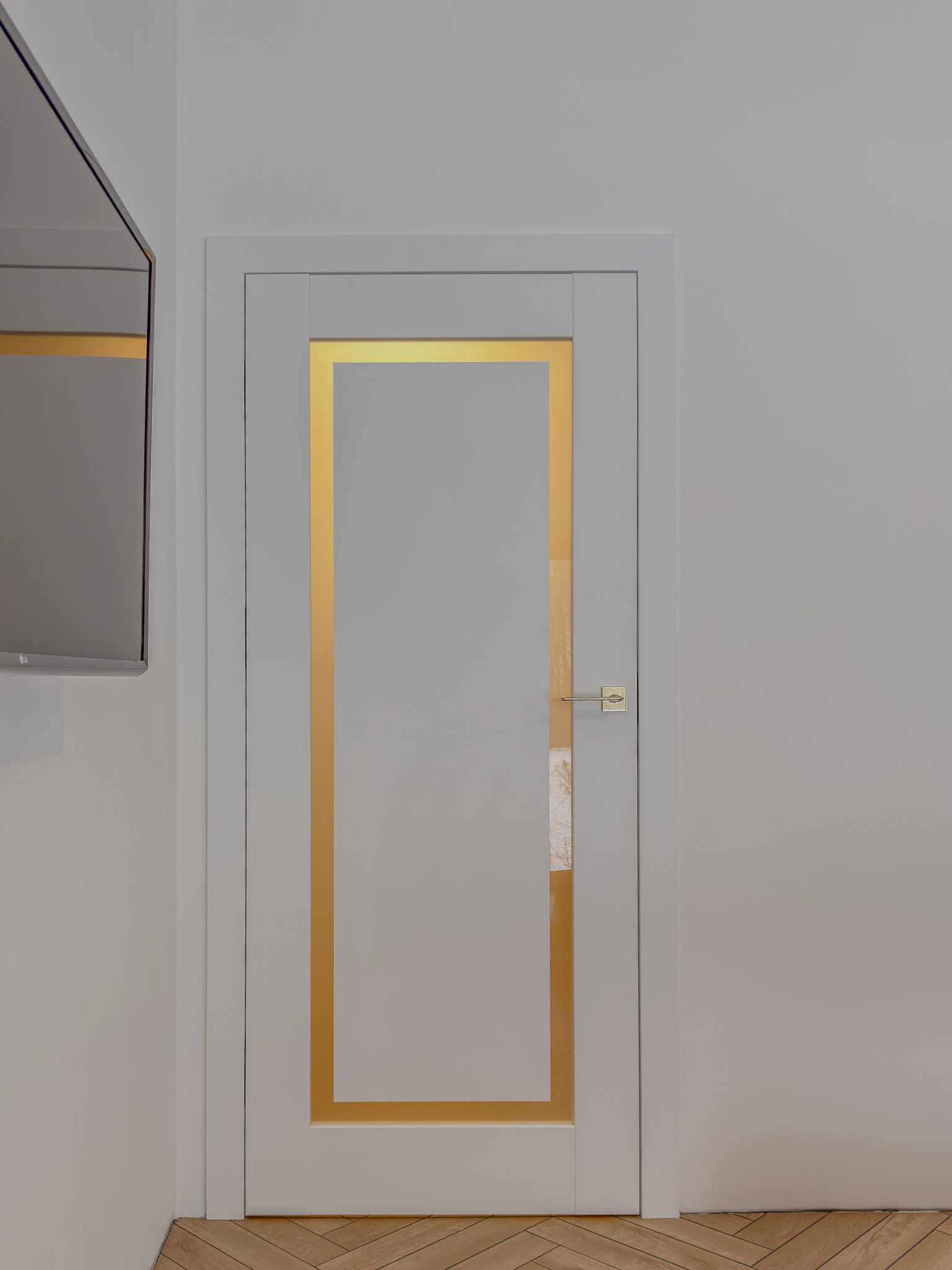 Trzy warianty bezprzylgowych drzwi. Mimo różnic konstrukcyjnych tworzą spójny układ, charakteryzujący się czystością formy. Zróżnicowane przeszklenia wprowadzają do wnętrza naturalne doświetlenie i lekkość, podczas gdy ukryte porządkują przestrzeń. Surową geometrię bieli i szkła przełamują delikatne, złote klamki.