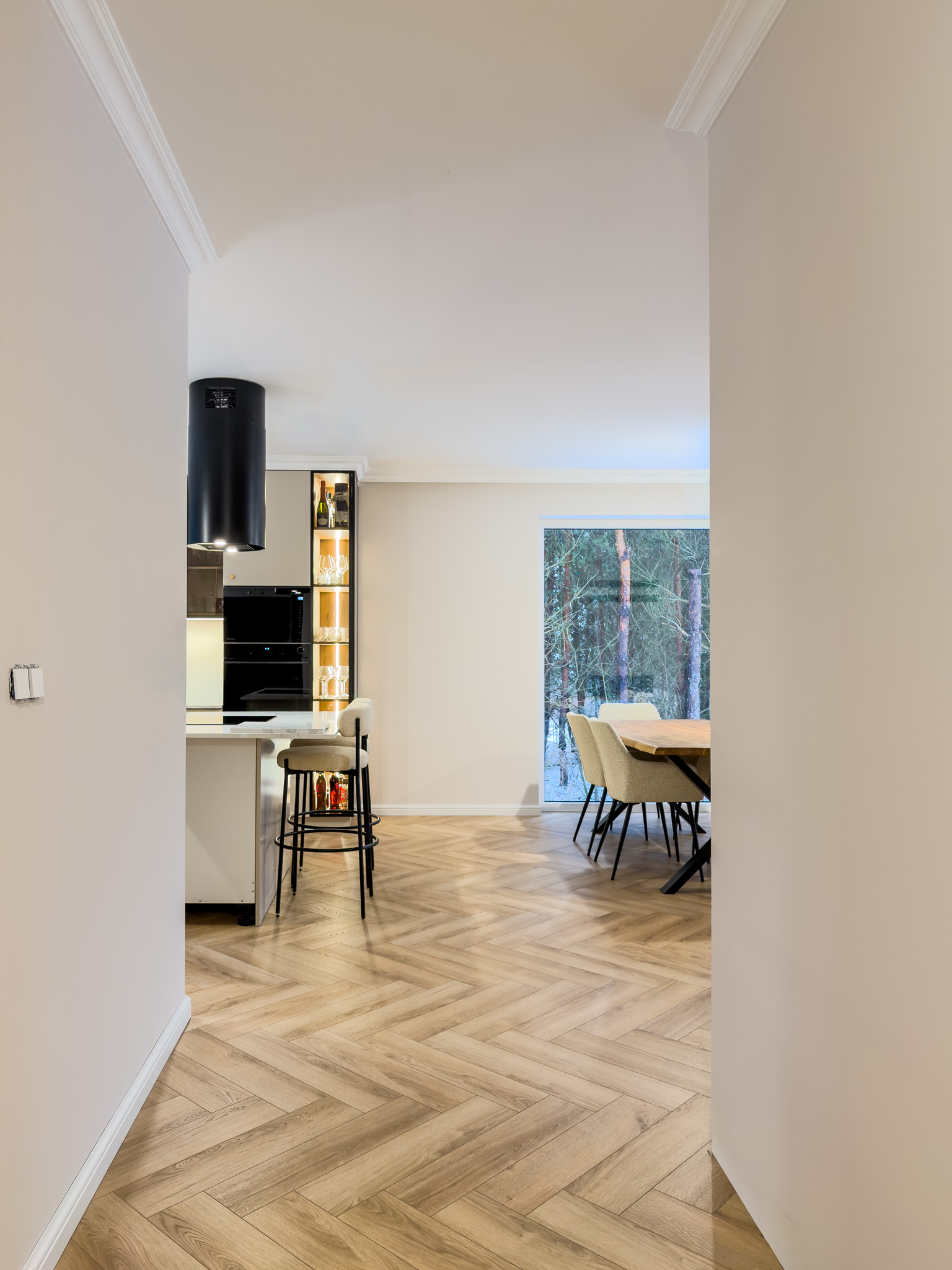 Zastosowanie tego samego wzoru w salonie, kuchni, pokojach oraz korytarzach eliminuje zbędne progi i podziały wizualne. Kontynuację tej przejrzystości stanowią przeszklone drzwi loftowi w wiatrołapie, które doświetlają wnętrze i nadają lekkości.