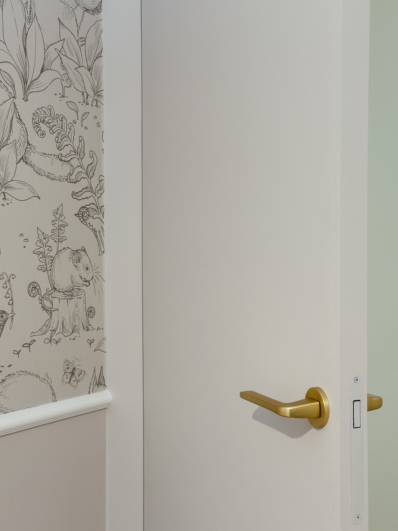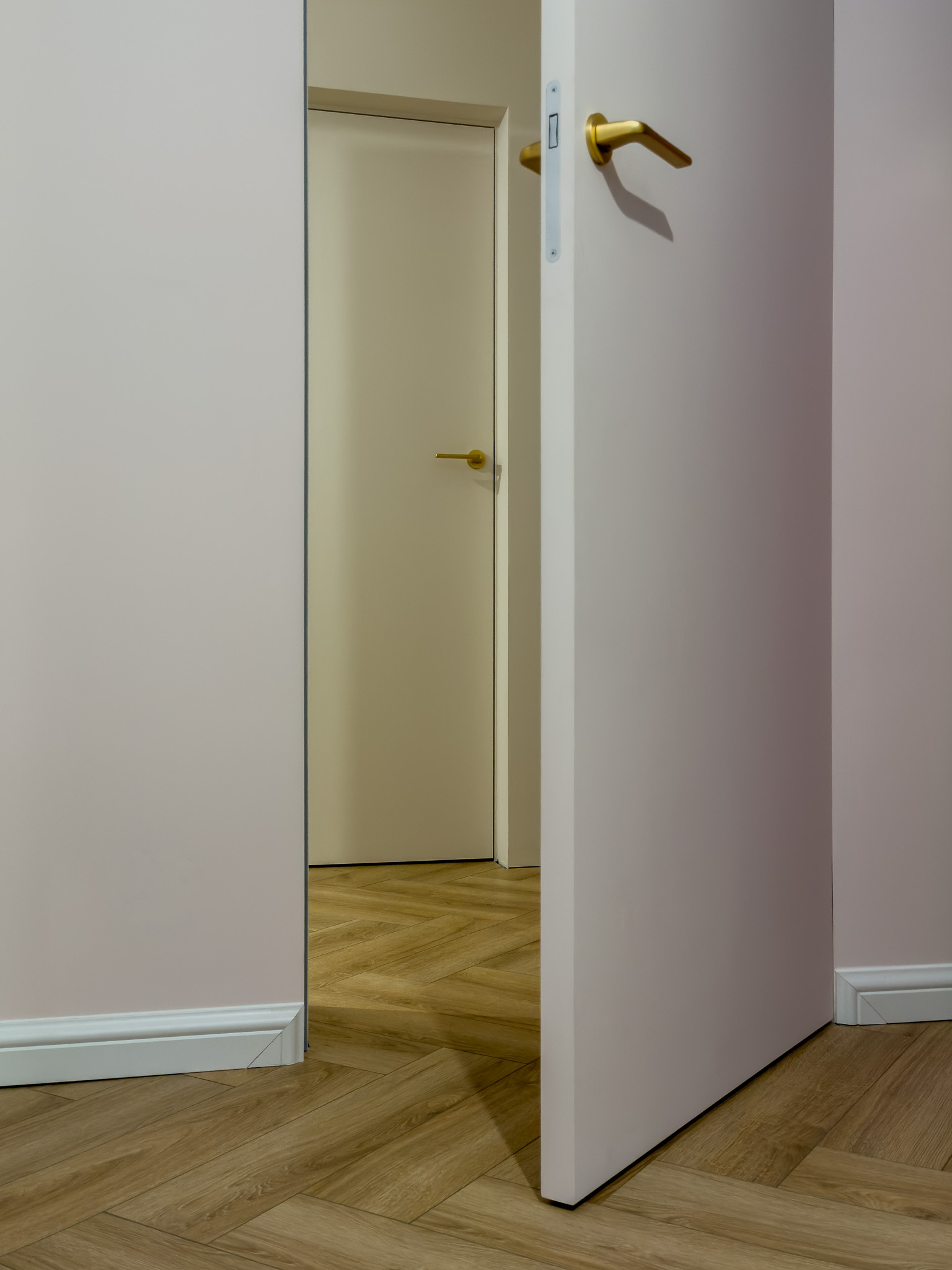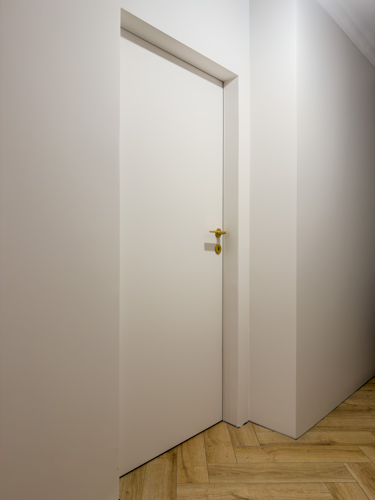 Aby zachować tę czystość formy, zastosowano drzwi ukryte malowane pod kolor ścian. Ten zabieg optycznie powiększa korytarze, a wewnątrz pokoi sprawia, że skrzydła niemal znikają z pola widzenia, tworząc gładkie płaszczyzny. Przemyślanym detalem są drzwi do toalety, malowane dwustronnie w różnych kolorach. Pozwala to na idealne dopasowanie skrzydła do odmiennych aranżacji obu pomieszczeń, bez wprowadzania stylistycznego chaosu w strefie komunikacji.