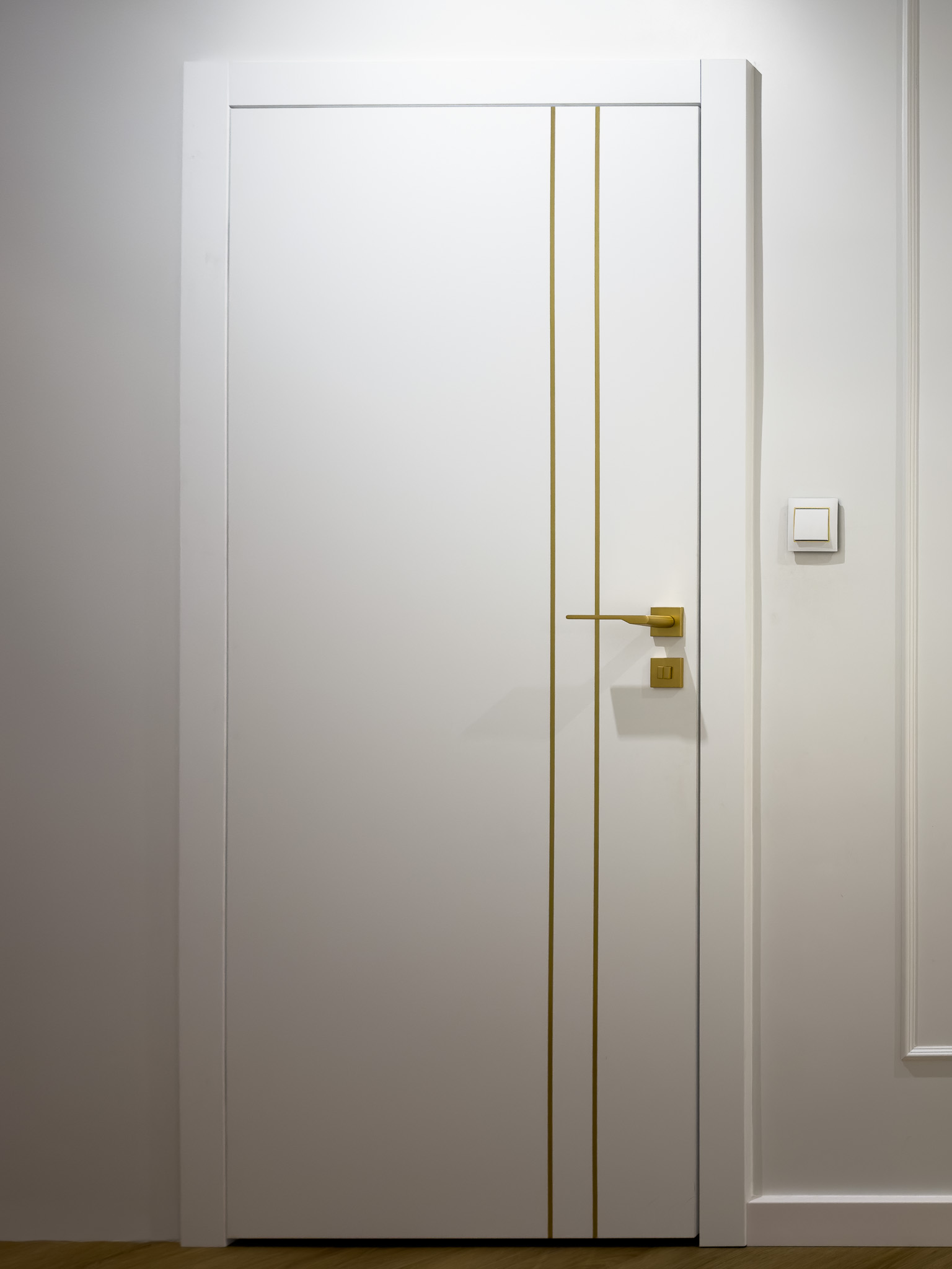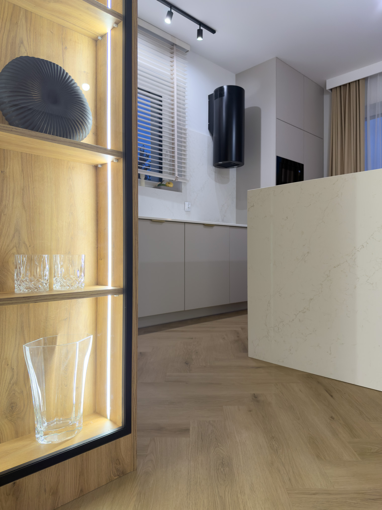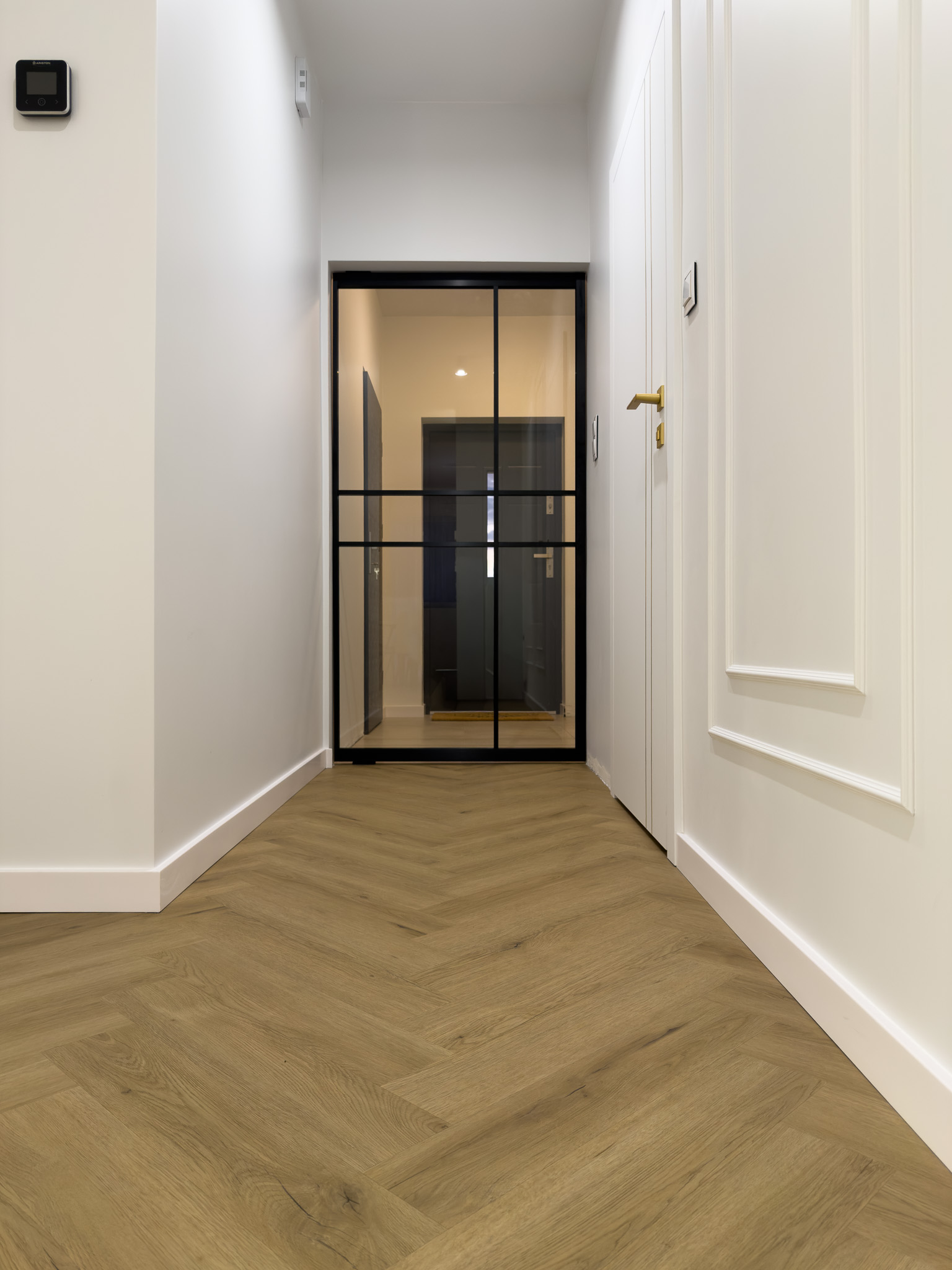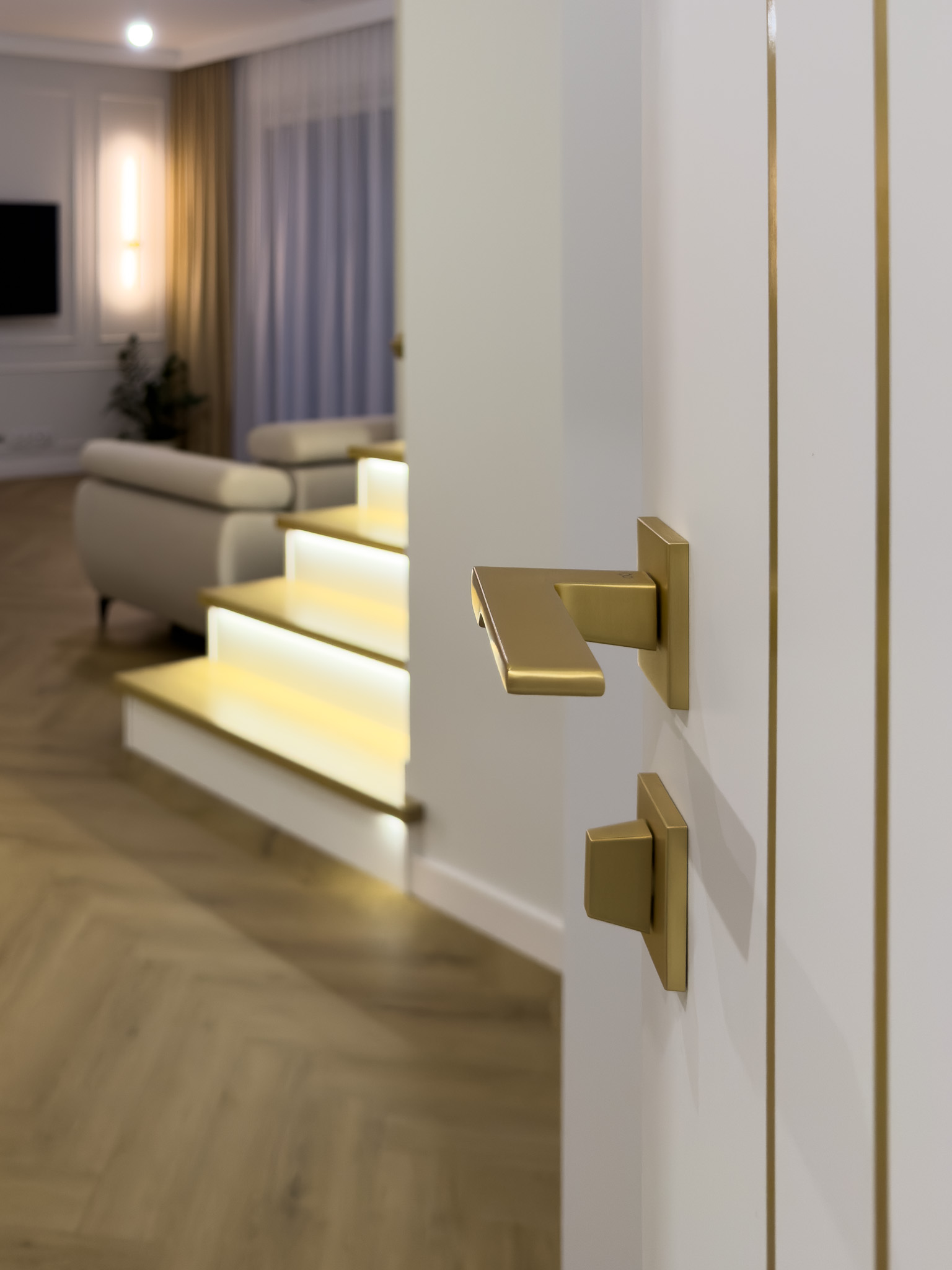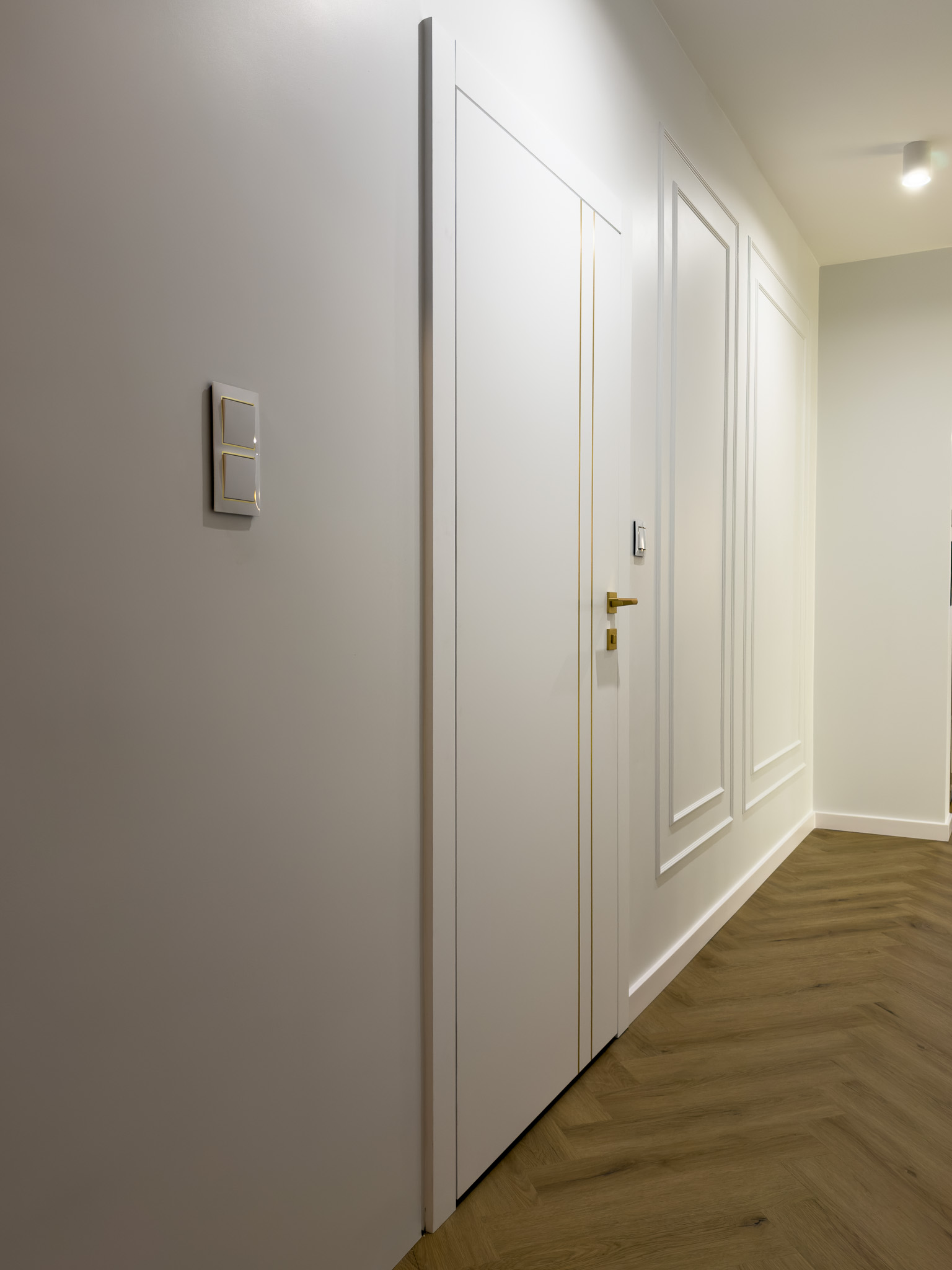 Strefa dzienna to już klasyczne połączenie bieli, naturalnego drewna i złotych dodatków. Białe drzwi ze złotymi detalami oraz podłoga ułożona w klasyczną jodełkę tworzą elegancką przestrzeń pełną światła i ciepła. Subtelne oświetlenie i stonowana kolorystyka nadają wnętrzu luksusowy, a zarazem przytulny charakter.