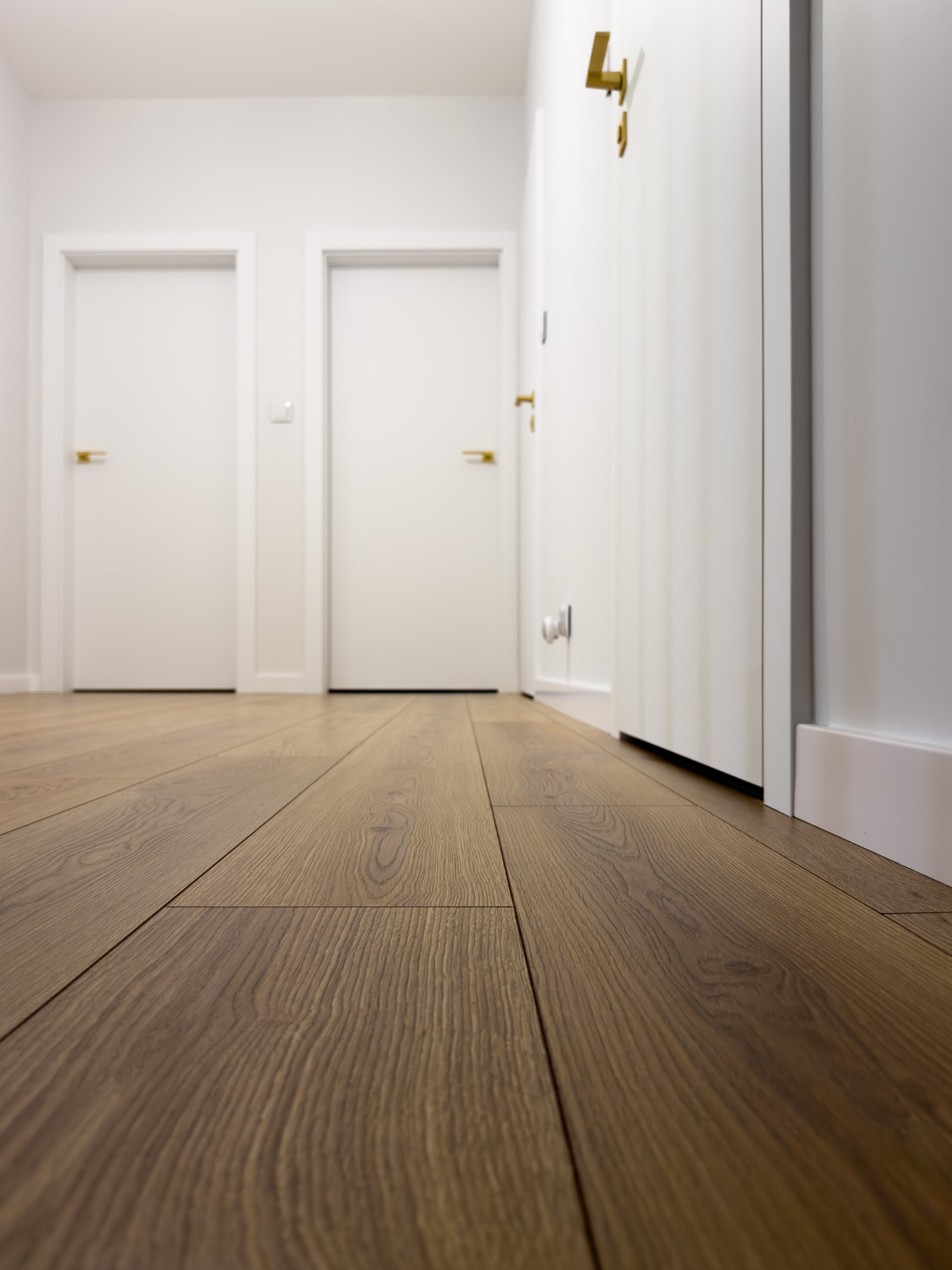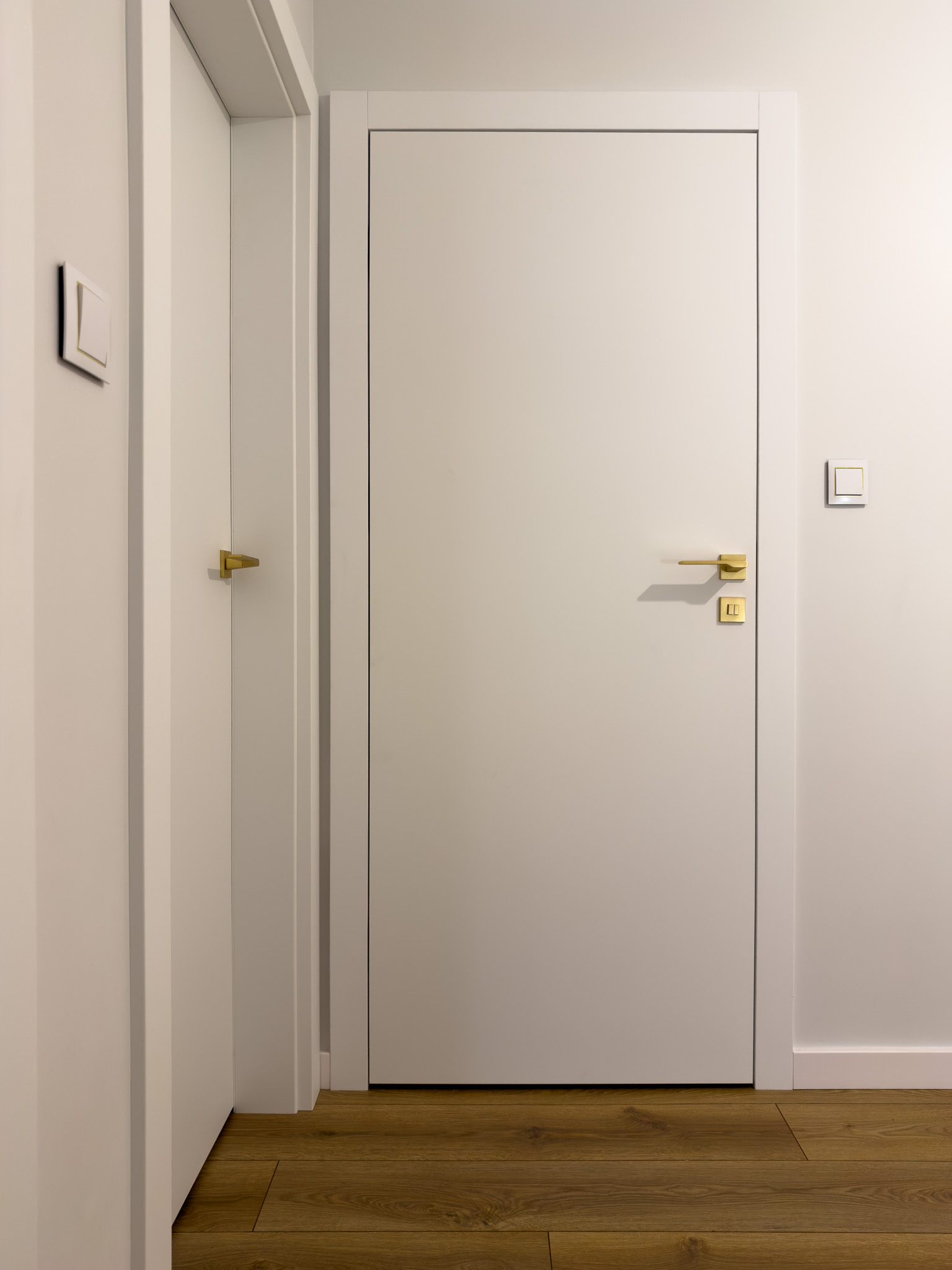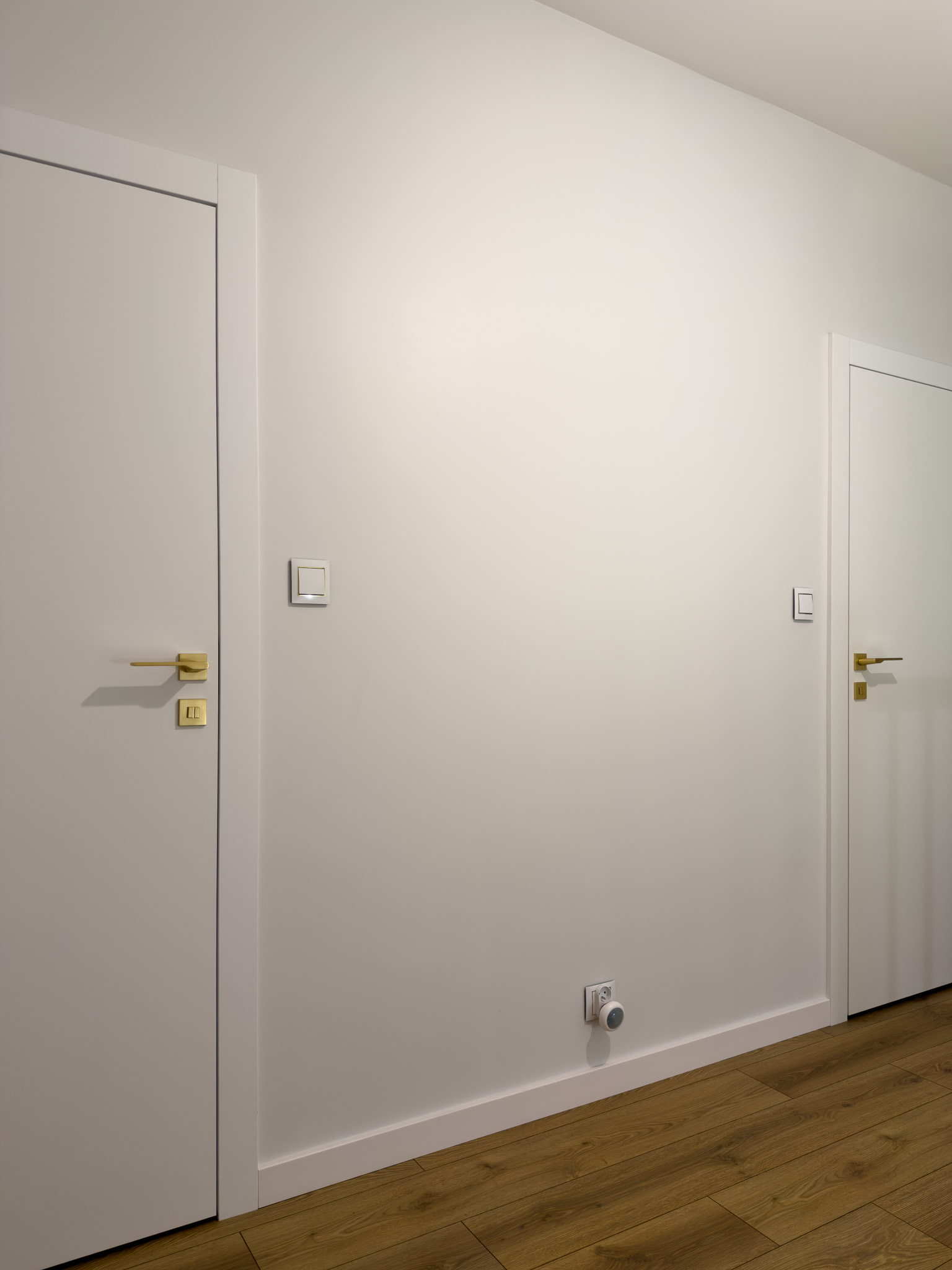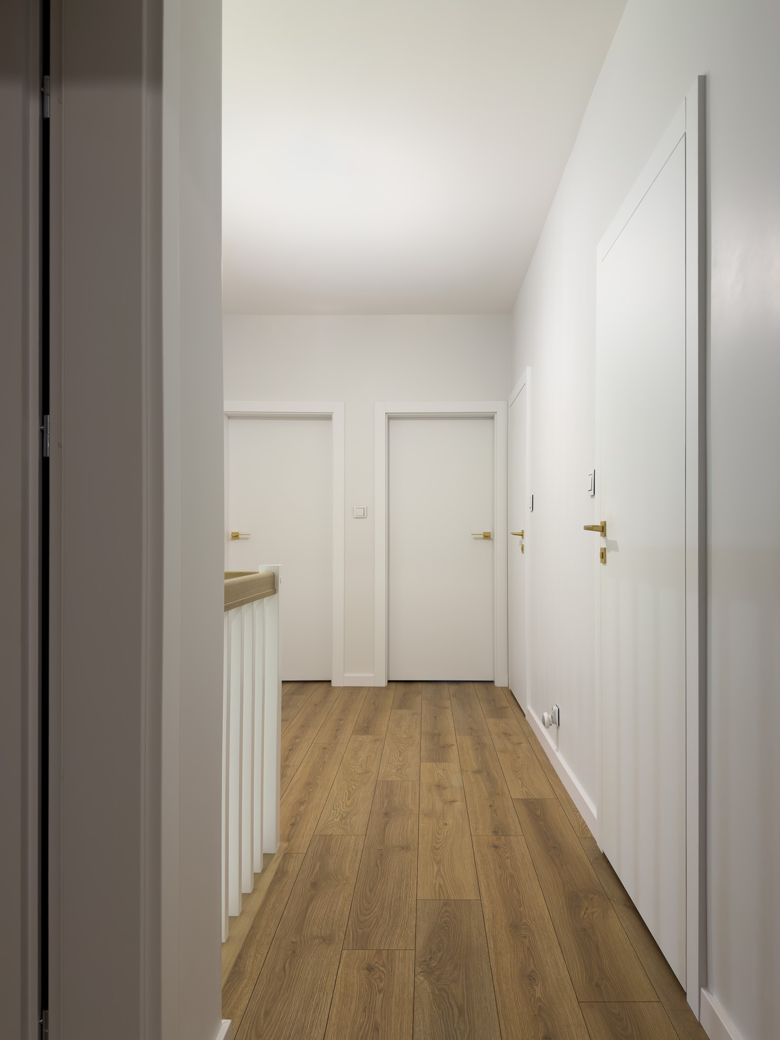 Na piętrze, w części intymnej, dominuje prostota i spokój. Gładkie, białe drzwi ze złotymi klamkami oraz dębowa podłoga w naturalnym odcieniu stanowią tło sprzyjające wyciszeniu i odpoczynkowi.