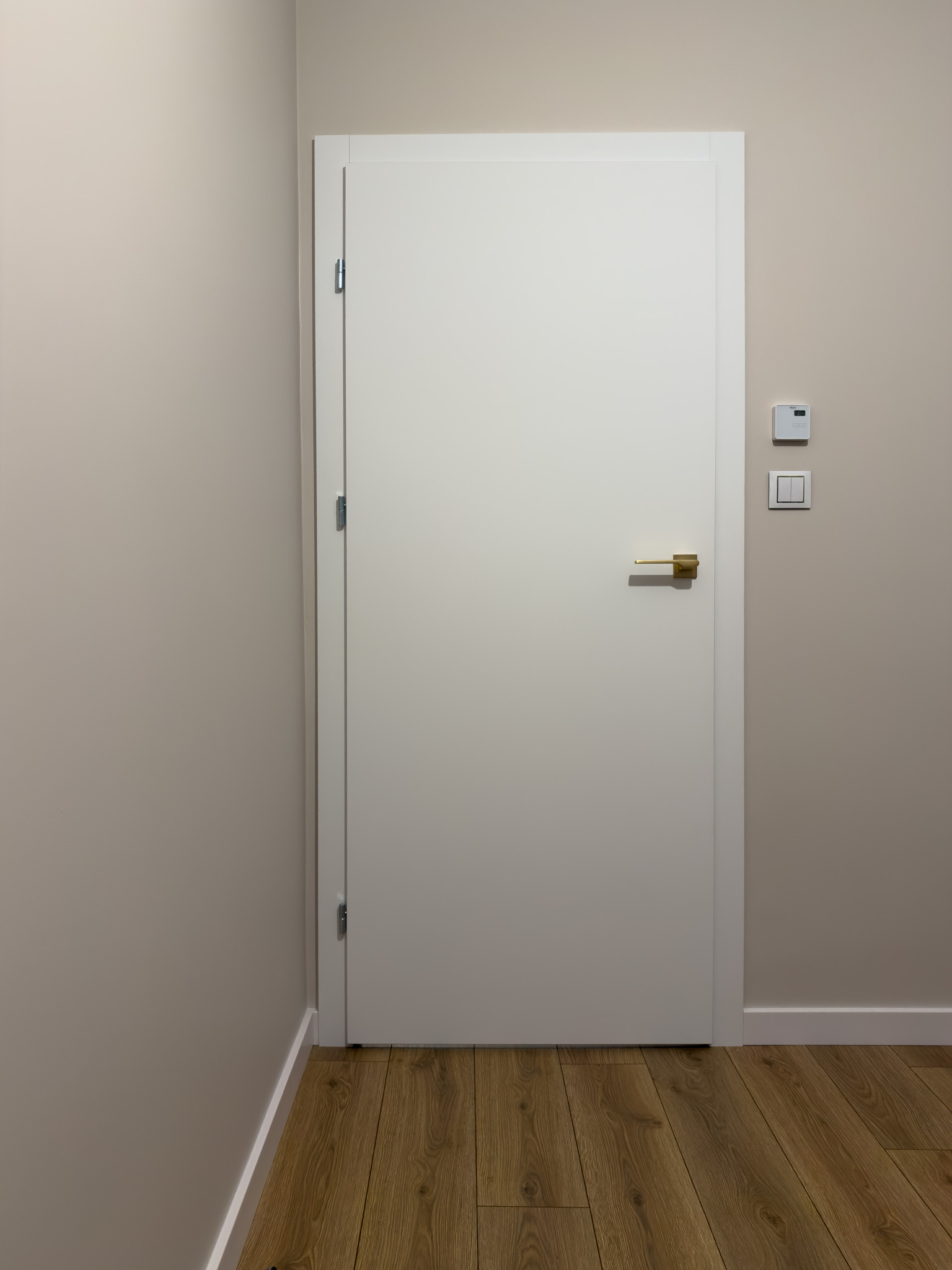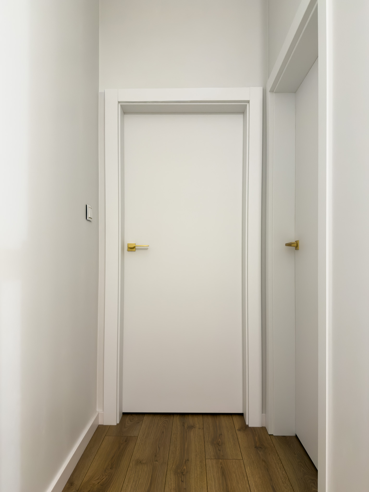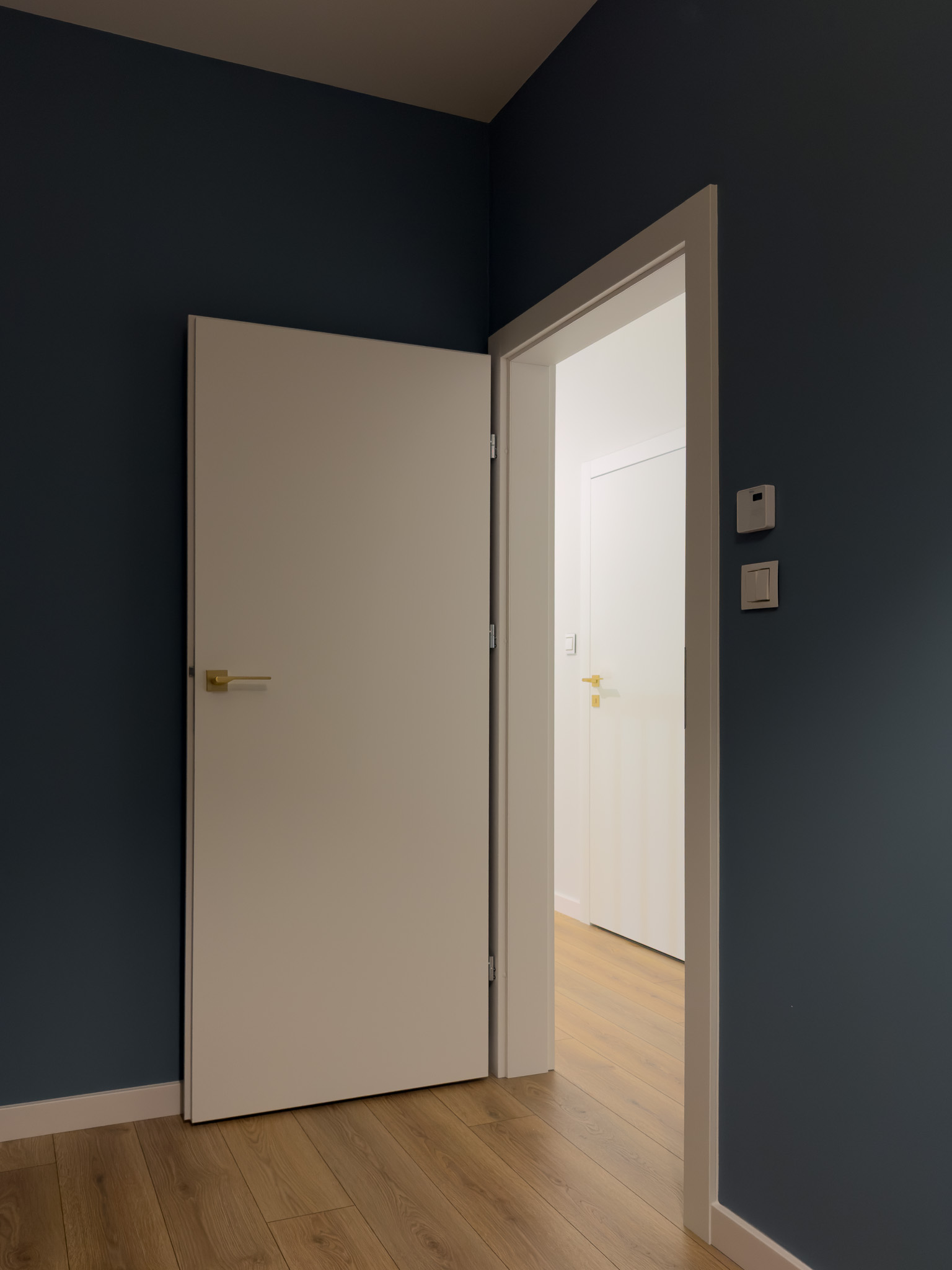 Na piętrze, w części intymnej, dominuje prostota i spokój. Gładkie, białe drzwi ze złotymi klamkami oraz dębowa podłoga w naturalnym odcieniu stanowią tło sprzyjające wyciszeniu i odpoczynkowi.