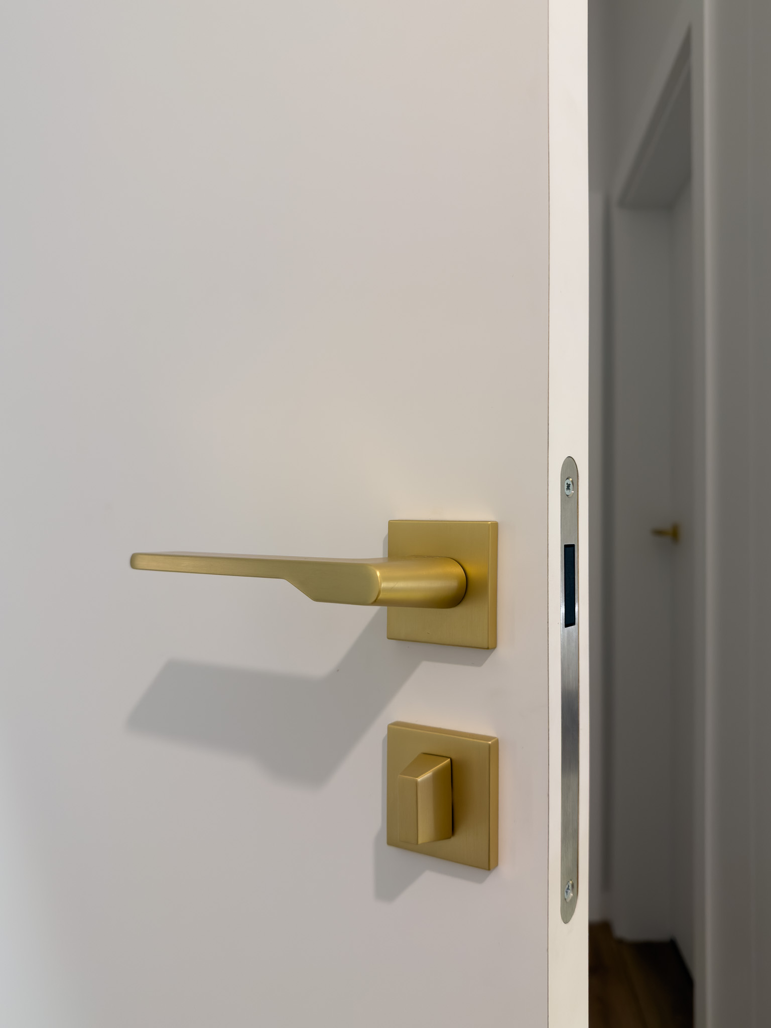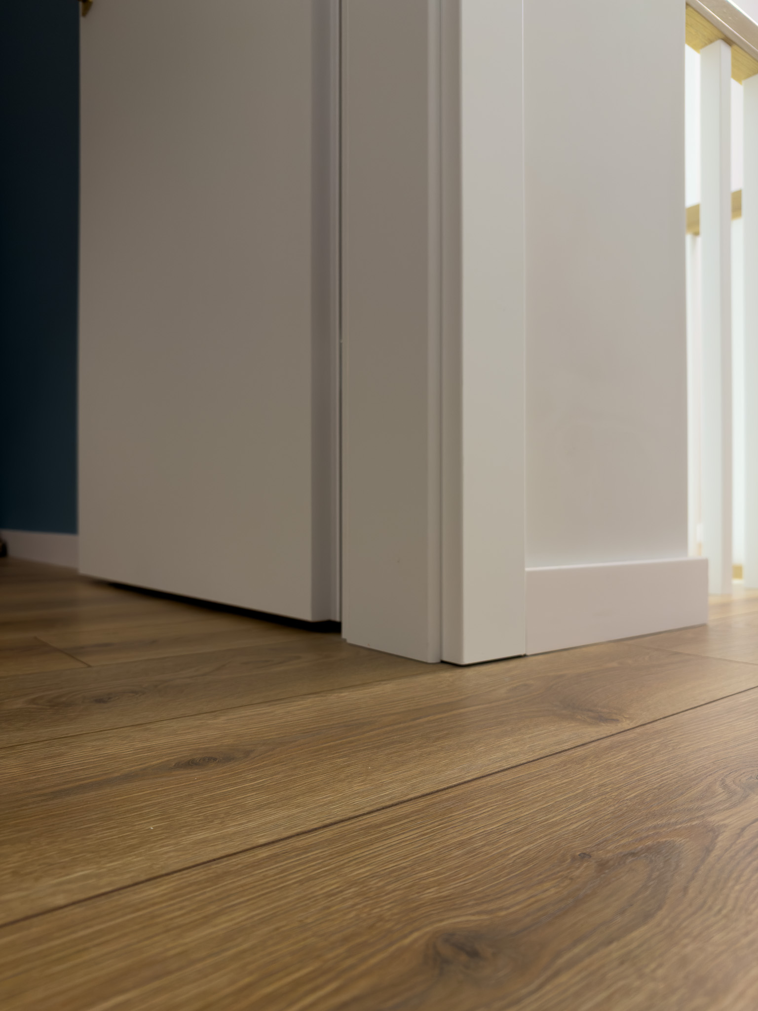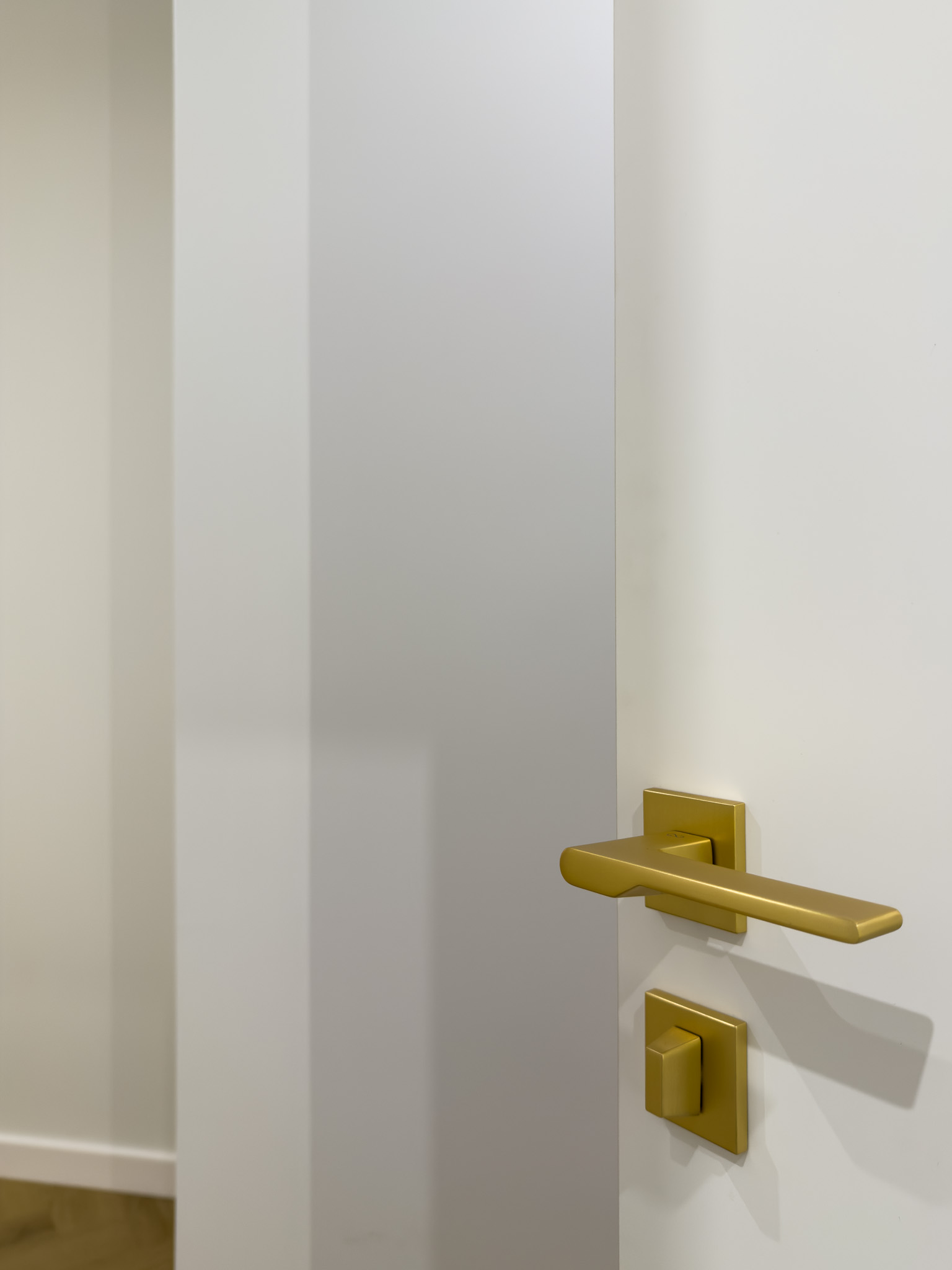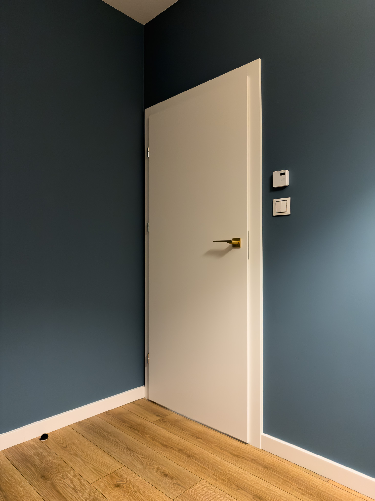 Na piętrze, w części intymnej, dominuje prostota i spokój. Gładkie, białe drzwi ze złotymi klamkami oraz dębowa podłoga w naturalnym odcieniu stanowią tło sprzyjające wyciszeniu i odpoczynkowi.