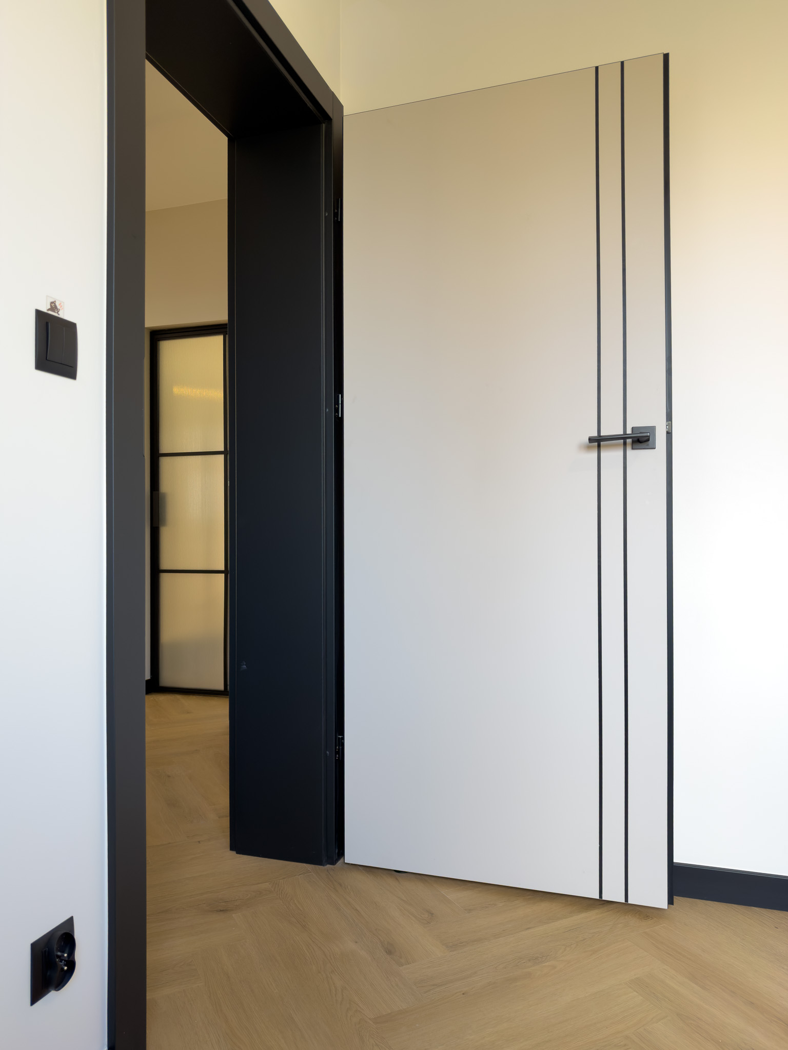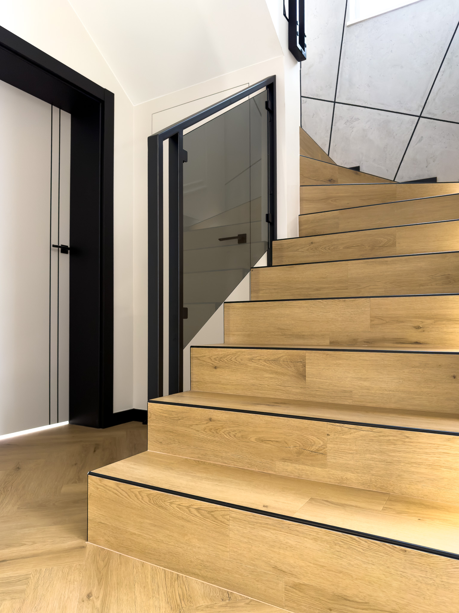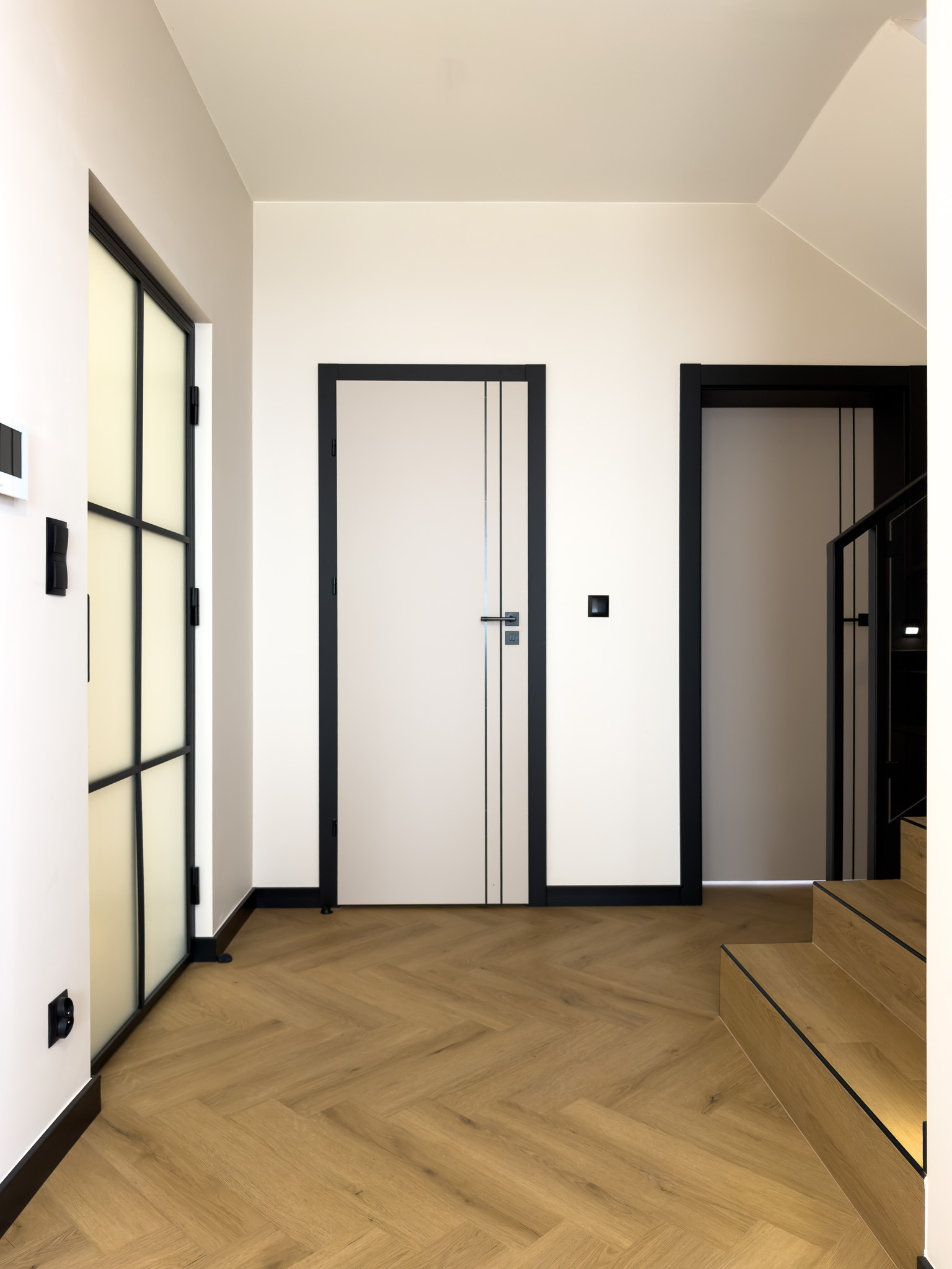 Czarne ościeżnice drzwi i pionowe intarsje na skrzydłach. Geometryczne podziały na betonowej ścianie przy schodach. Klasyczna jodełka na podłodze, która jest niczym innym jak zbiorem przecinających się linii. Otwarta przestrzeń. Brak dylatacji, czyli linii podziału pomiędzy pomieszczeniami. Drzwi ukryte w miejscu, gdzie minimalistyczny akcent porządkuje przestrzeń. Czarne noski na schodach będące dodatkowym elementem graficznym. Szklane drzwi do wiatrołapu w linie pionowe, podobnie jak fronty meblowe.