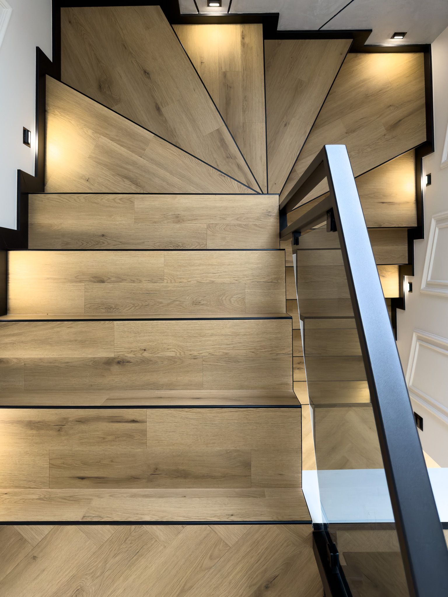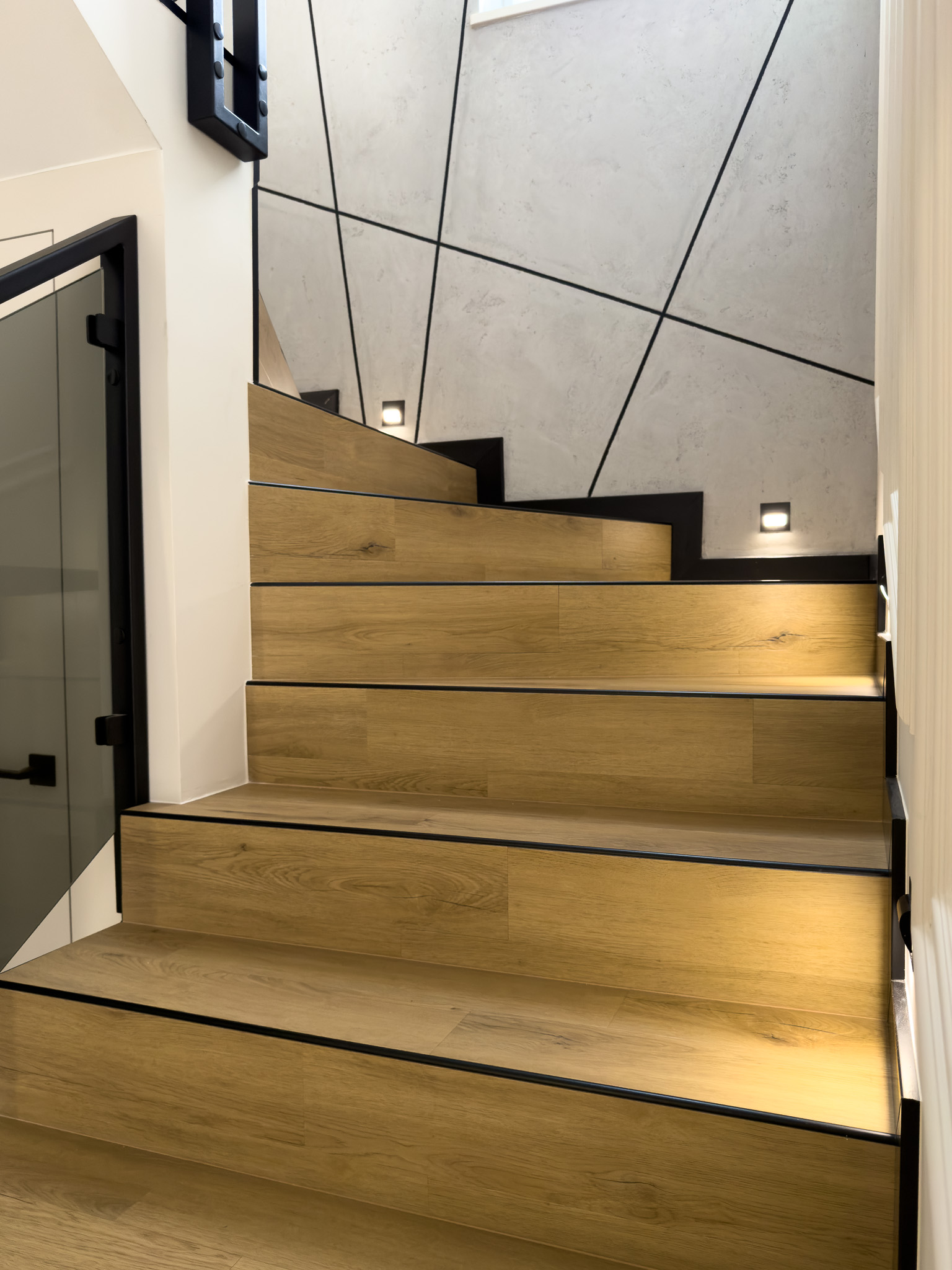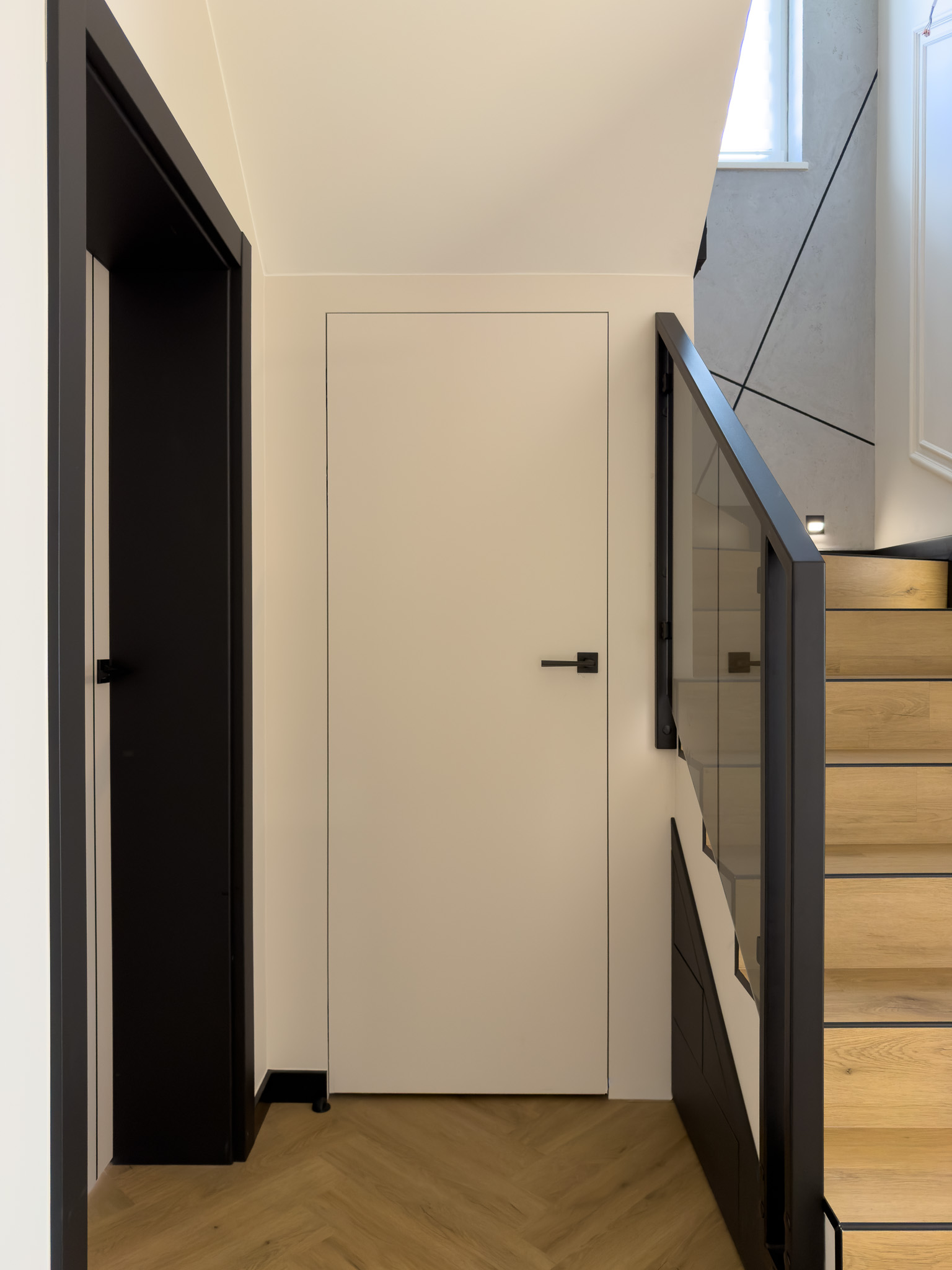 Czarne ościeżnice drzwi i pionowe intarsje na skrzydłach. Geometryczne podziały na betonowej ścianie przy schodach. Klasyczna jodełka na podłodze, która jest niczym innym jak zbiorem przecinających się linii. Otwarta przestrzeń. Brak dylatacji, czyli linii podziału pomiędzy pomieszczeniami. Drzwi ukryte w miejscu, gdzie minimalistyczny akcent porządkuje przestrzeń. Czarne noski na schodach będące dodatkowym elementem graficznym. Szklane drzwi do wiatrołapu w linie pionowe, podobnie jak fronty meblowe.