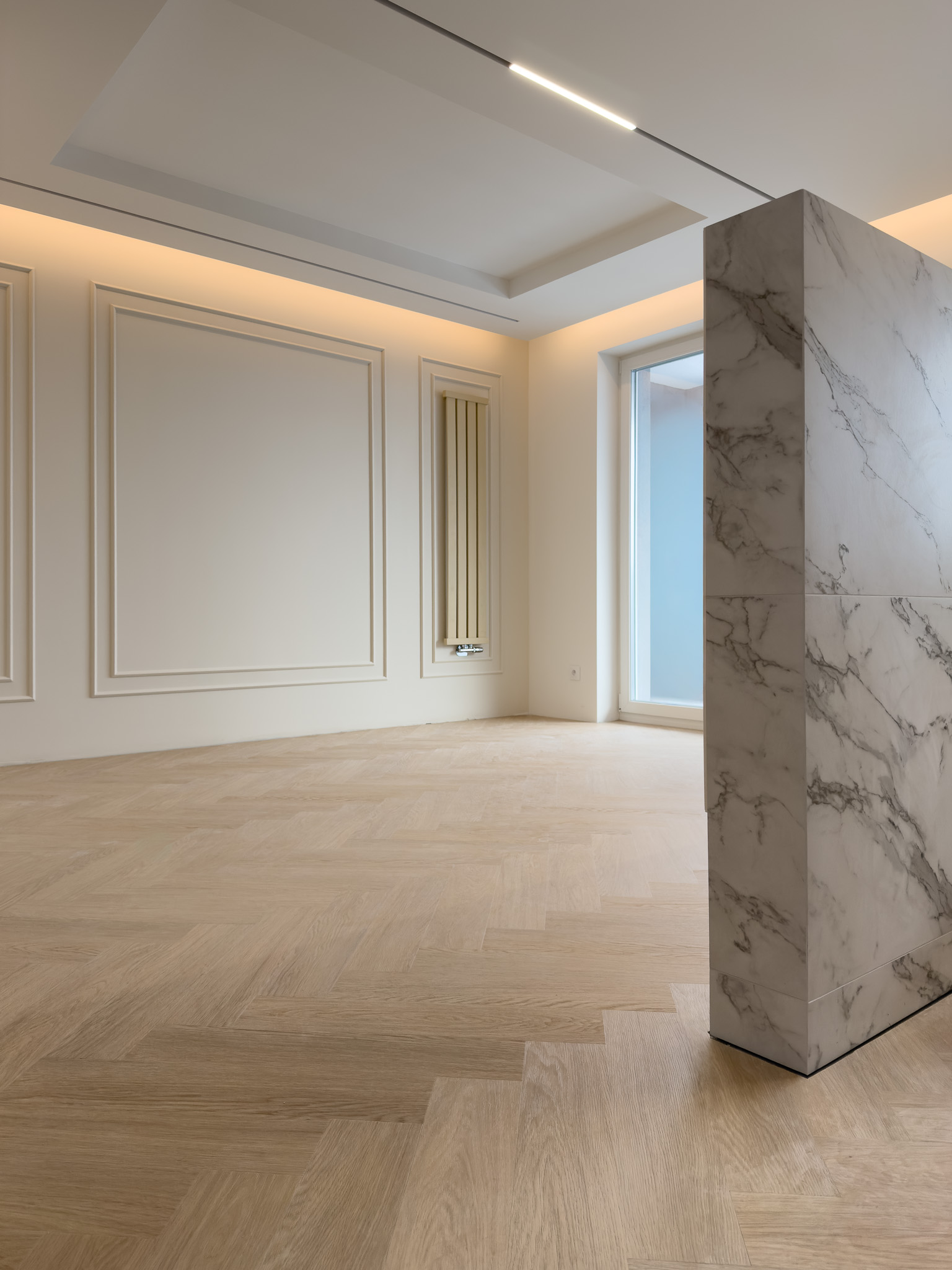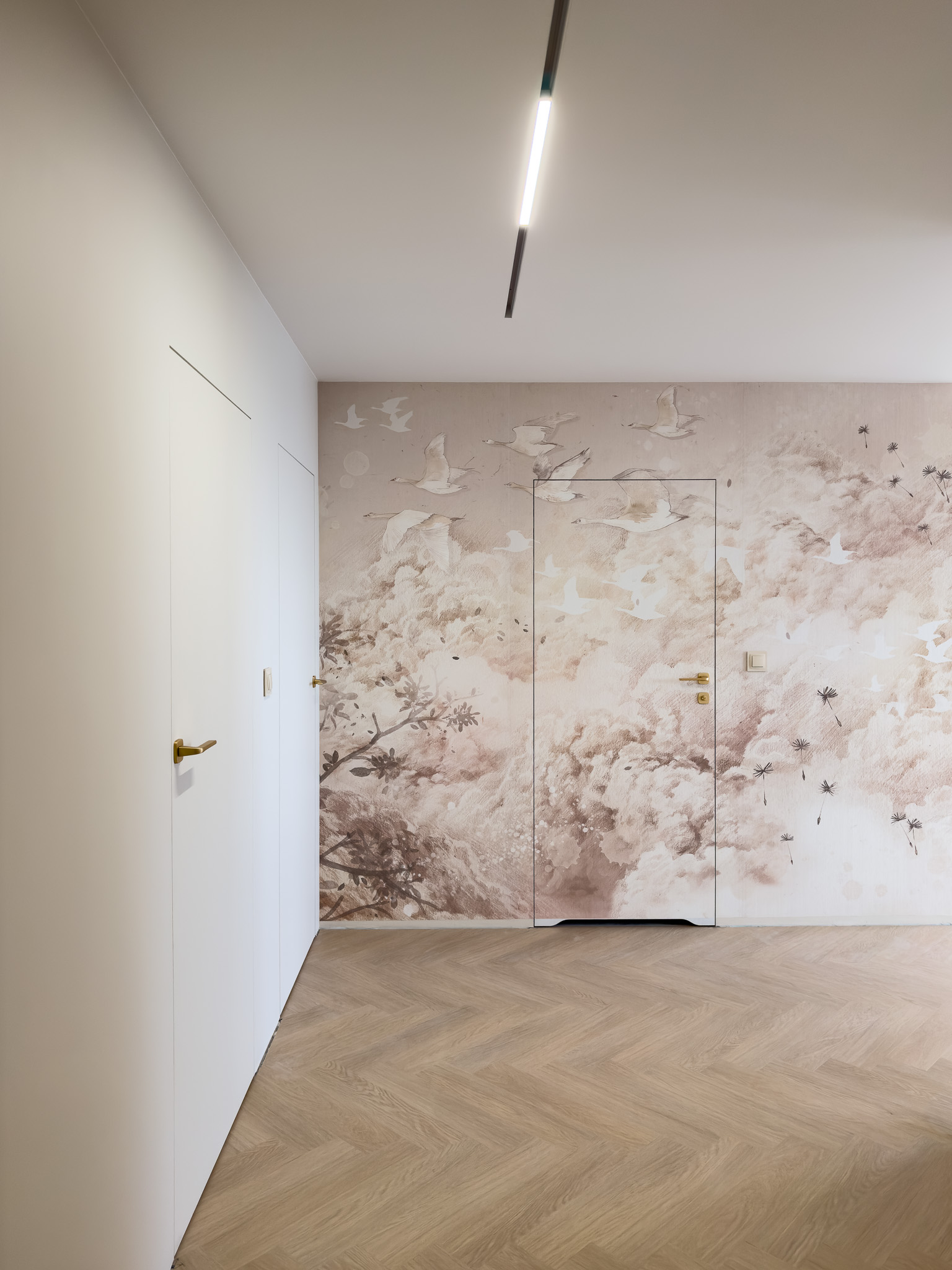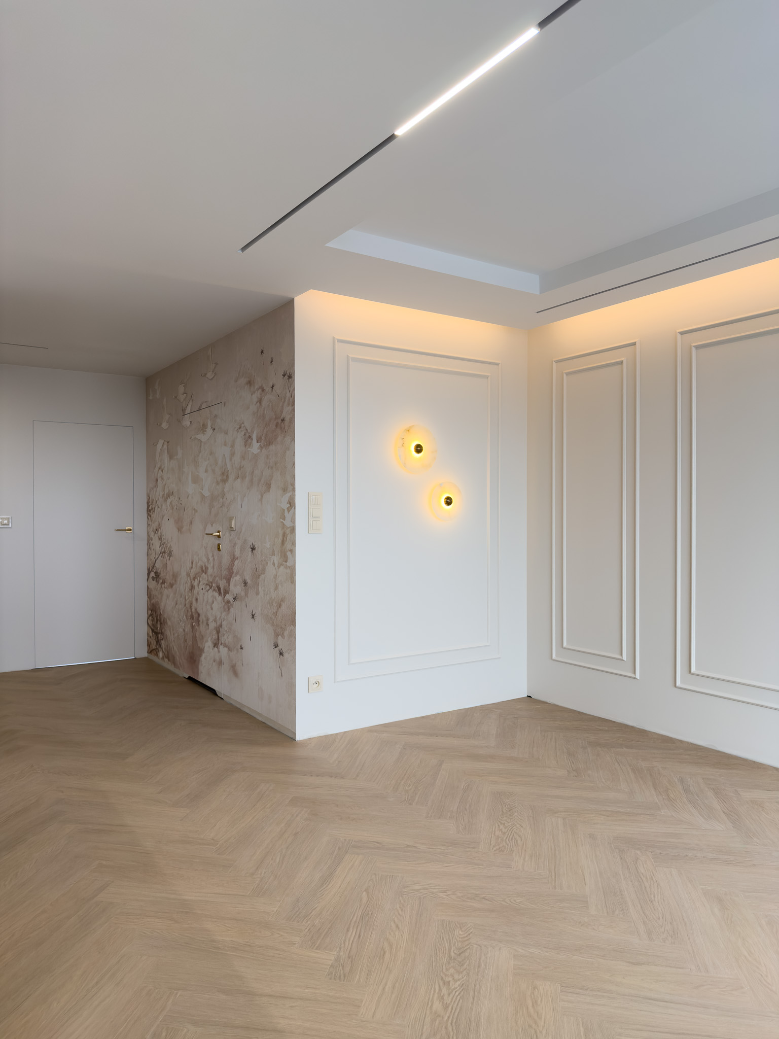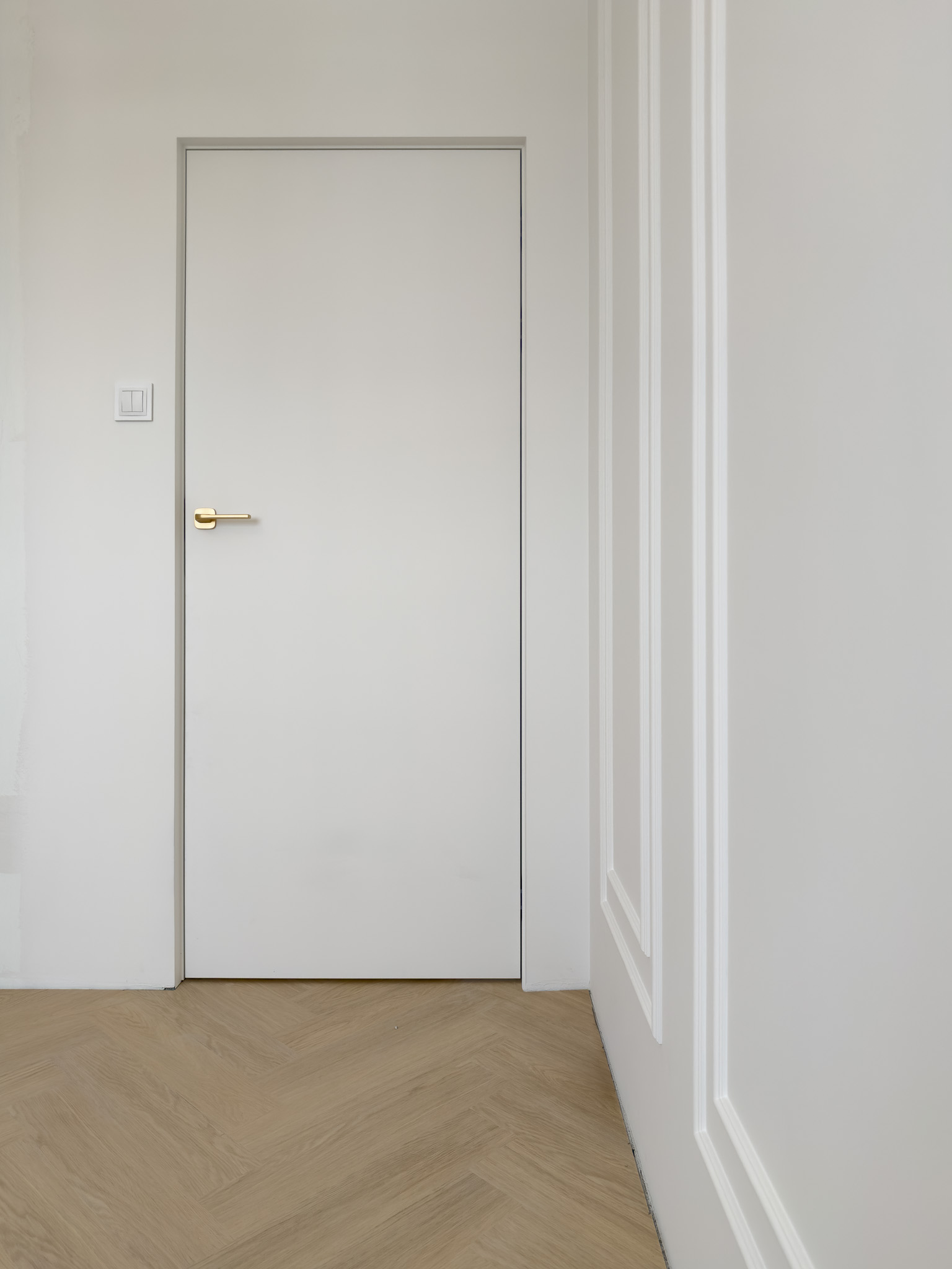 Kwintesencja stylu modern classic. Bazę tworzy jasna dębowa podłoga w układzie jodełki klasycznej, która dodaje wnętrzu klasy i ciepła. Ściany zdobi subtelna sztukateria, nadająca całości rytm i paryski szyk. Nowoczesność podkreślają ukryte drzwi: zlicowane ze ścianą, malowane lub pokryte fototapetą, stają się niemal niewidoczne, tworząc jednolitą płaszczyznę. Całość dopełniają złote detale oraz gra światła, budując przestrzeń pełną harmonii.