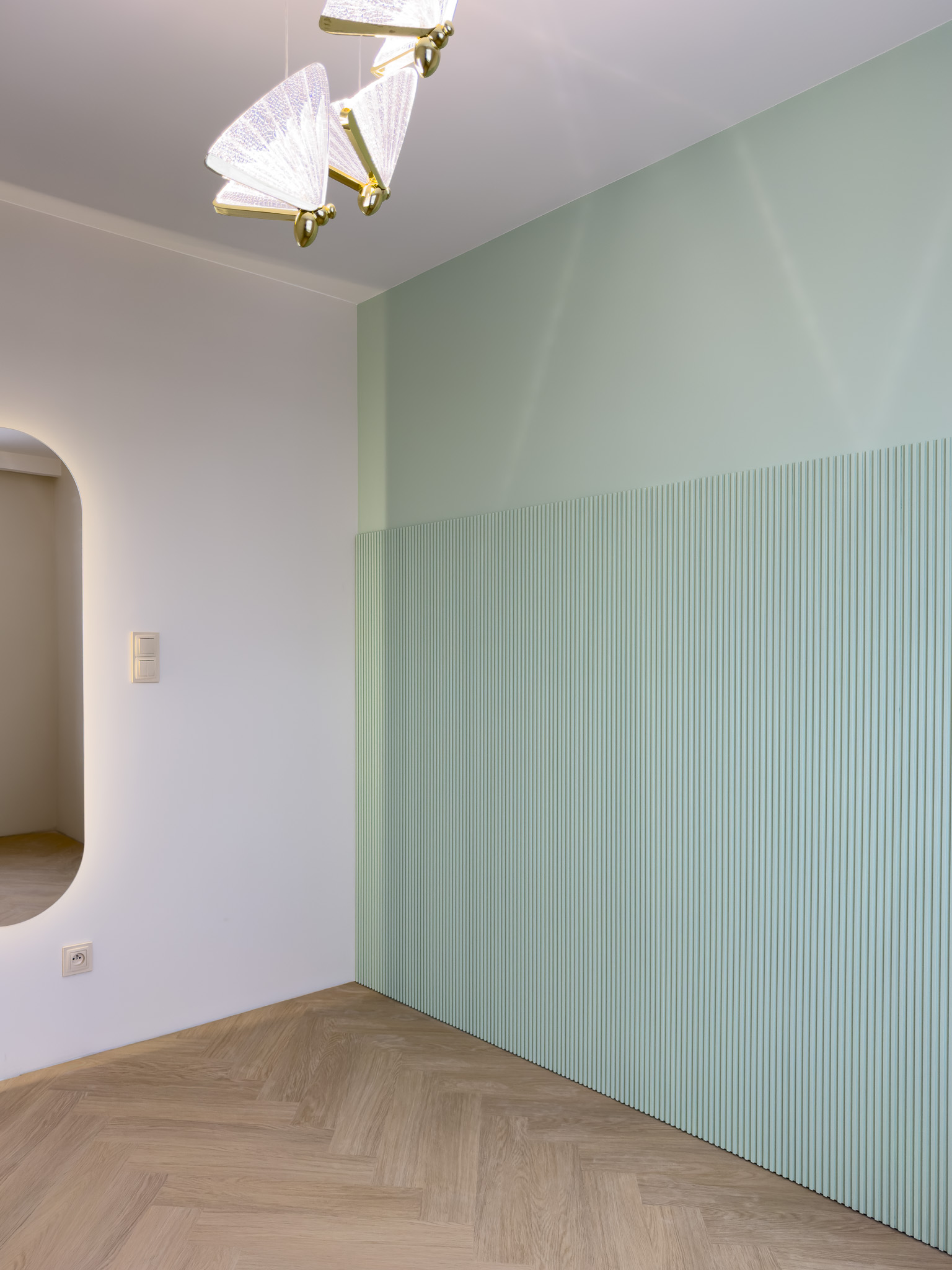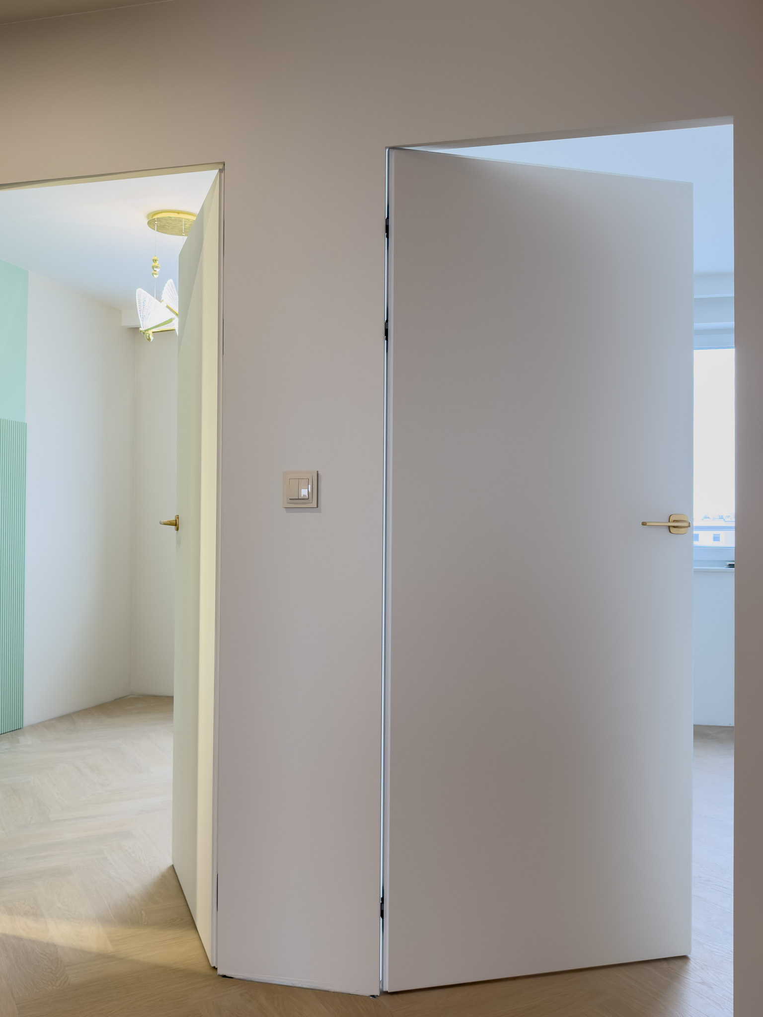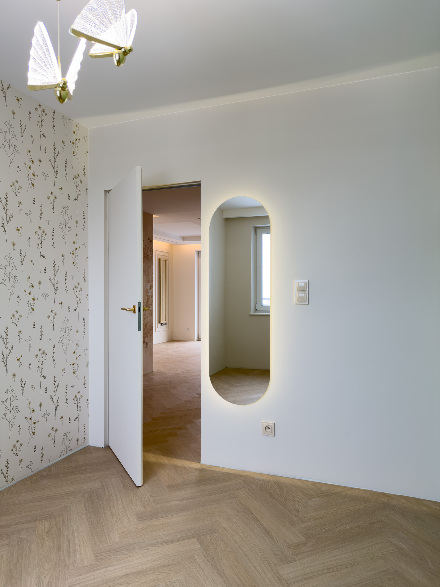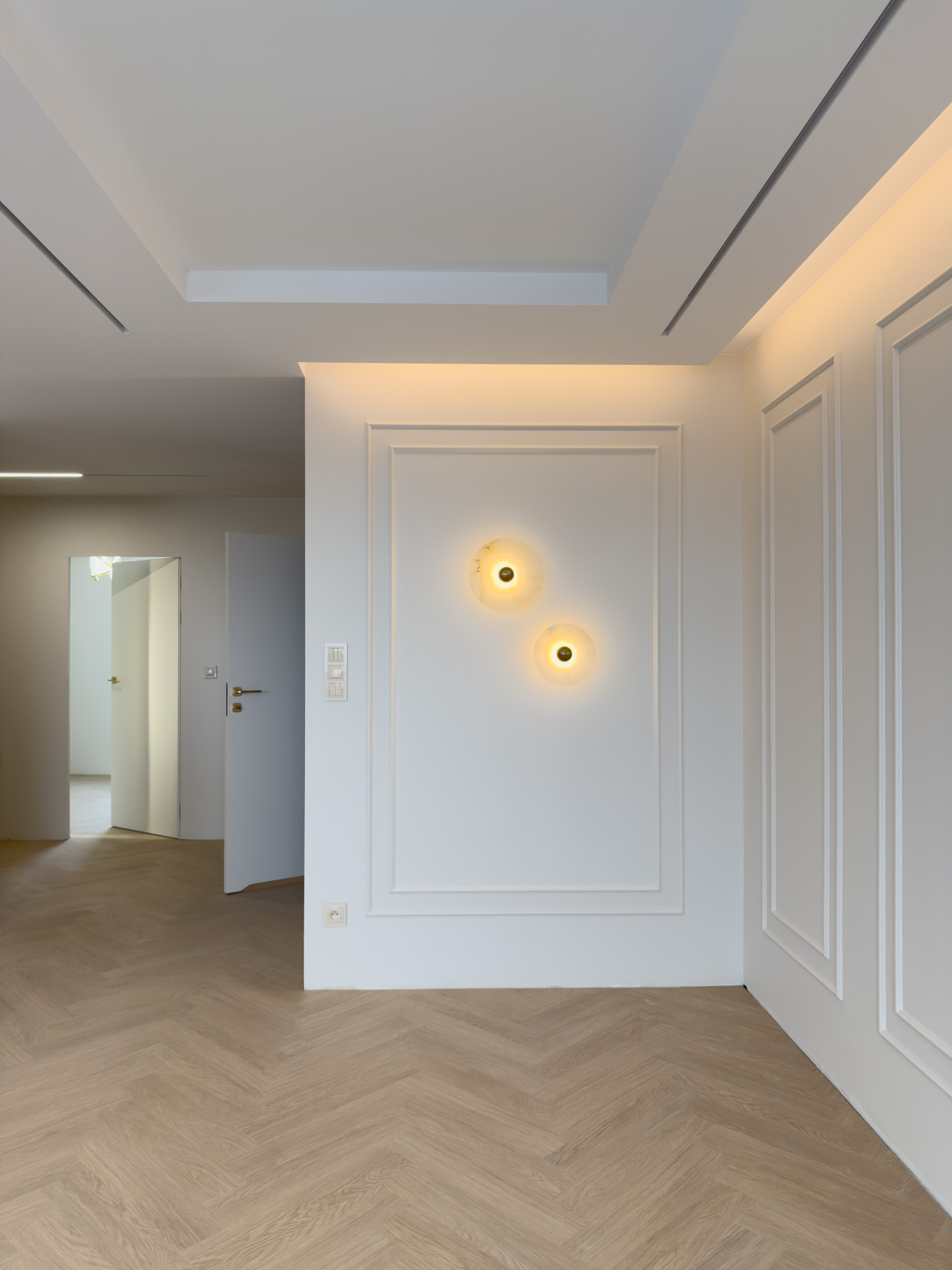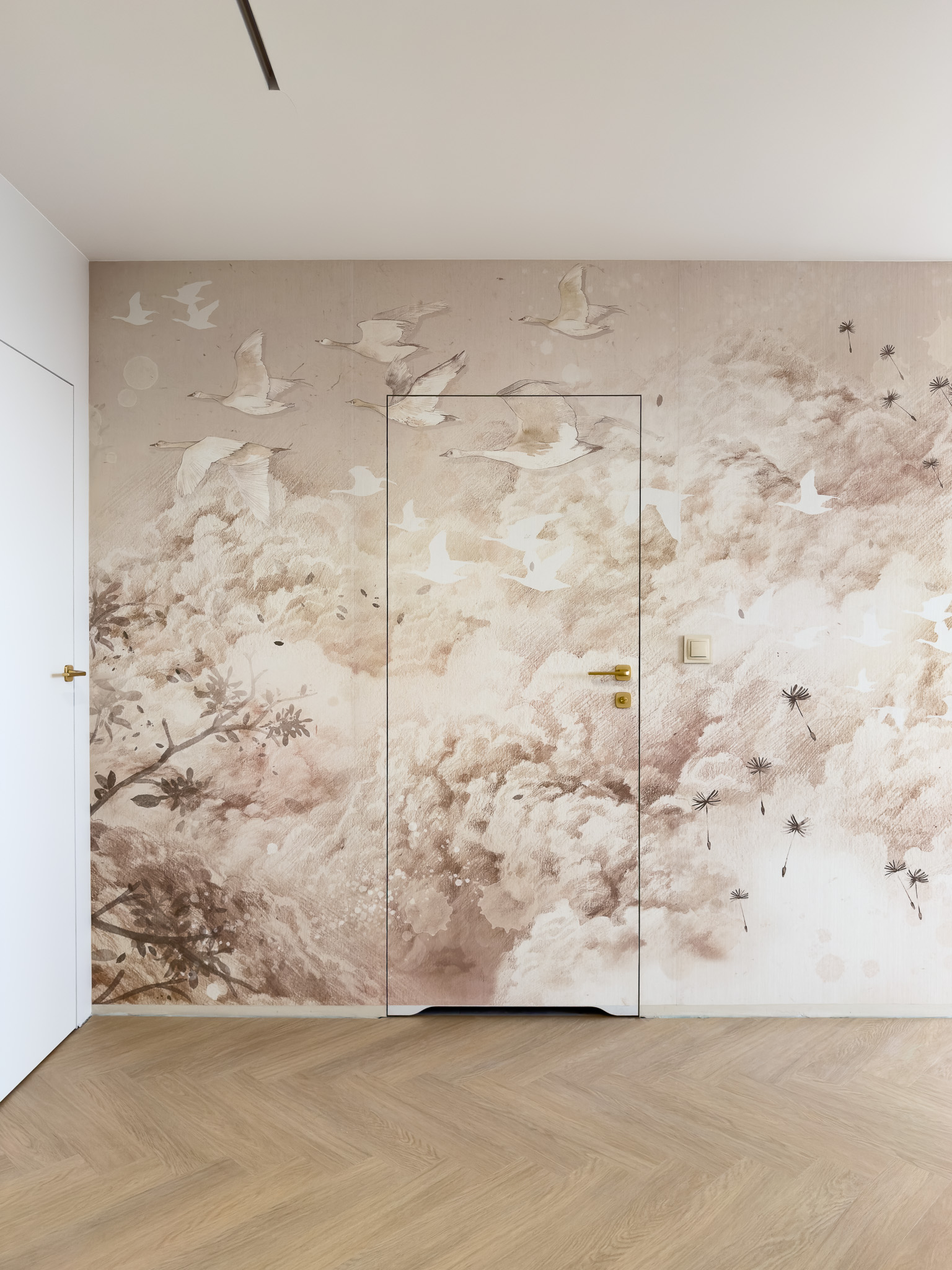 Kwintesencja stylu modern classic. Bazę tworzy jasna dębowa podłoga w układzie jodełki klasycznej, która dodaje wnętrzu klasy i ciepła. Ściany zdobi subtelna sztukateria, nadająca całości rytm i paryski szyk. Nowoczesność podkreślają ukryte drzwi: zlicowane ze ścianą, malowane lub pokryte fototapetą, stają się niemal niewidoczne, tworząc jednolitą płaszczyznę. Całość dopełniają złote detale oraz gra światła, budując przestrzeń pełną harmonii.