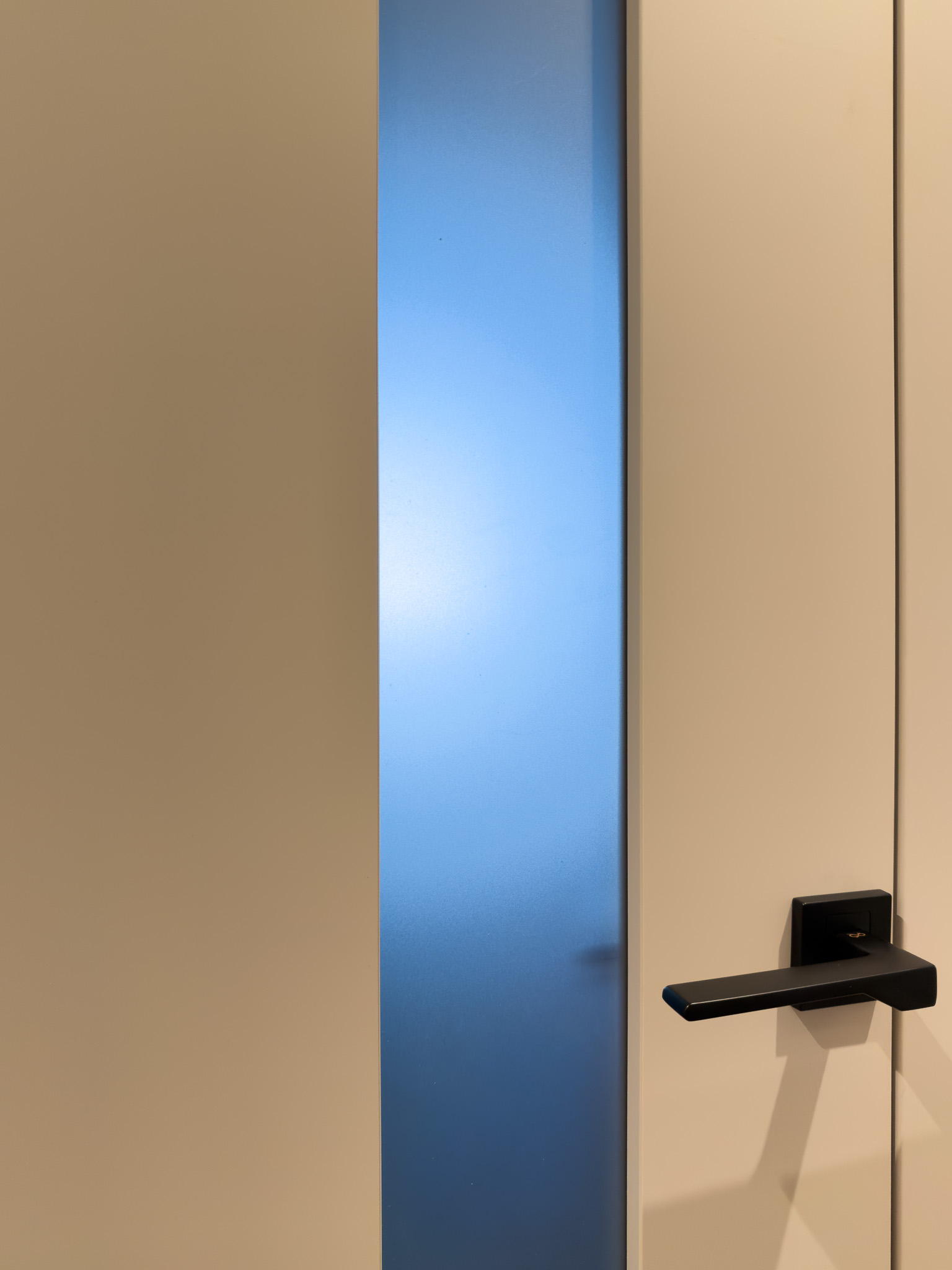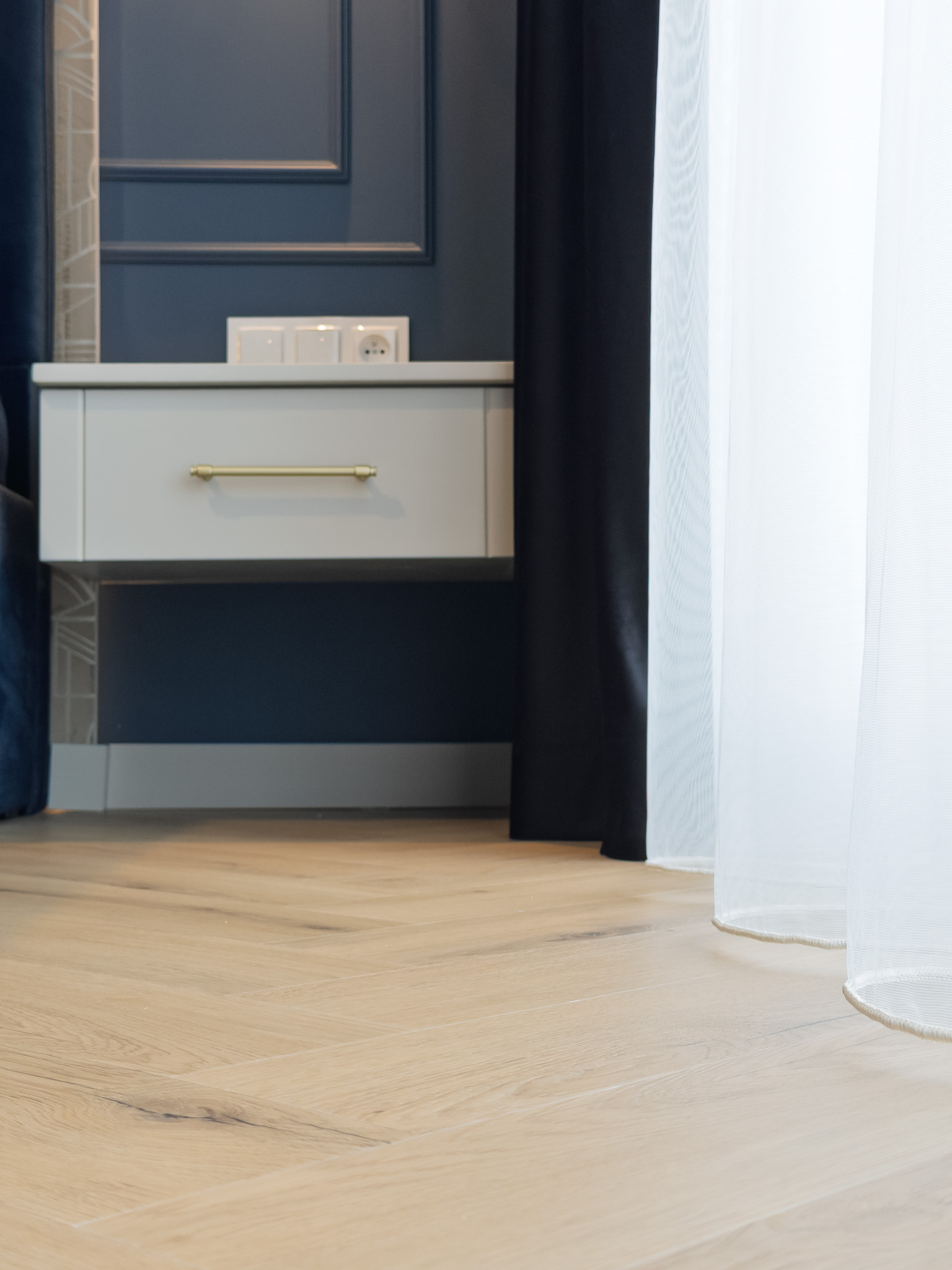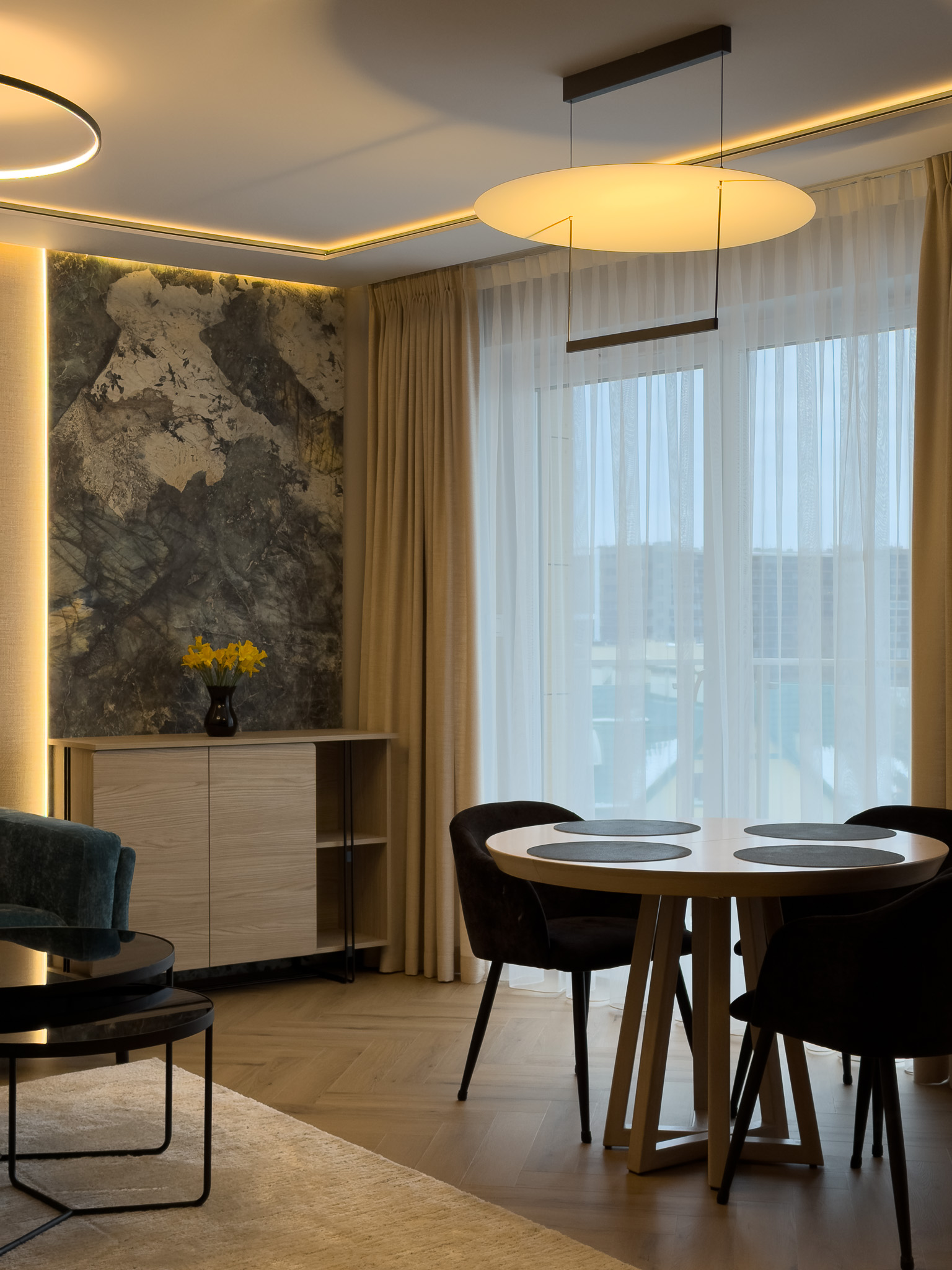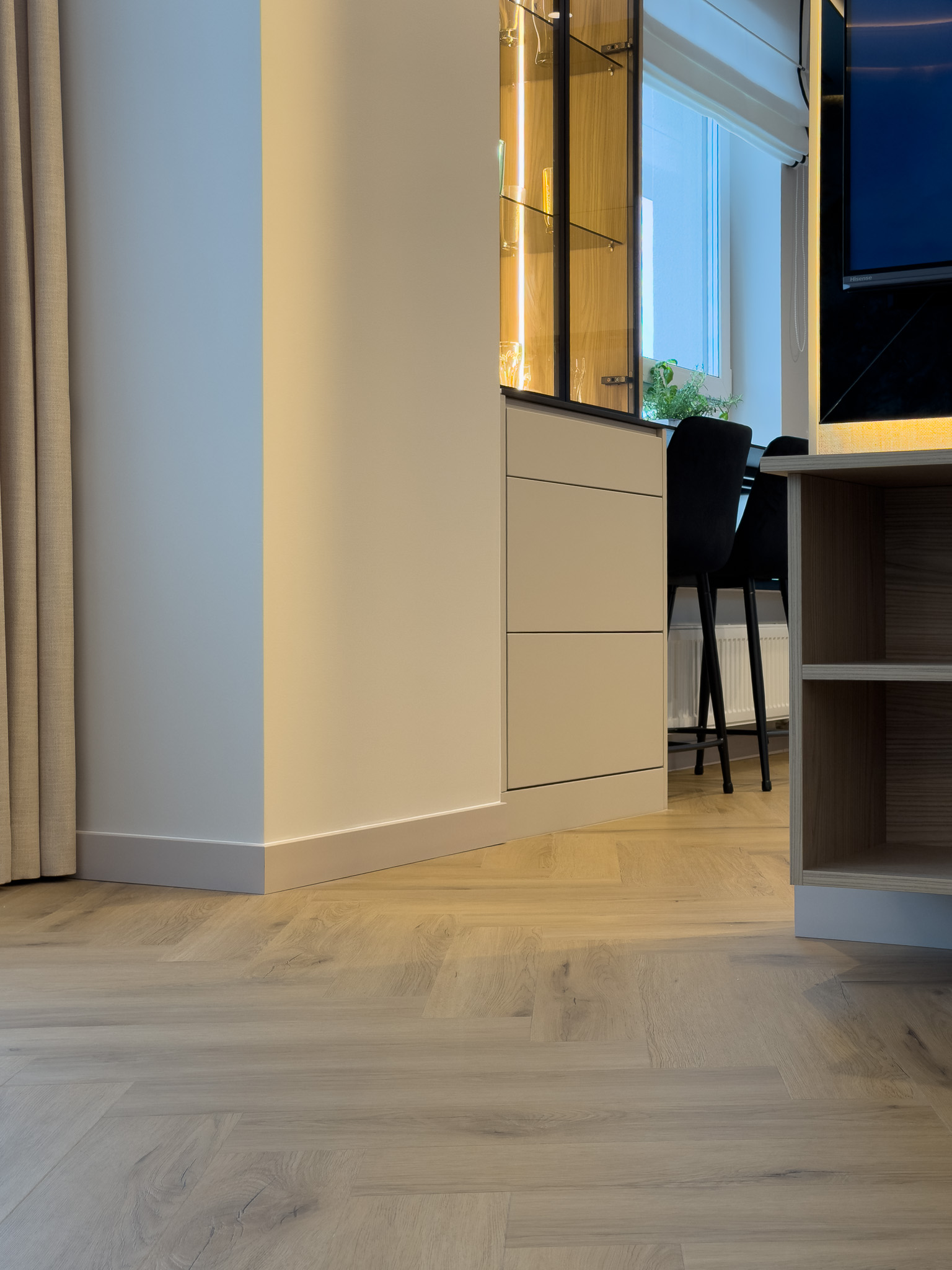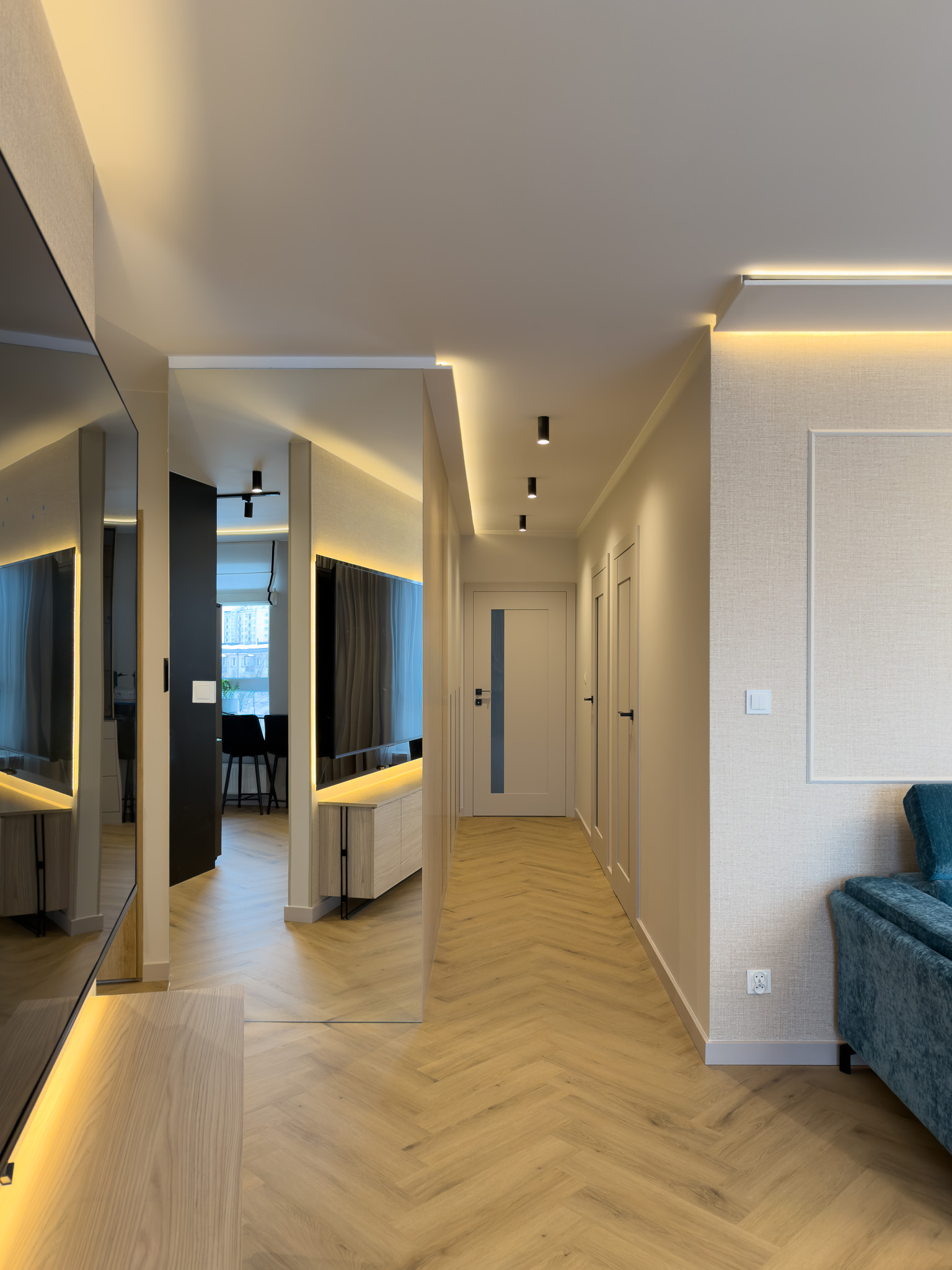 Połączenie minimalizmu oraz domowej przytulności. Czyste, proste formy meblowe i systemy drzwi bezprzylgowych zestawiono tu z klasyczną jodełką oraz luksusowym wykończeniem w postaci sztukaterii i rozbudowanej architektury światła.