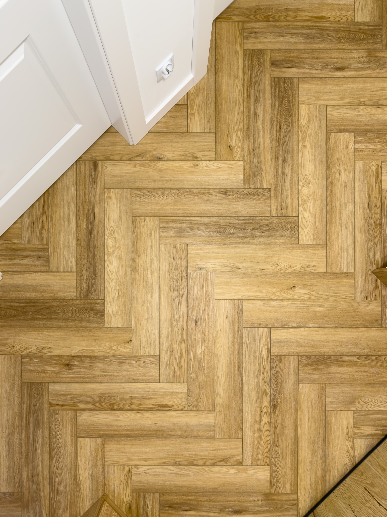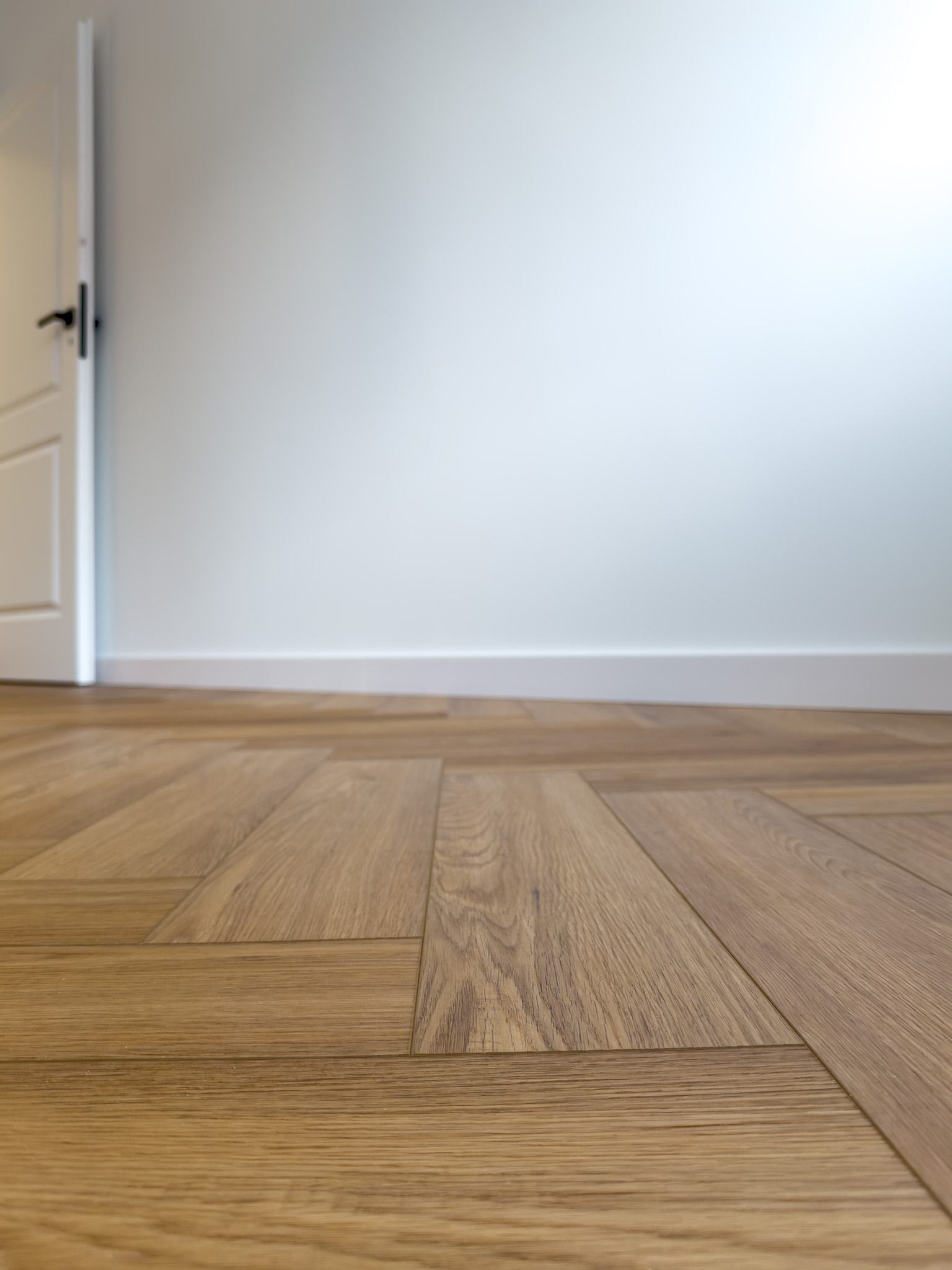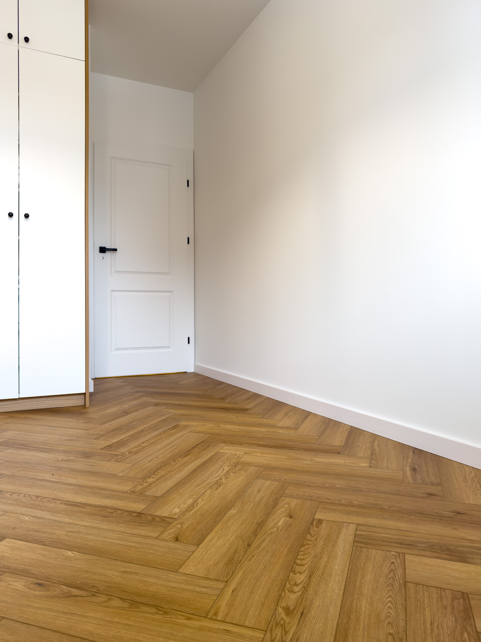 Podłoga montowana w systemie klejonym, co umożliwiło ułożenie jej bez konieczności stosowania dylatacji w przejściach między pomieszczeniami, przy jednoczesnym zachowaniu pełnej gwarancji producenta.