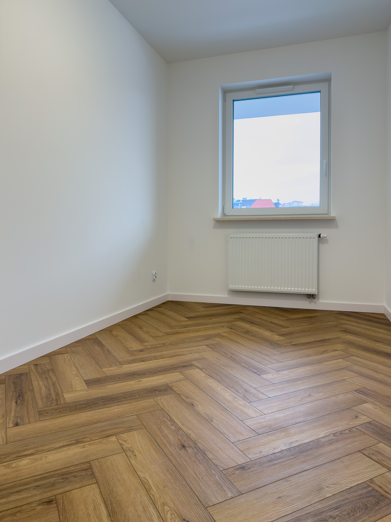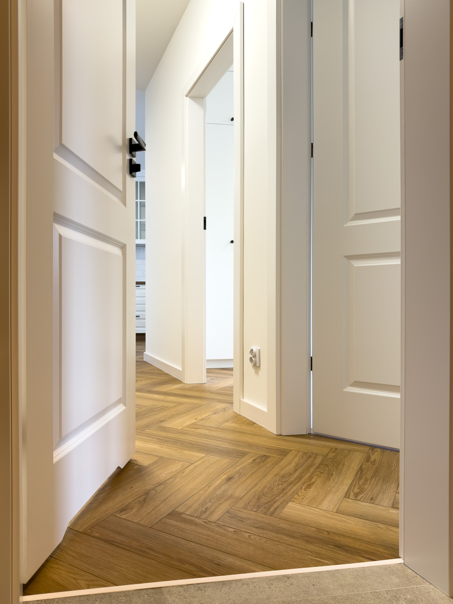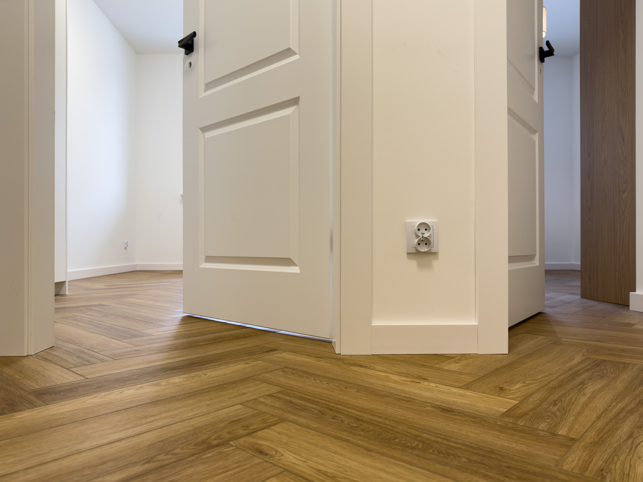 Podłoga montowana w systemie klejonym, co umożliwiło ułożenie jej bez konieczności stosowania dylatacji w przejściach między pomieszczeniami, przy jednoczesnym zachowaniu pełnej gwarancji producenta.