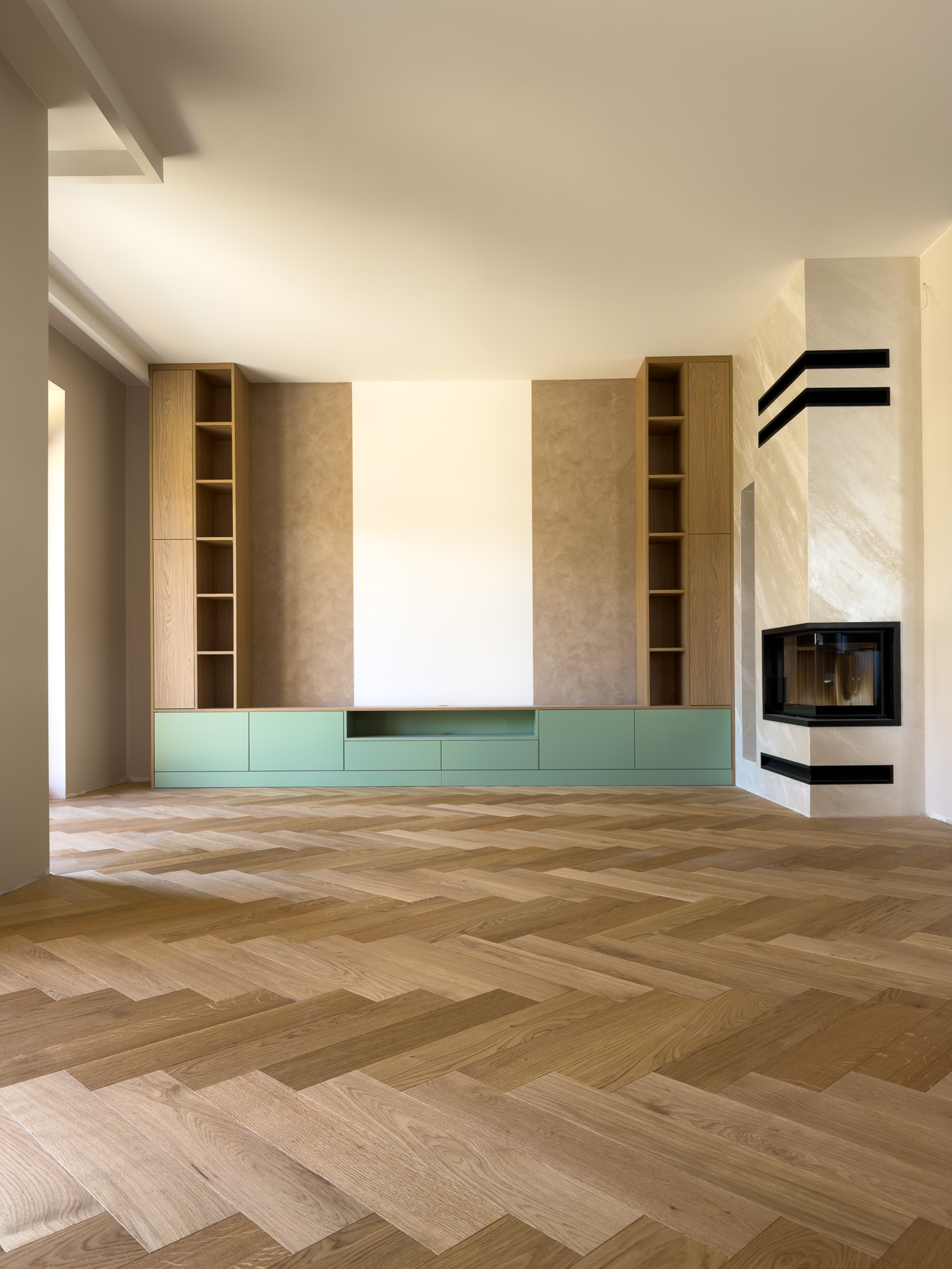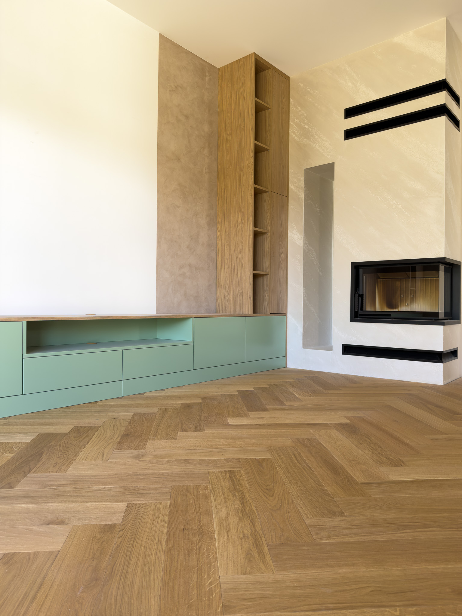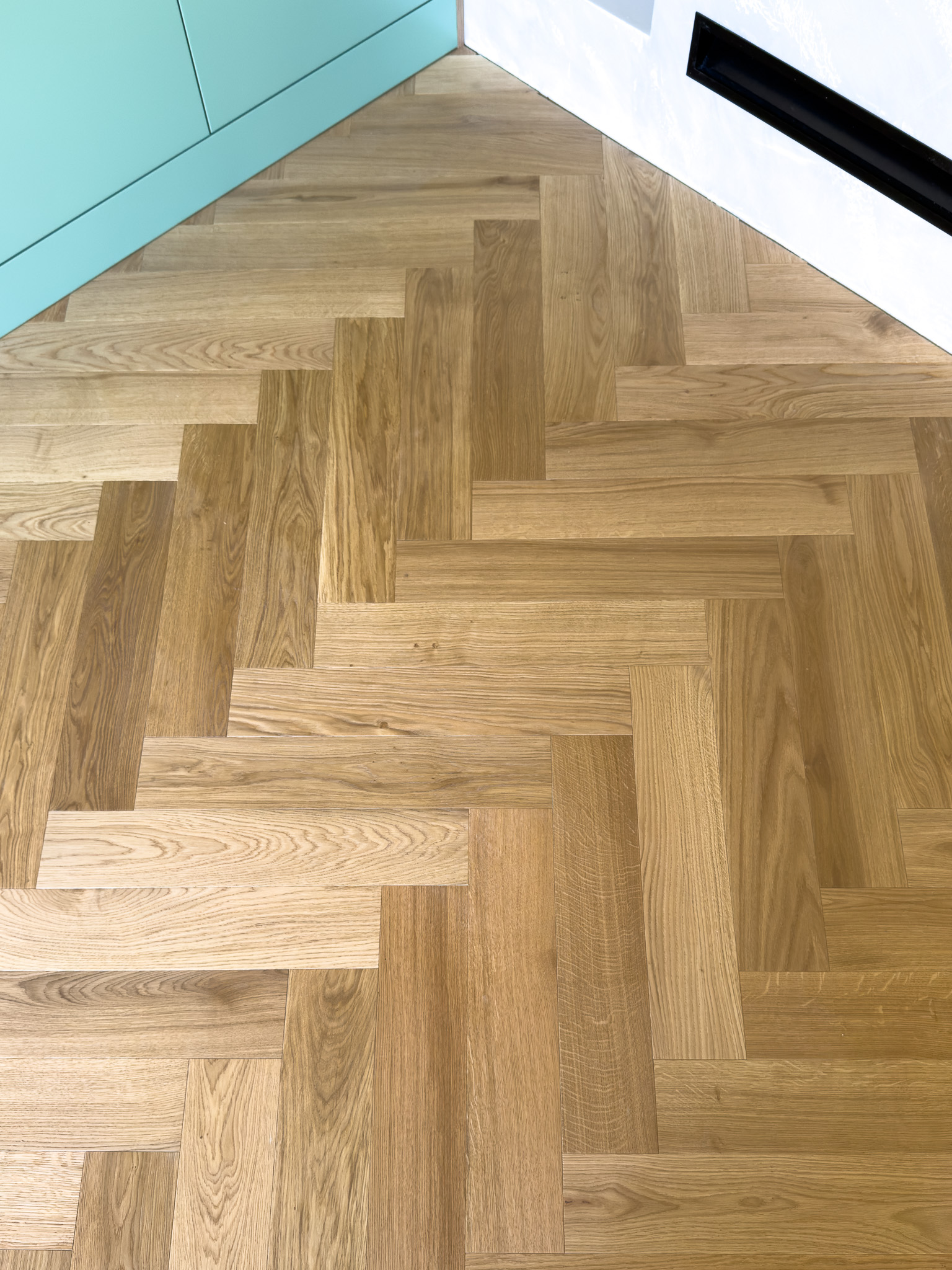 Podłoga z litego drewna dębowego w układzie jodełki klasycznej to ponadczasowe rozwiązanie. Wykończenie olejem podkreśla naturalny charakter dębu oraz głębię jego usłojenia, nadając powierzchni ciepły, matowy wygląd. Klasa Rustical uwydatnia naturalne cechy drewna, takie jak drobne sęki i zróżnicowaną kolorystykę, dzięki czemu podłoga zyskuje autentyczny i niepowtarzalny charakter.