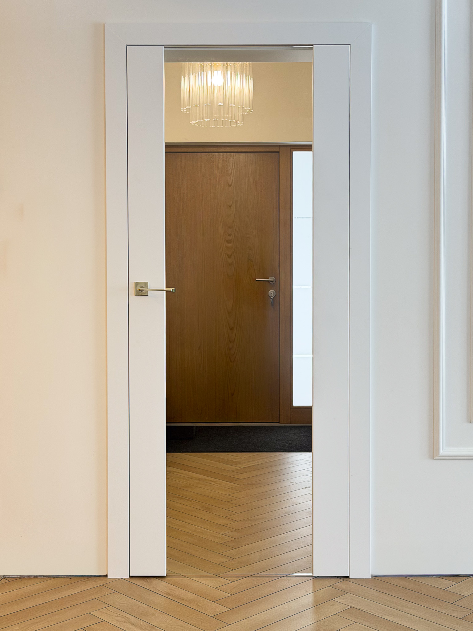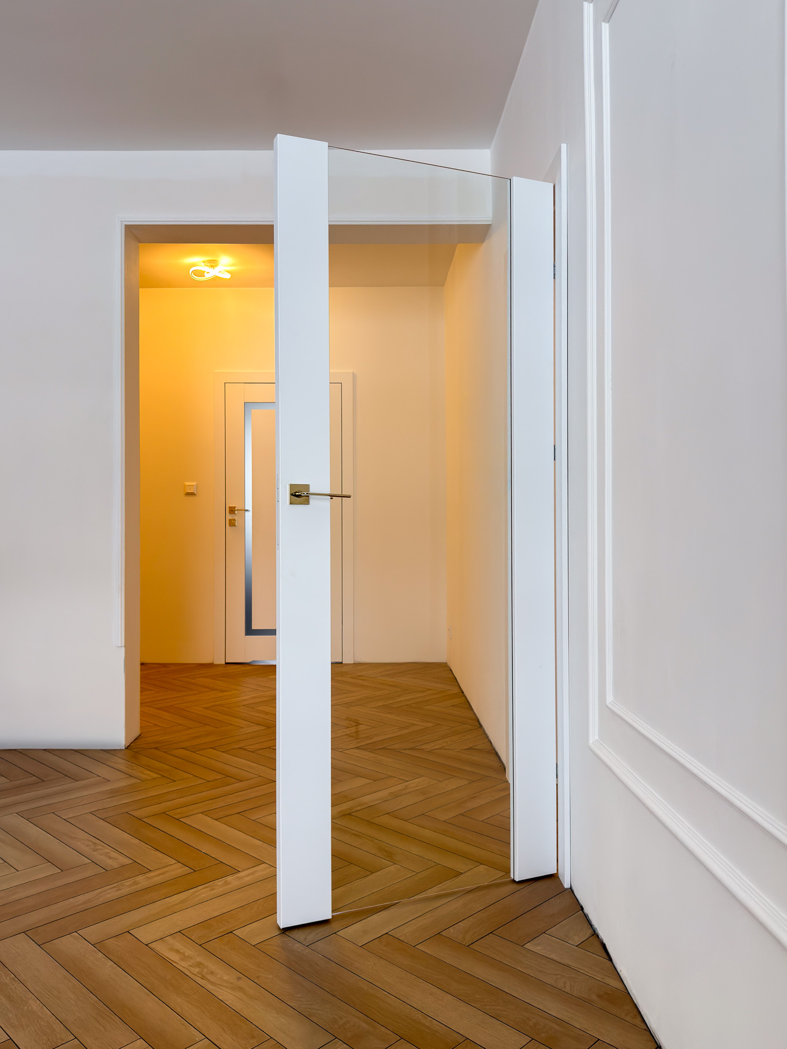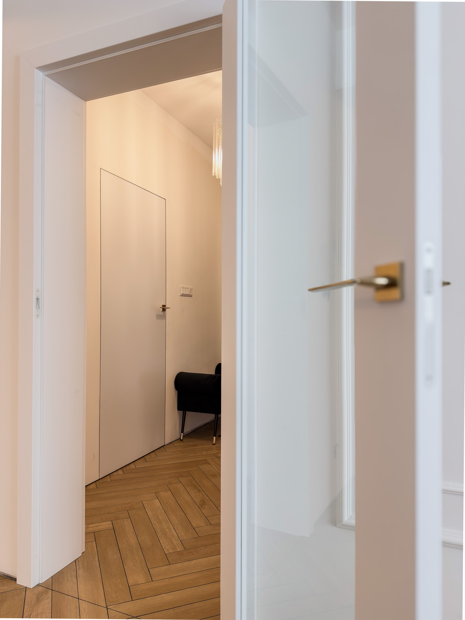 Trzy warianty bezprzylgowych drzwi. Mimo różnic konstrukcyjnych tworzą spójny układ, charakteryzujący się czystością formy. Zróżnicowane przeszklenia wprowadzają do wnętrza naturalne doświetlenie i lekkość, podczas gdy ukryte porządkują przestrzeń. Surową geometrię bieli i szkła przełamują delikatne, złote klamki.