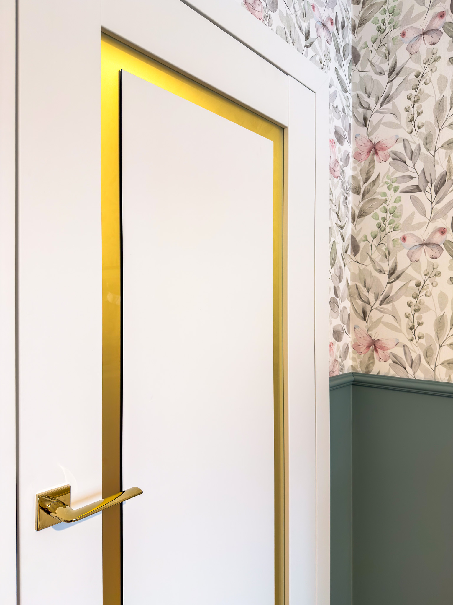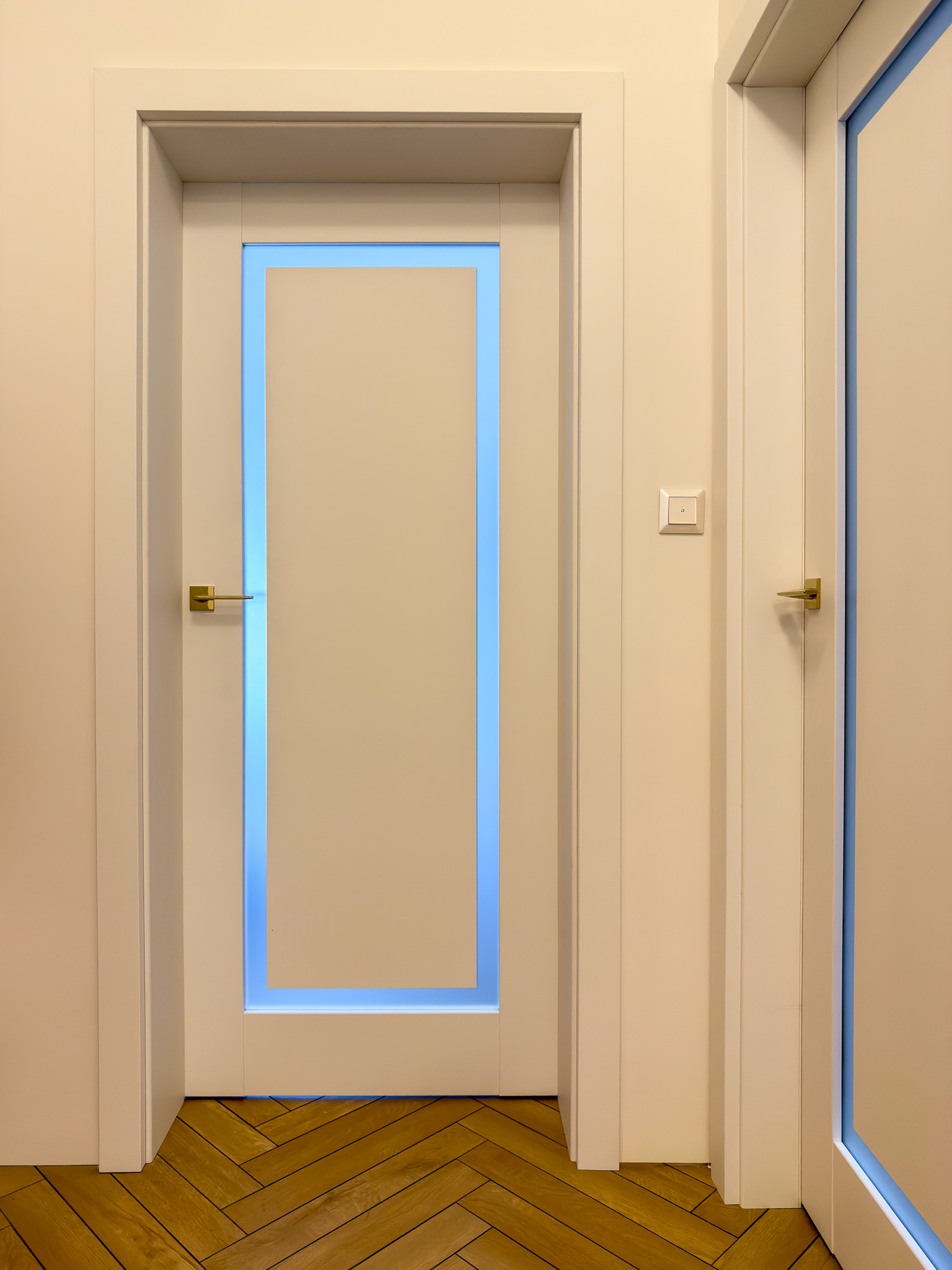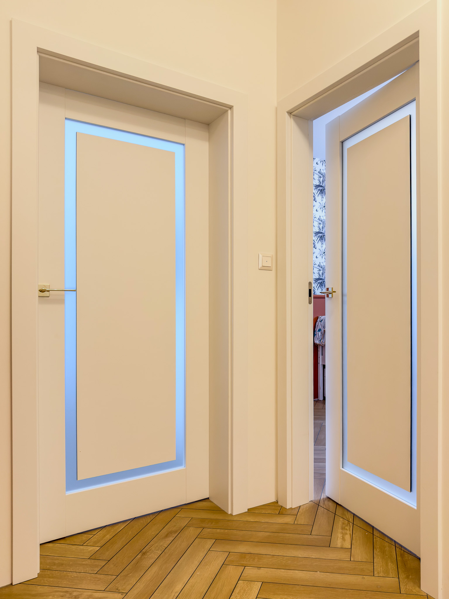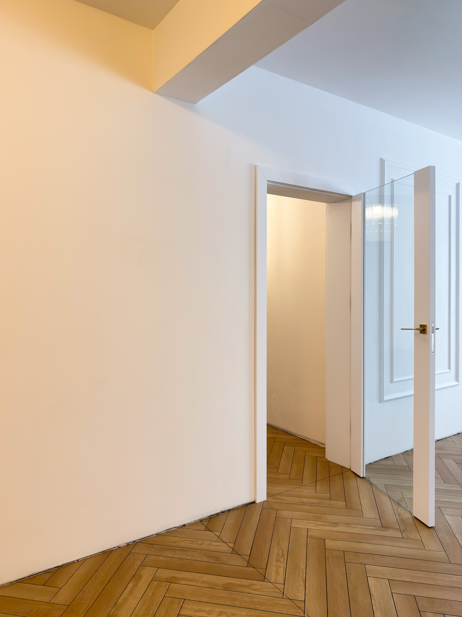 Trzy warianty bezprzylgowych drzwi. Mimo różnic konstrukcyjnych tworzą spójny układ, charakteryzujący się czystością formy. Zróżnicowane przeszklenia wprowadzają do wnętrza naturalne doświetlenie i lekkość, podczas gdy ukryte porządkują przestrzeń. Surową geometrię bieli i szkła przełamują delikatne, złote klamki.