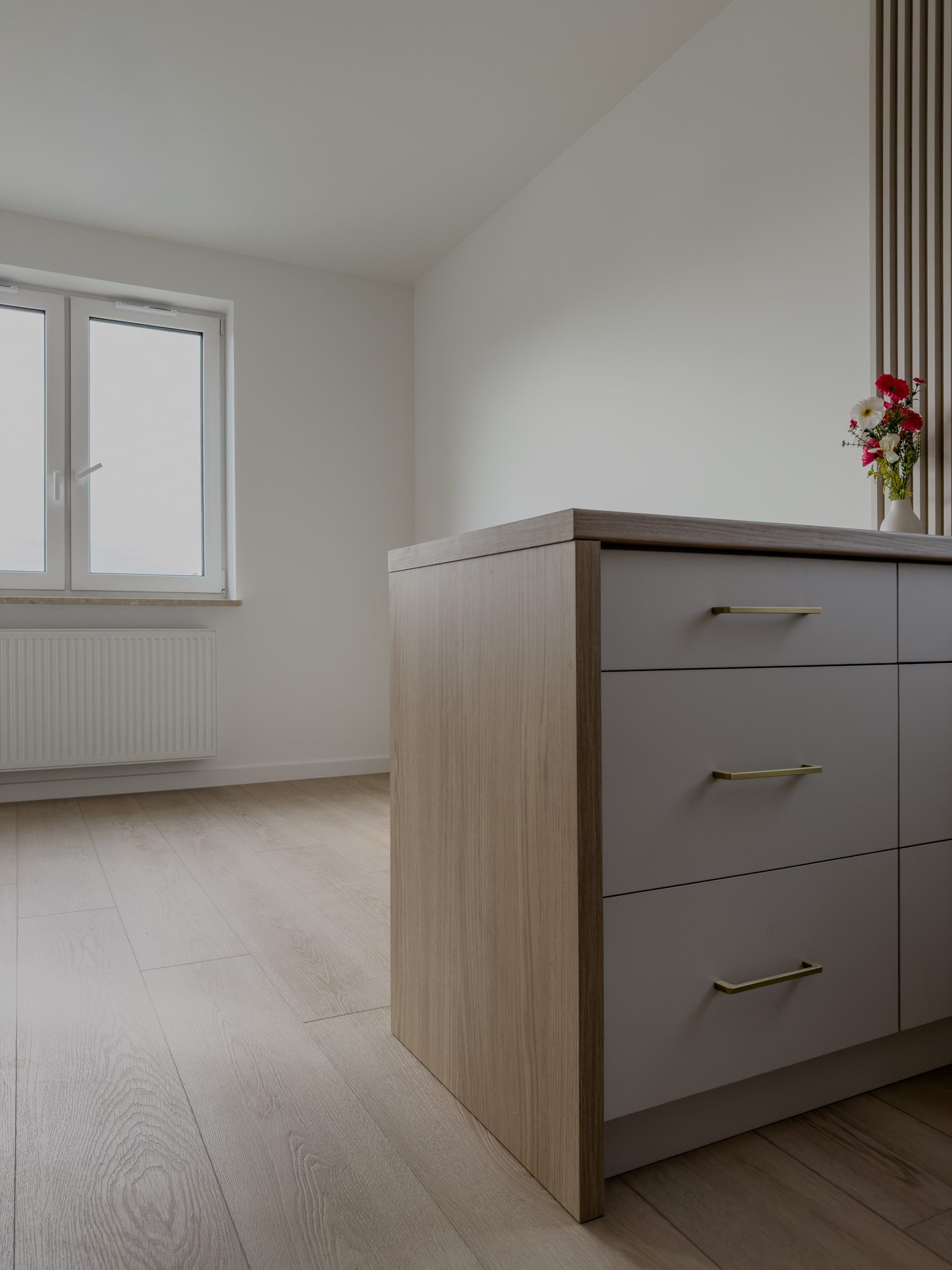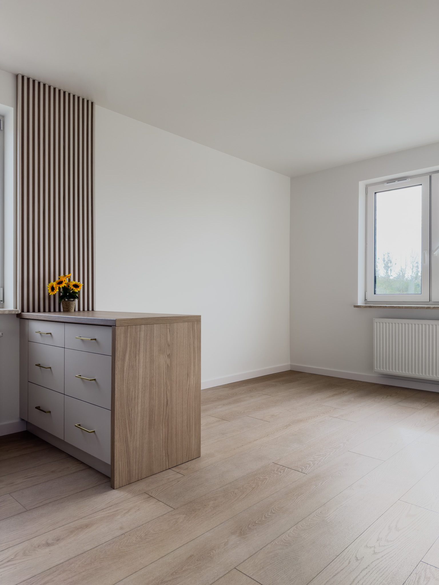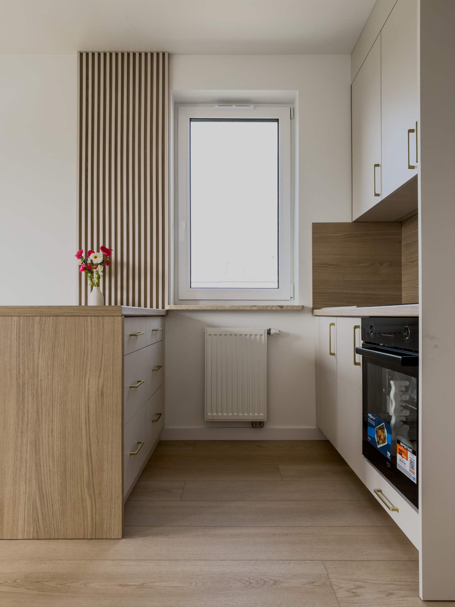 Ciepłe odcienie drewna, złote detale i biel to sposób by stworzyć przestrzeń pełną światła i spokoju. Takie zestawienie barw sprawdza się w niedużych mieszkaniach, dodając im lekkości i harmonii.