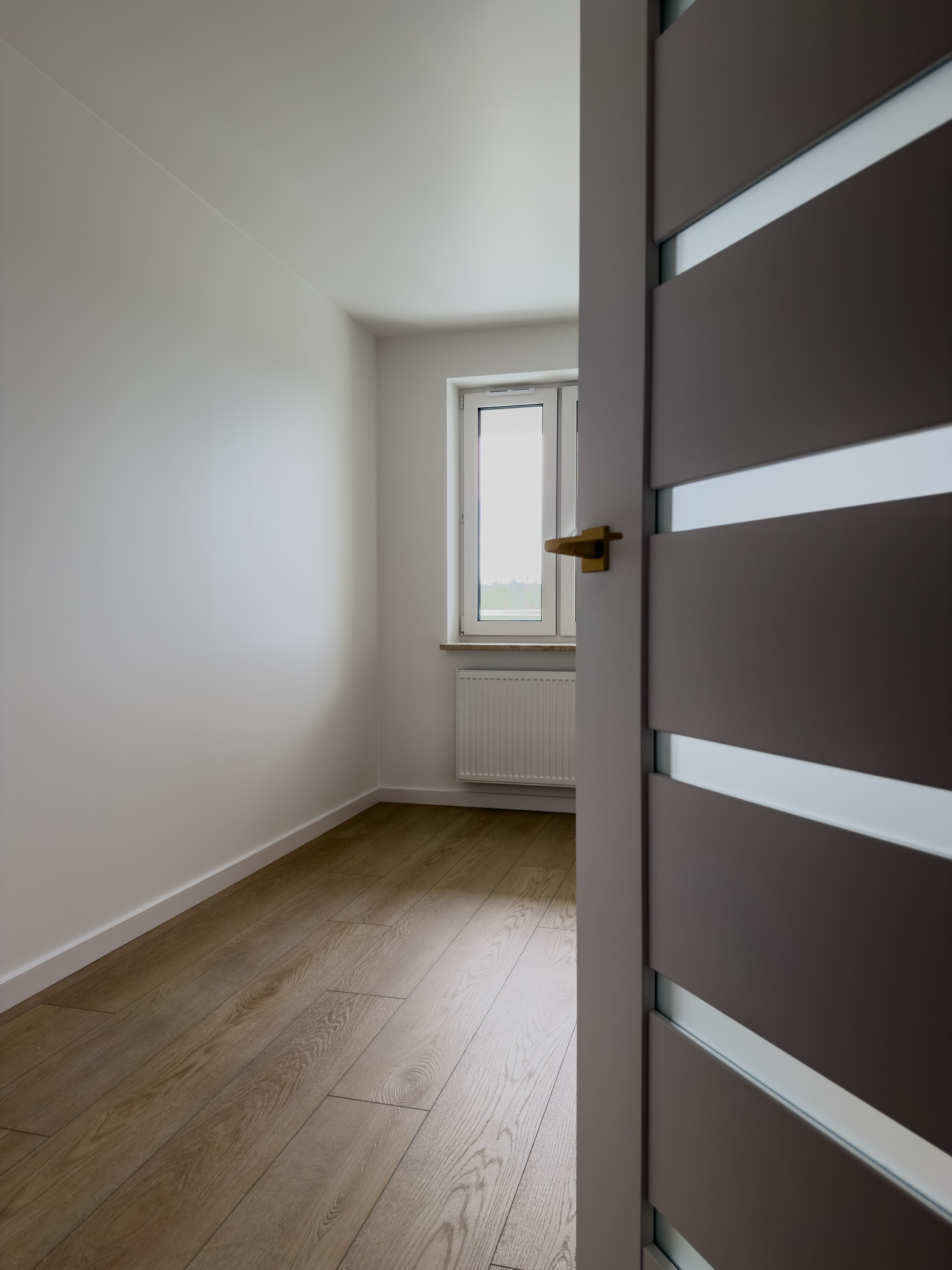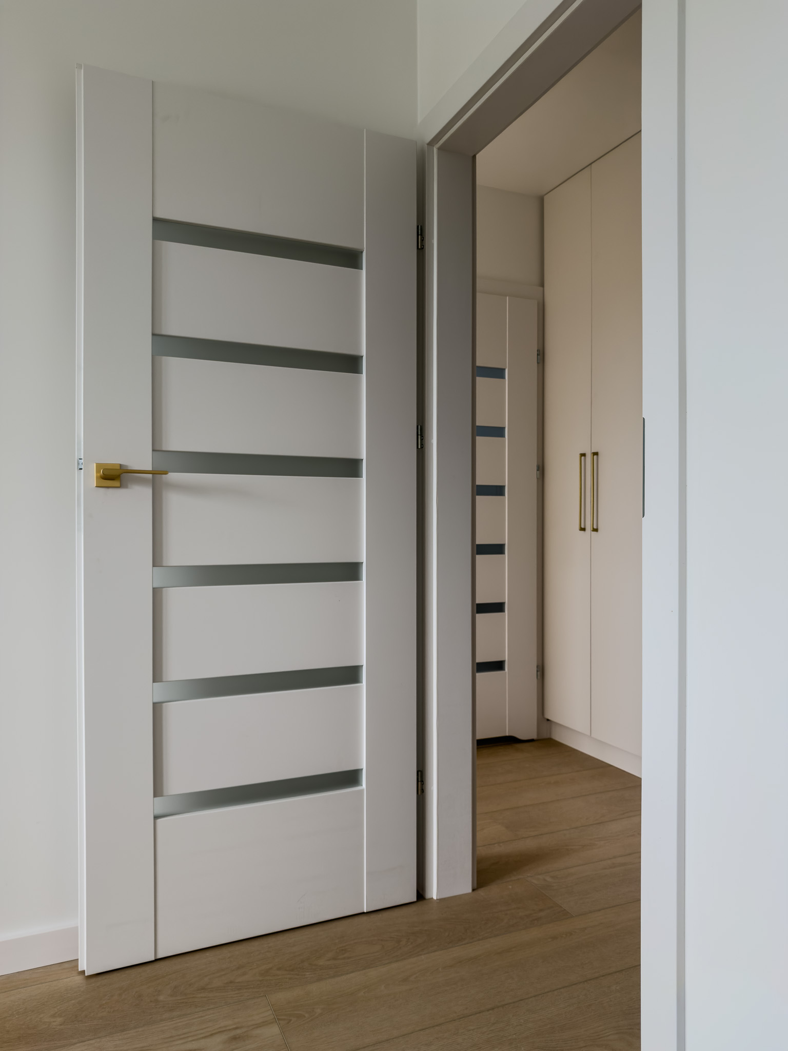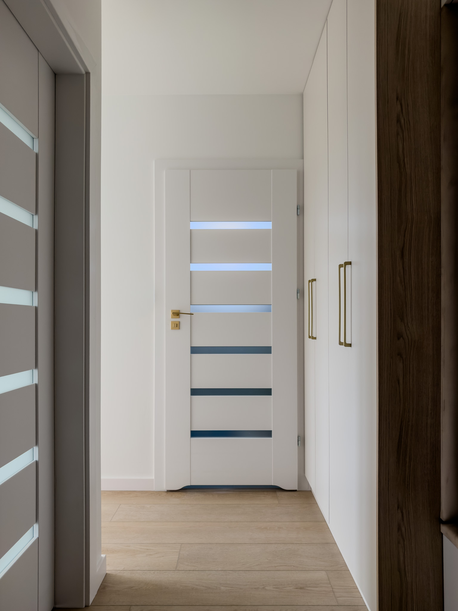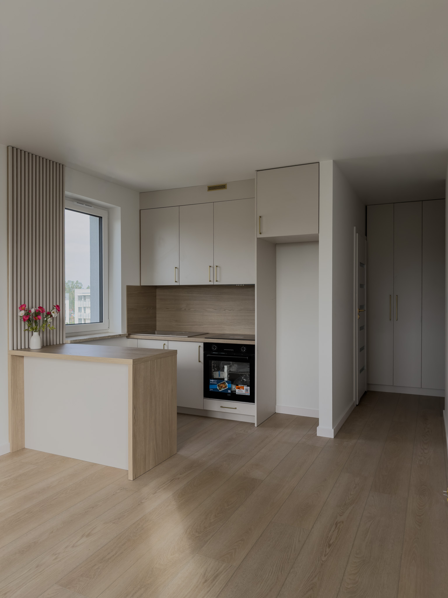 Ciepłe odcienie drewna, złote detale i biel to sposób by stworzyć przestrzeń pełną światła i spokoju. Takie zestawienie barw sprawdza się w niedużych mieszkaniach, dodając im lekkości i harmonii.